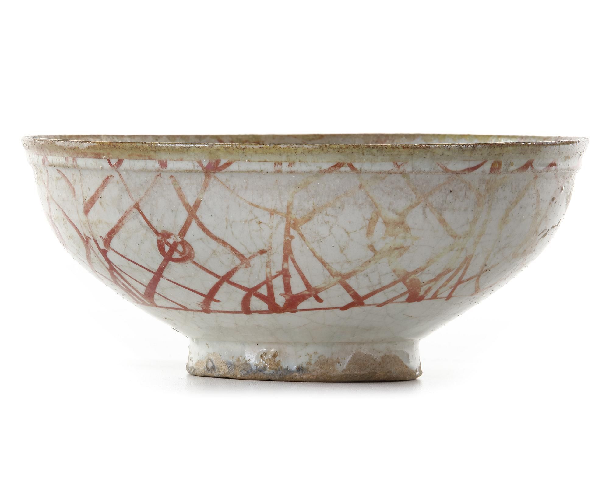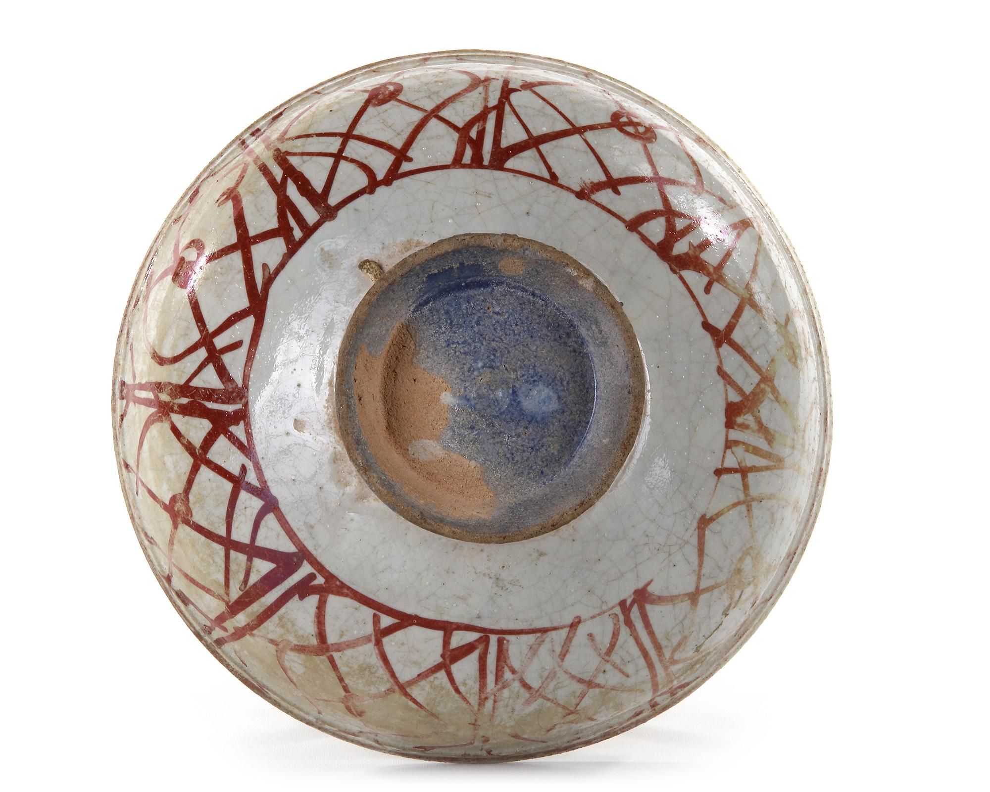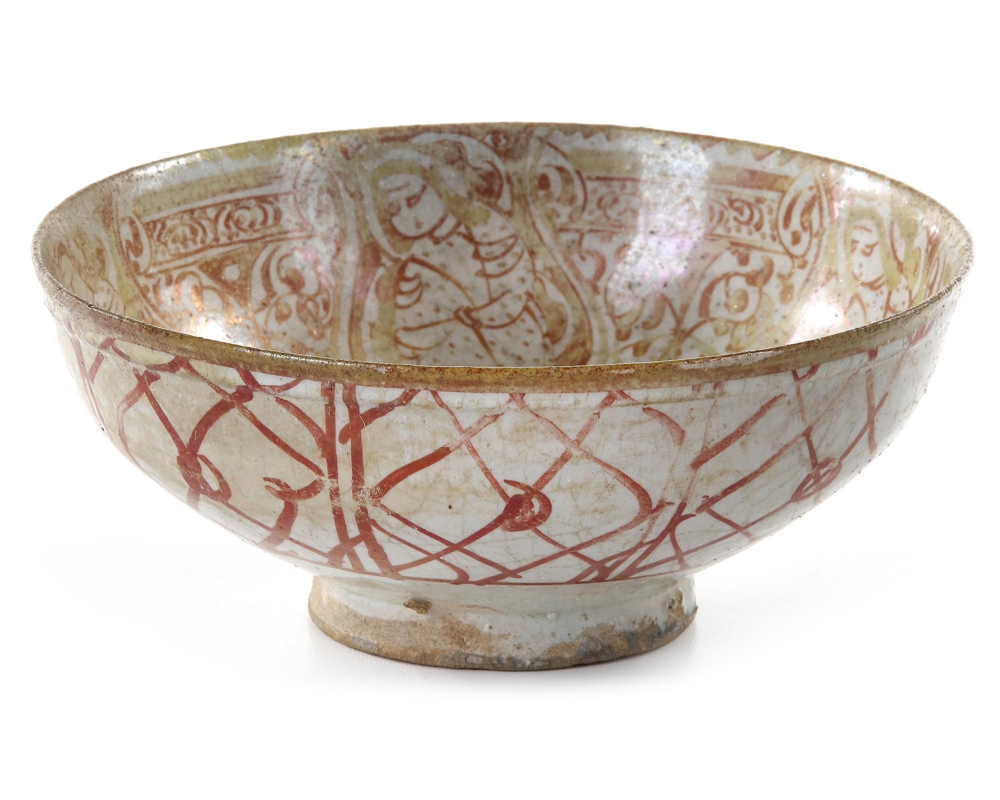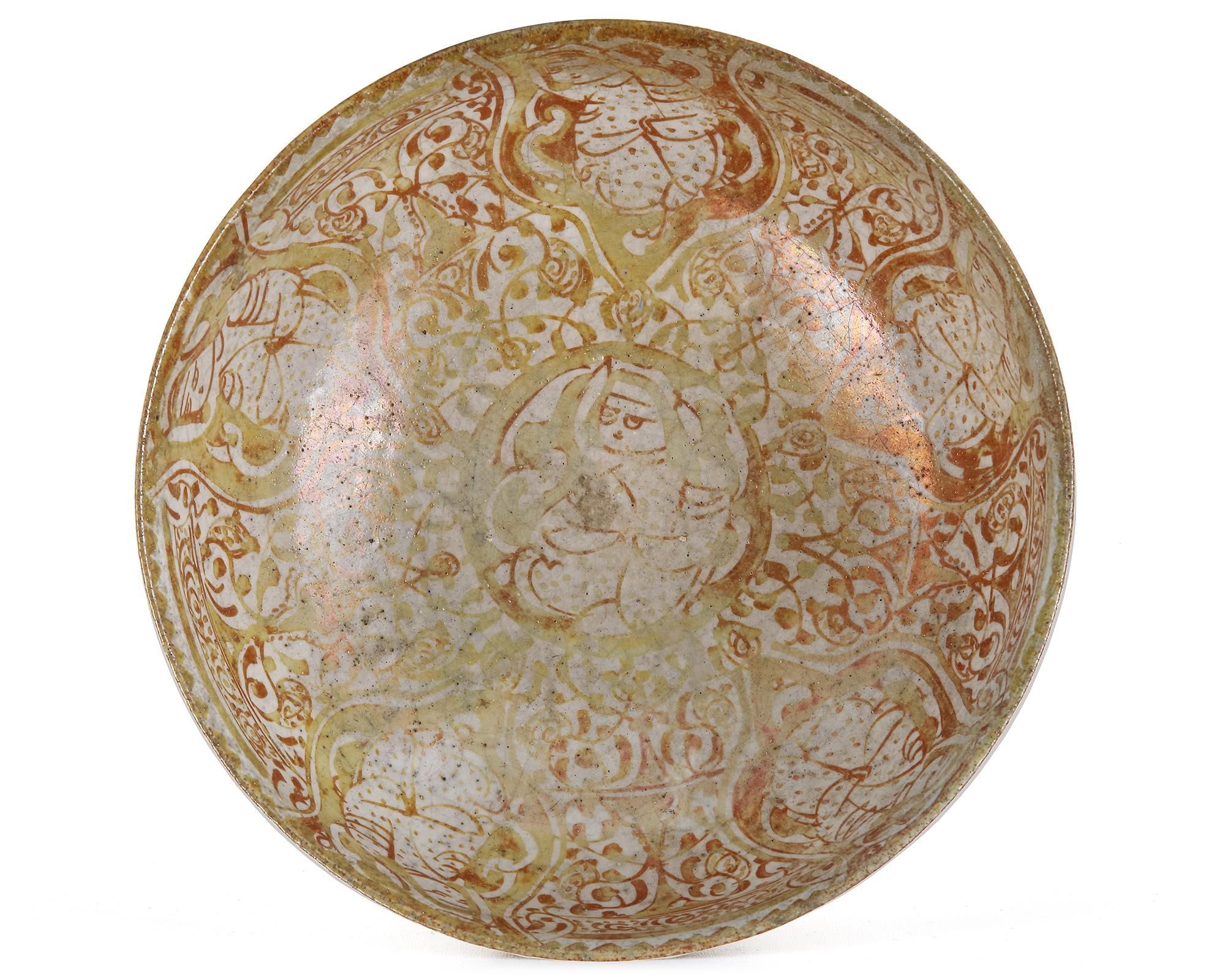 Persian siliceous ceramic bowl with lustrous decoration with metallic reflections on a white background of a frieze of seated figures.