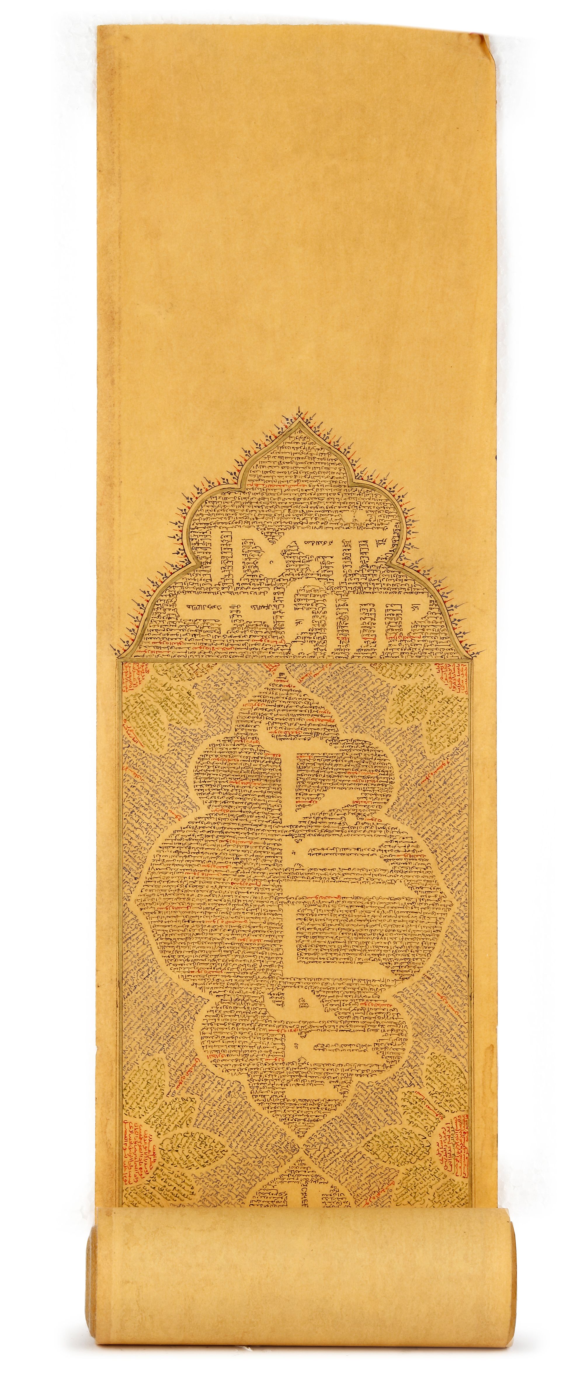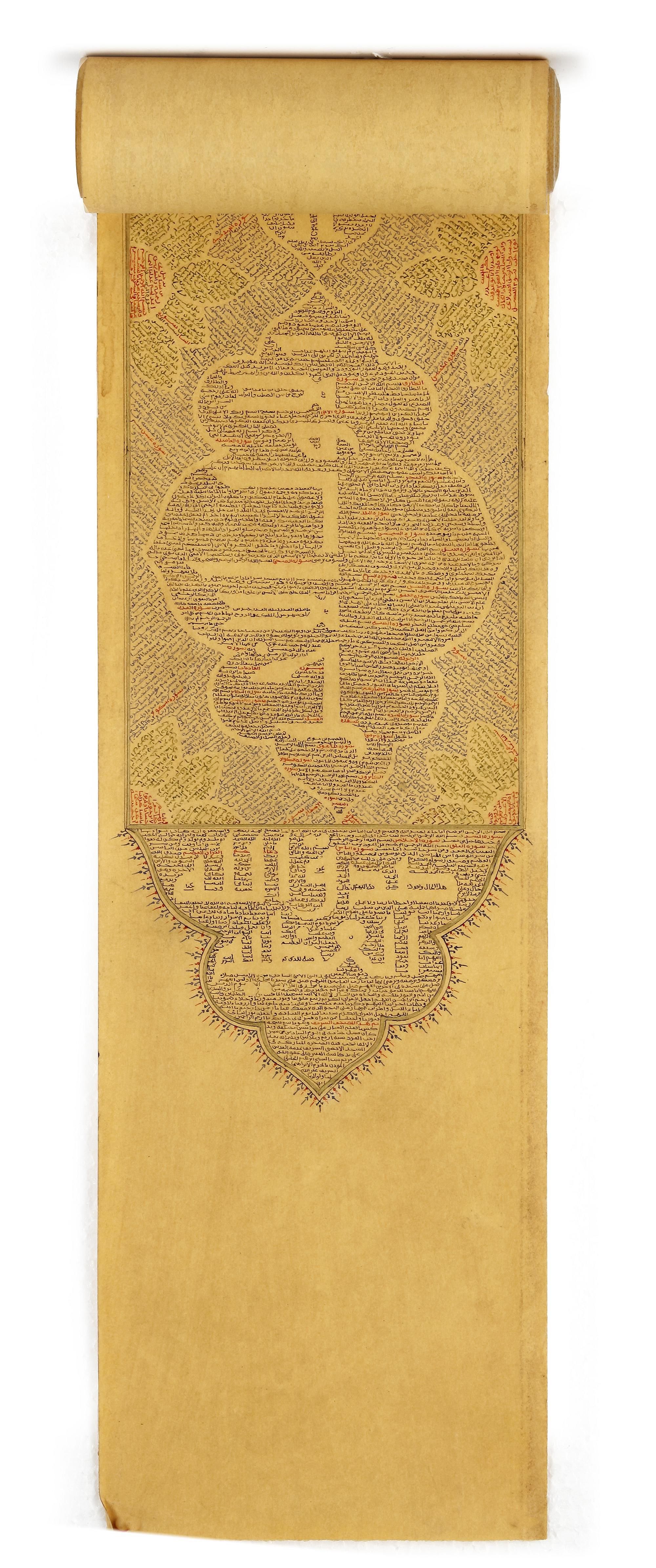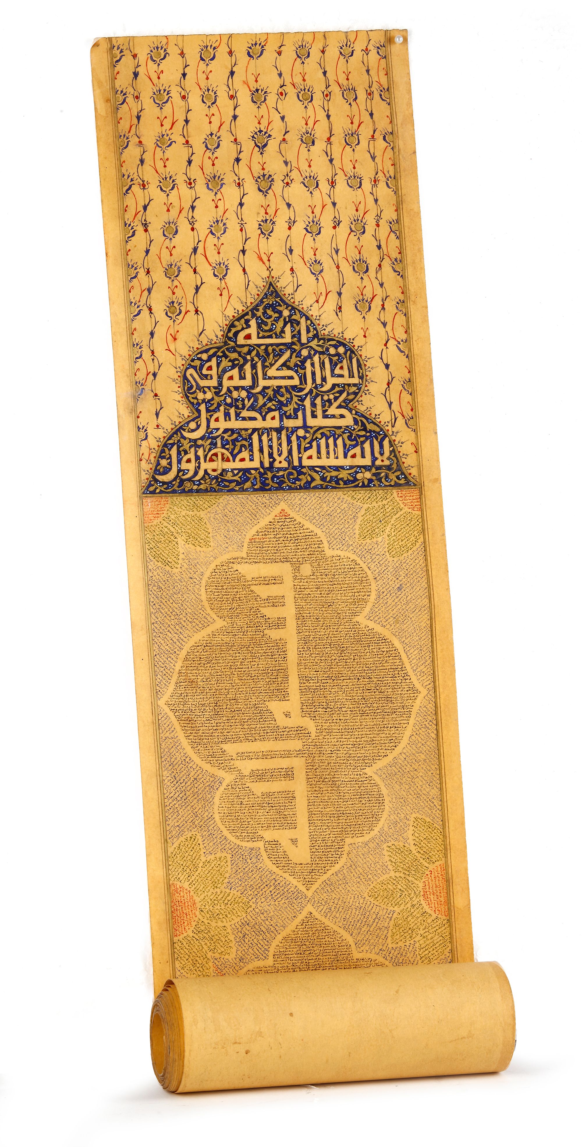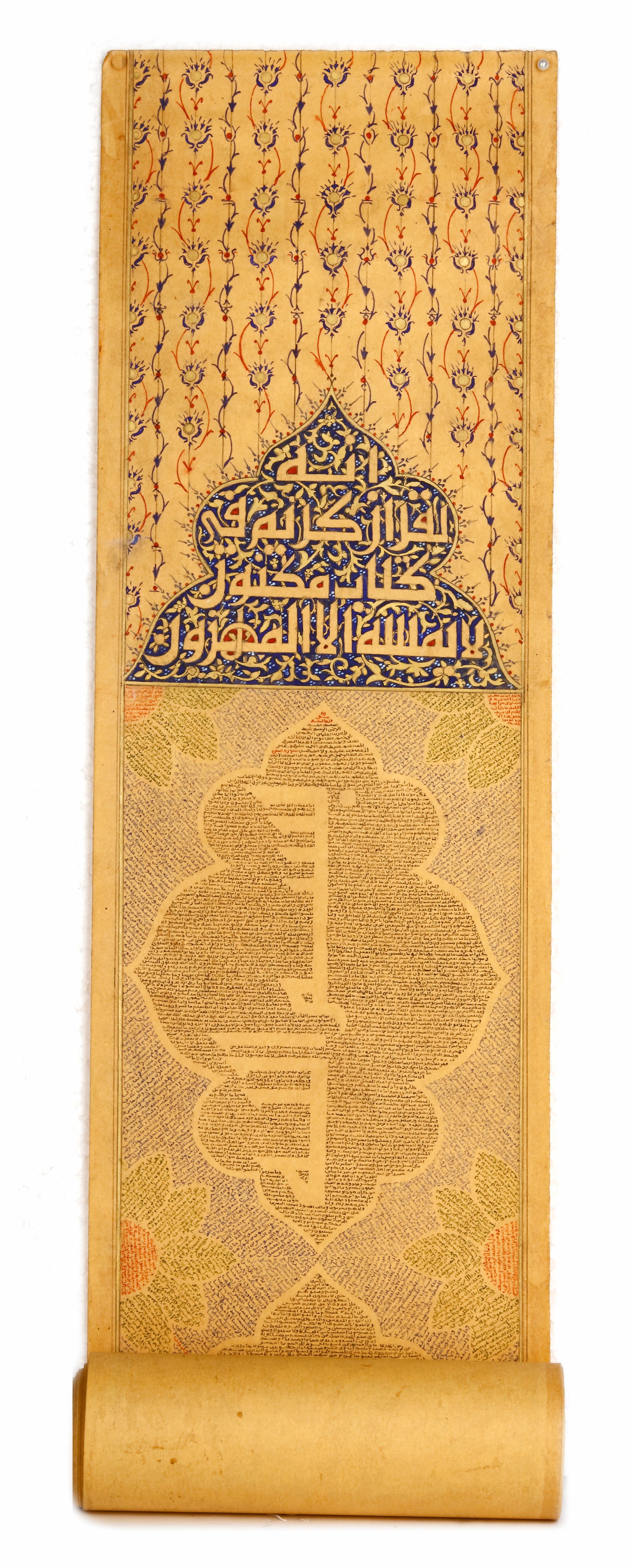 Arabic manuscript on paper, single large leaf written in black and red tiny cursive script without dots, the top with gilt and royal blue decoration, consists of cartouches containing the complete Quran with the names of Allah in reverse style and formed in Kufic script.