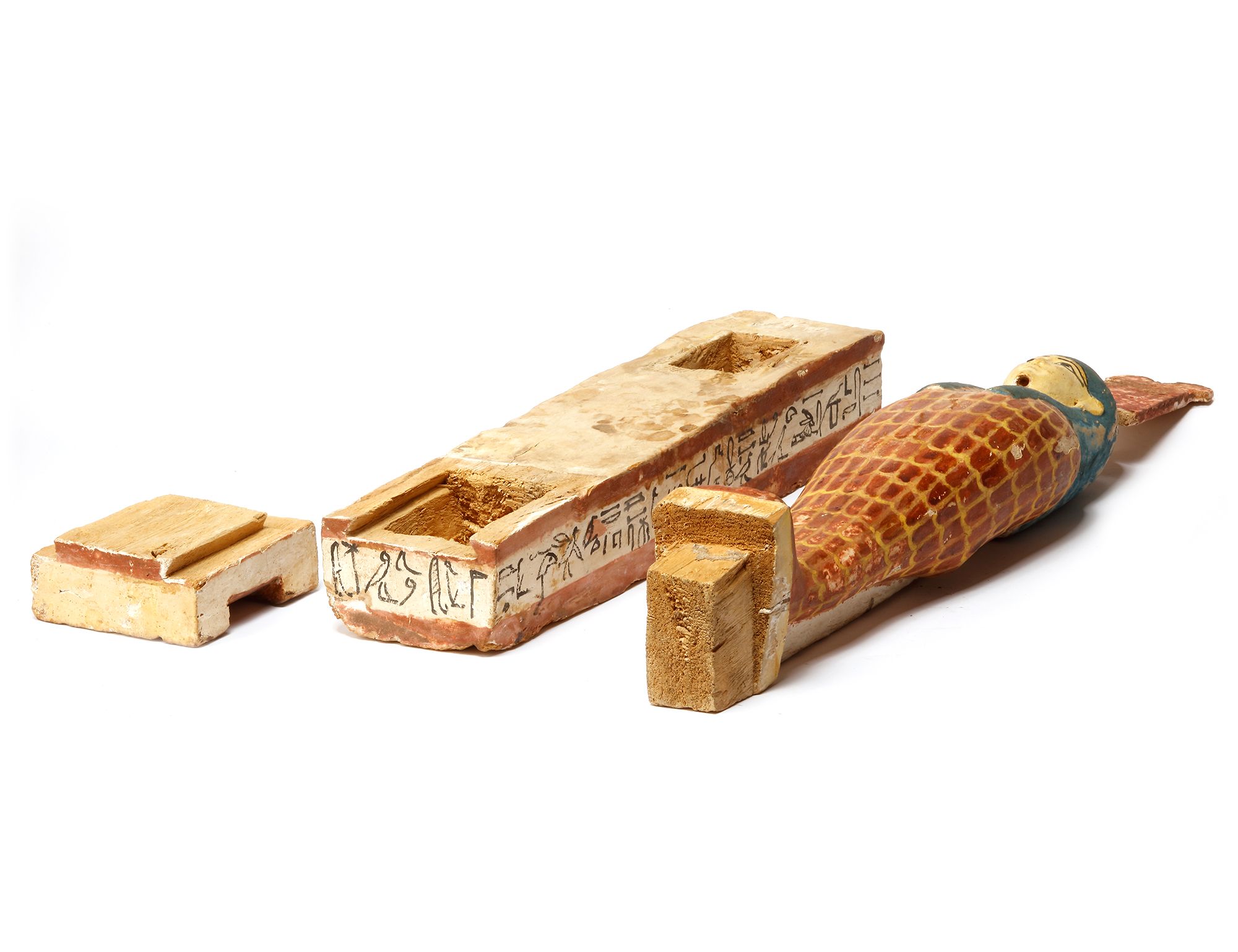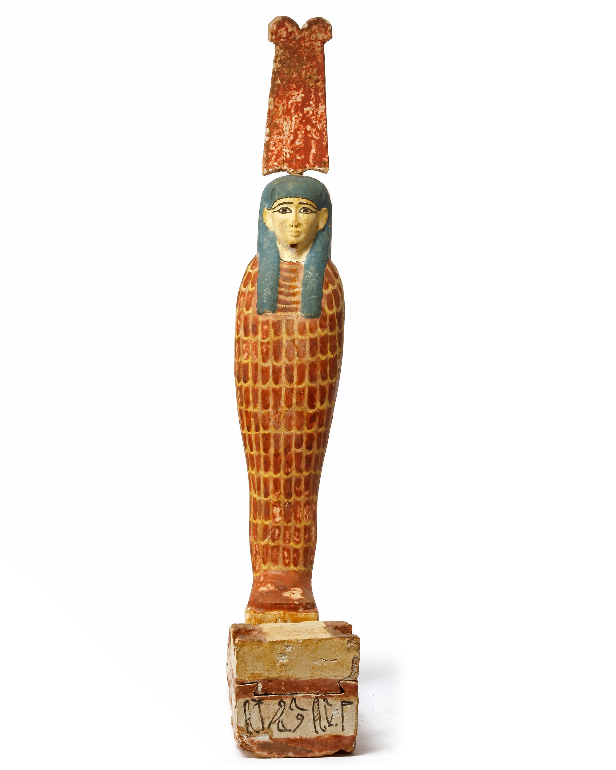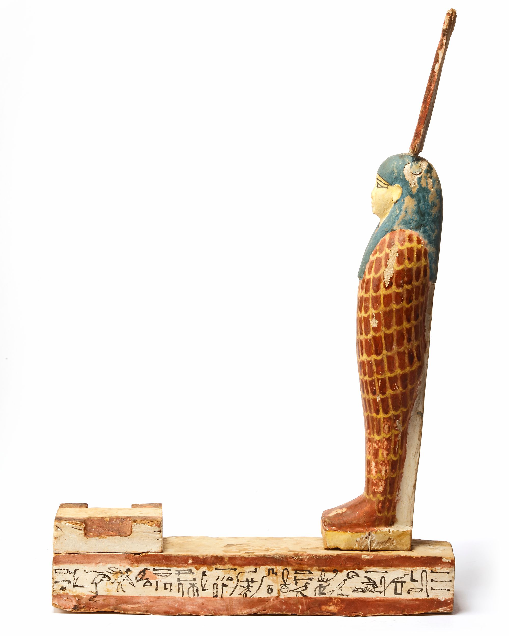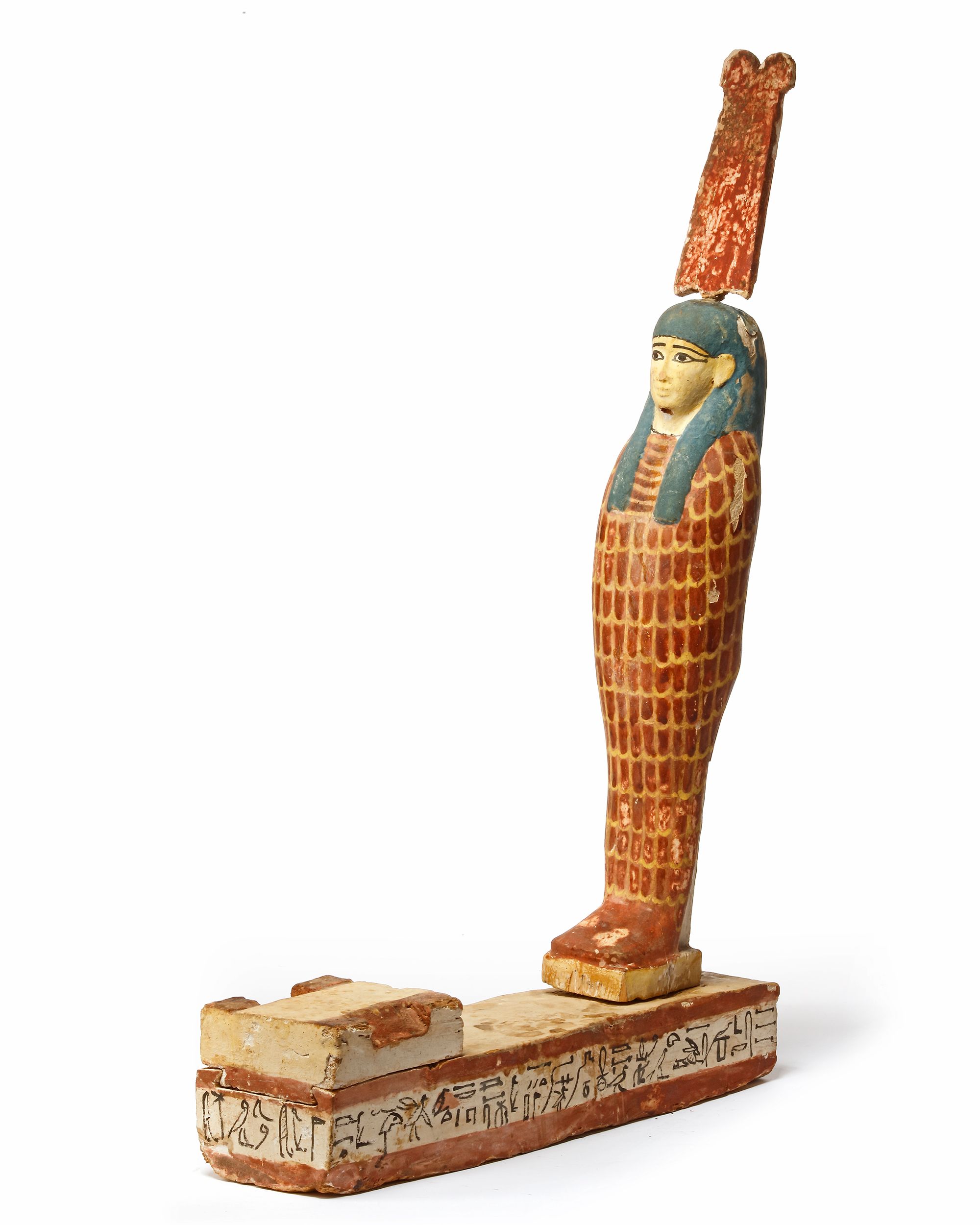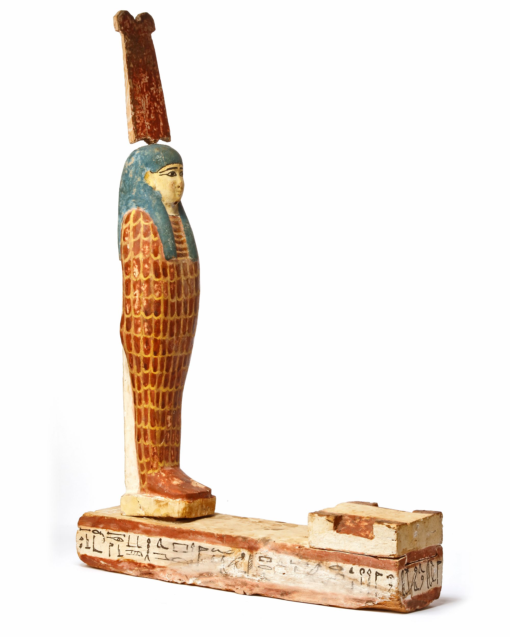 The mummiform figure with the body polychrome painted in a maroon and yellow feathering pattern, the yellow face with black details, wearing a blue tripartite wig, standing on a rectangular plinth with a hollow compartment and lid, wearing a separately made plumed headdress, a column of text down the back pillar inscribed, 'Hail to you, heir, who proceeded from this god, Spittle which proceeded from Atum divine....', the sides of the plinth inscribed with a protective prayer '...the great god has come forth from primeval waters for the Osiris wab-priest of Isis-who-is-before the army, wab-priest of Sobek Horwedja, son of the like-titled Nespantyhwtnetjer, born of the Lady of the house Tanetpashefy'.