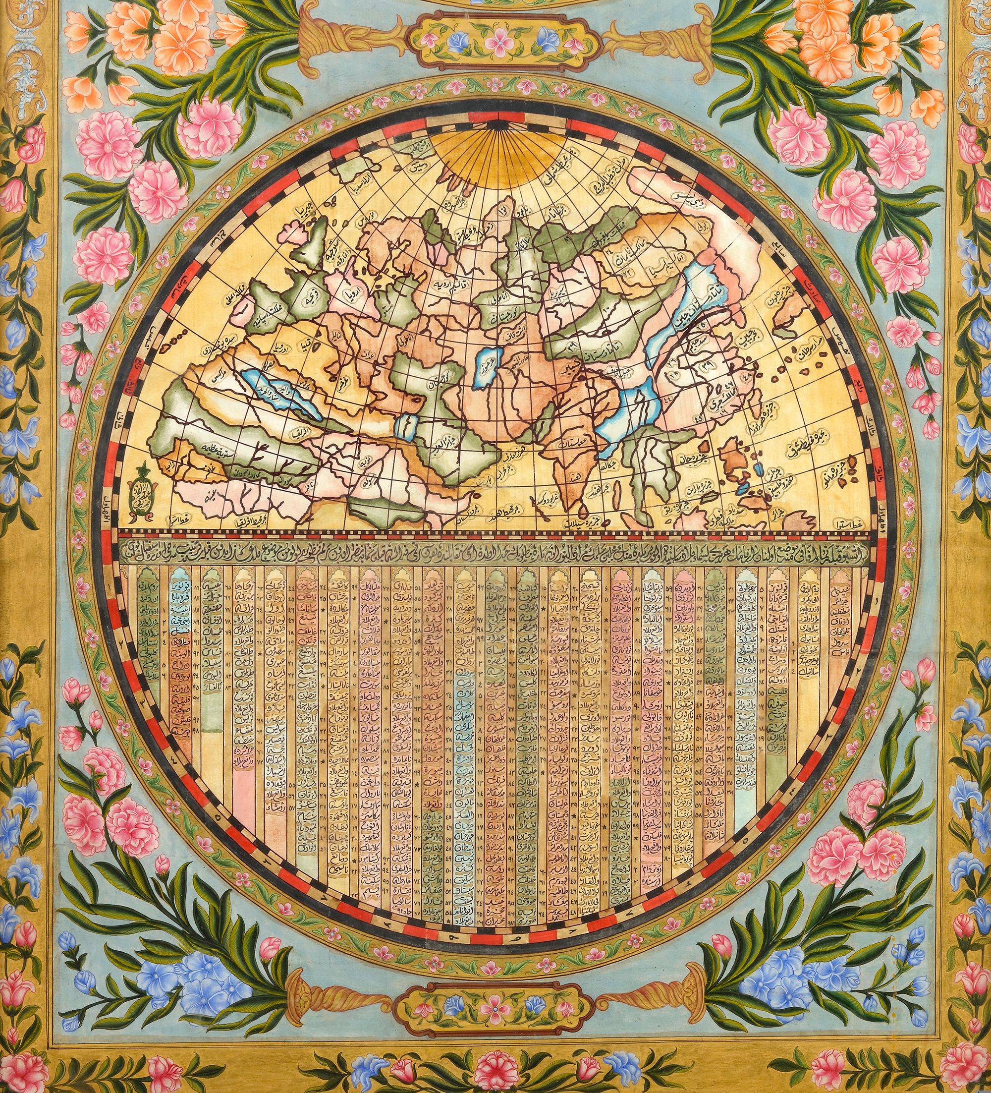 This qibla finder map in a wooden frame, dated 1764/65 AD, is modeled after the original series of Qiblafinders, invented and made by Baronyan (Bārūn al-Mukhtariʽ) some 30 years earlier.