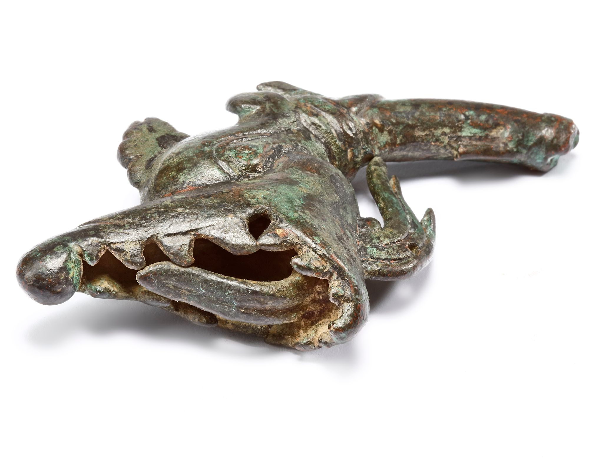 Possibly from an ‘ alam, in the form of a dragon’s head cast in the round and engraved with a pattern of scales on the head. 9 cm. height