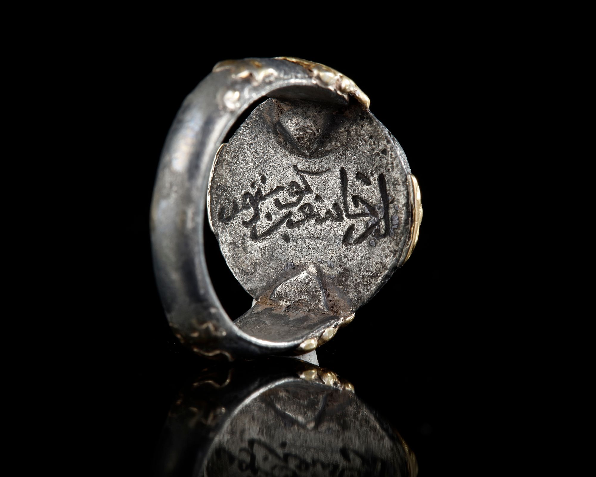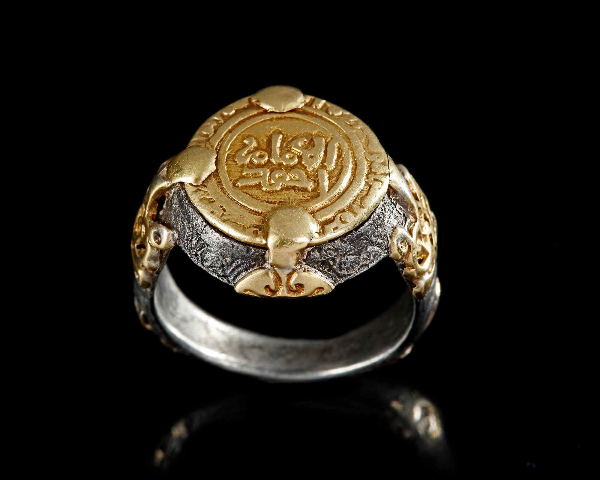 A gold dinar with a cursive inscription within a gold border with arabesque design and shank with applied palmettes. Height: 2.1 cm. Weight:7 gr.