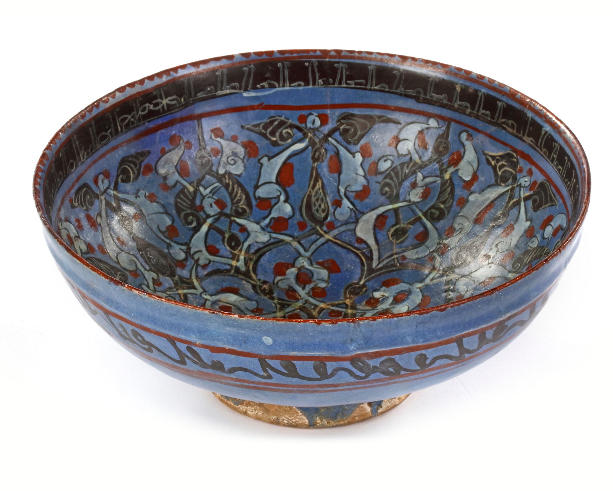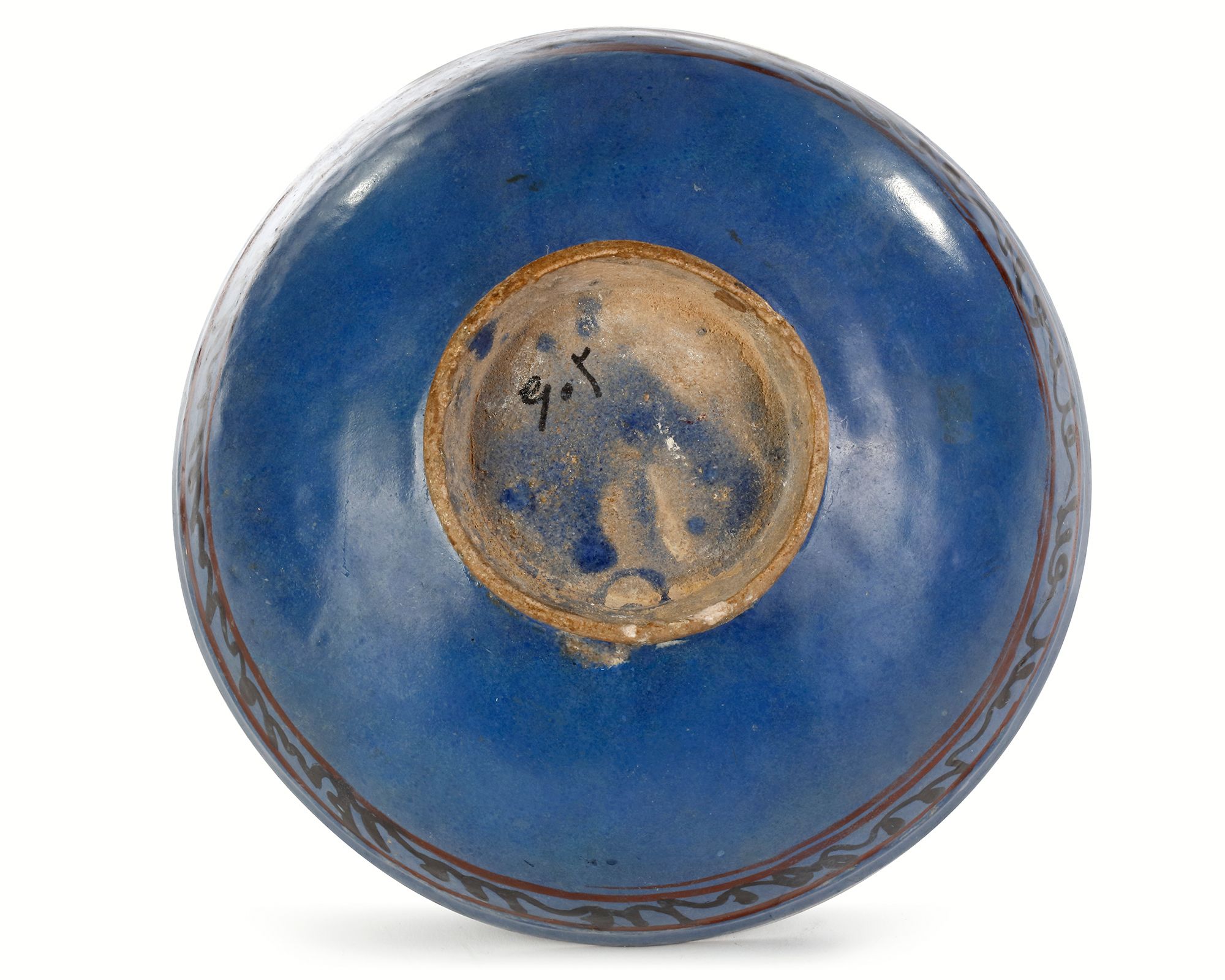 Of rounded form on a splayed foot, decorated in polychrome on a blue ground with a six-petaled lotus to the centre surrounded by an interlace of split-palmettes, a band of pseudo-kufic to the rim, a further band of pseudo inscription to the exterior.