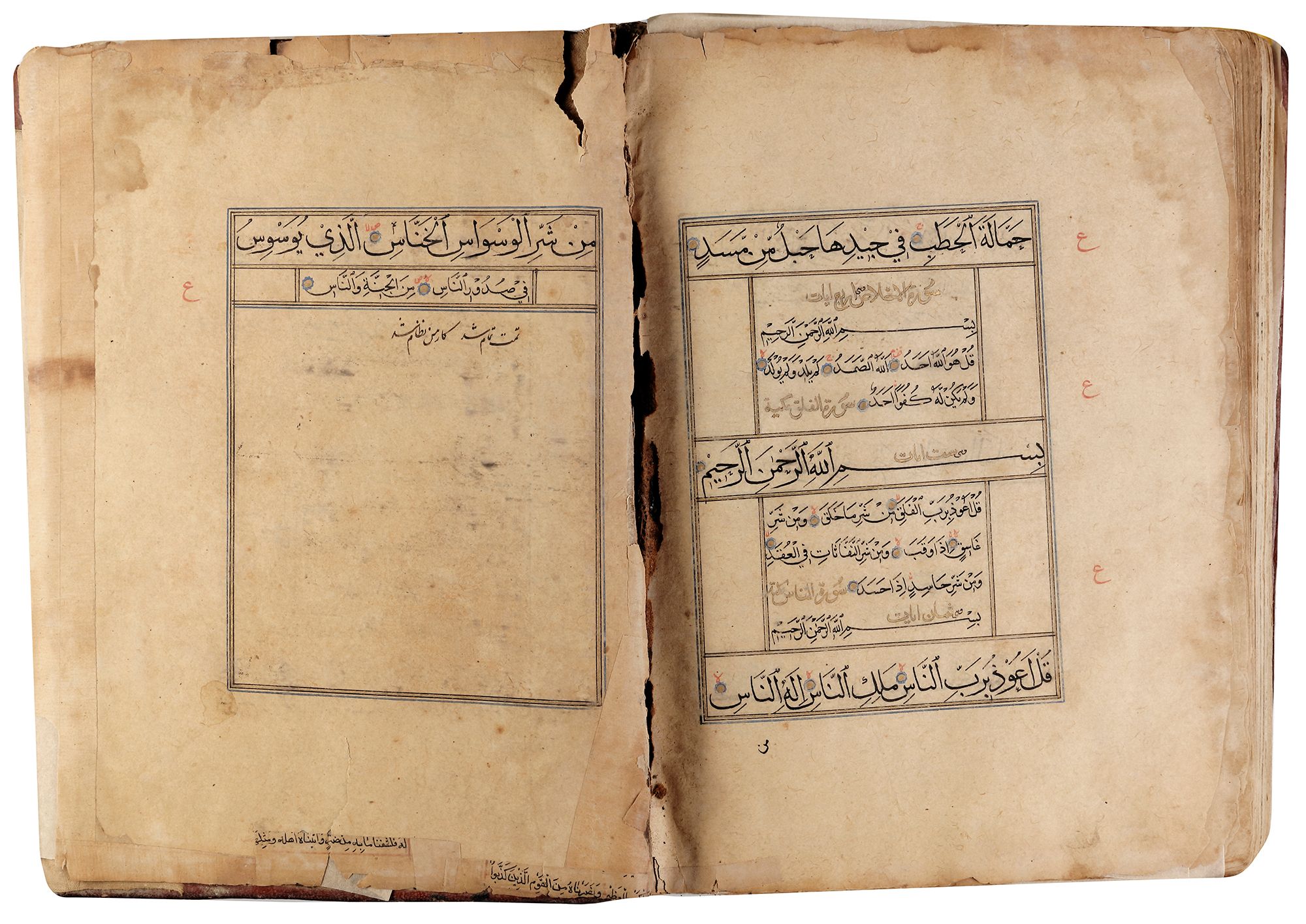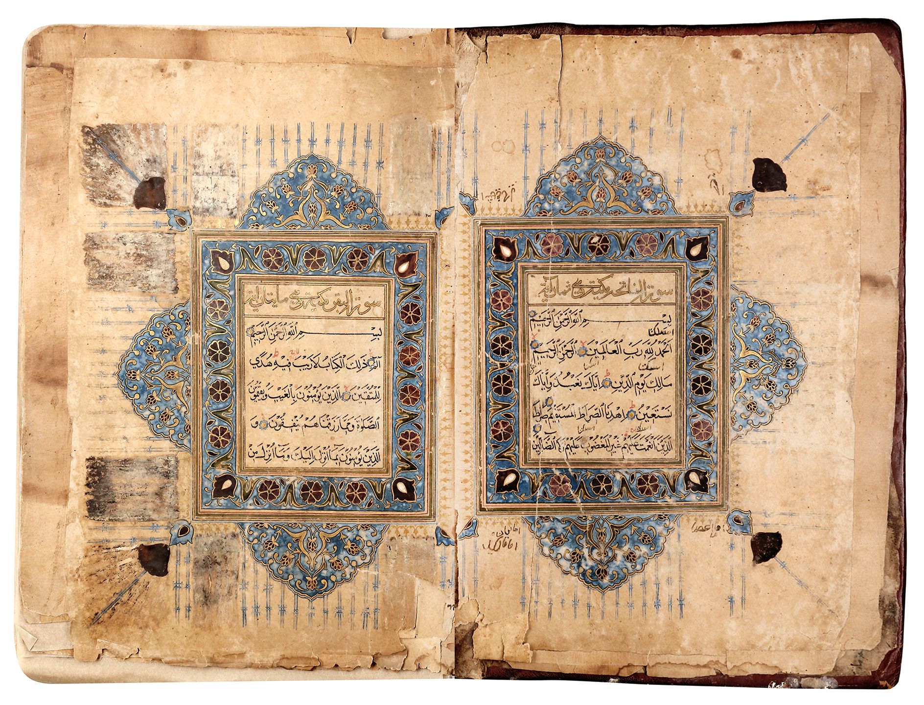 Folio 1b-2a bearing the text of Surah al-Fatiha with the first five verses from surah al-Baqraa within fully illuminated panels with royal gold and blue decoration.
