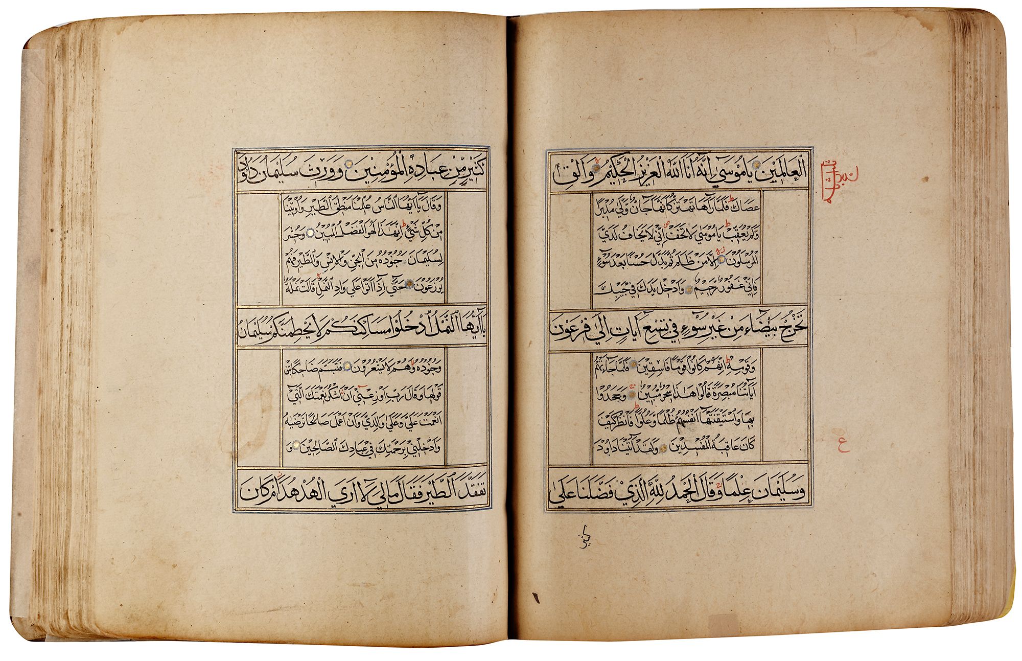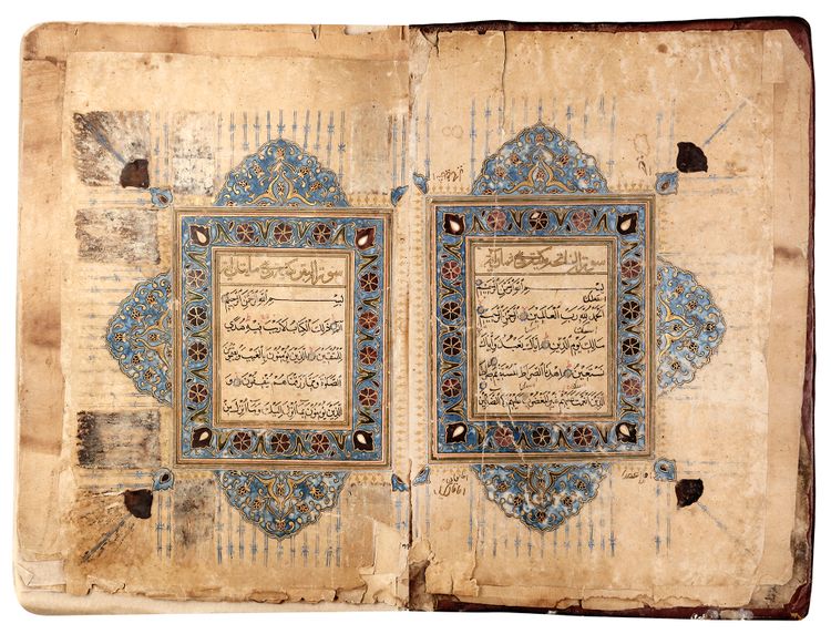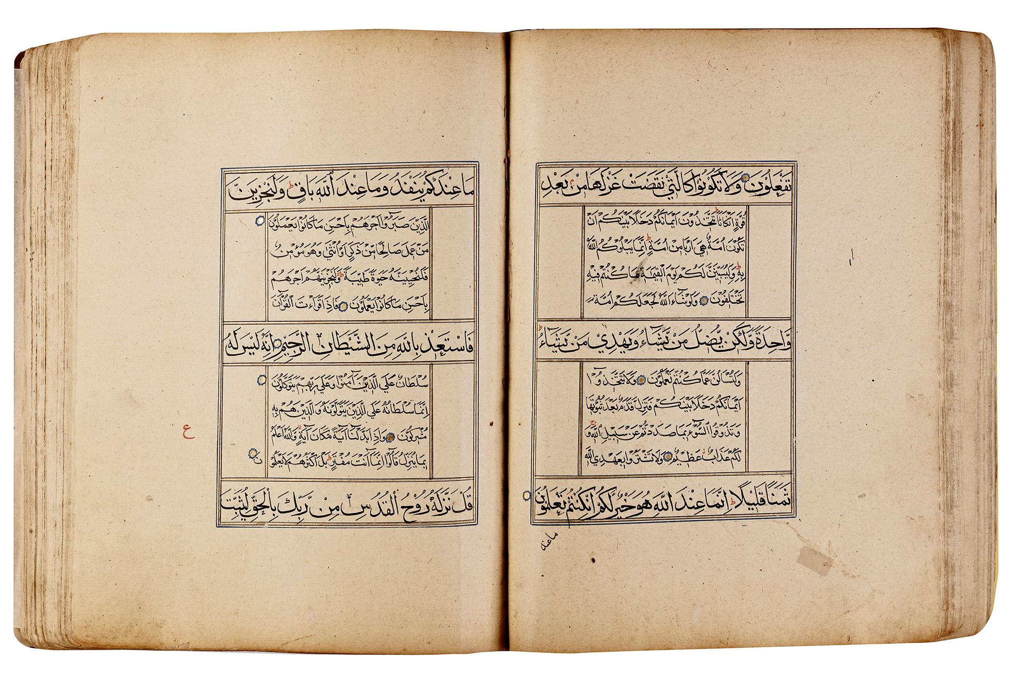 Each page with 3 lines in large elegant black muhaqqaq script and 8 lines in black smaller naskh script, surah headings ( name of the surah and the numbers of the verses) written in gold thuluth script outlined in black, text ruled in blue and gold borders, gold verse markers pointed in blue, diacritics and vowels in red ink, occasional marginal notes indicating "nisf juz and juz" in red ink.