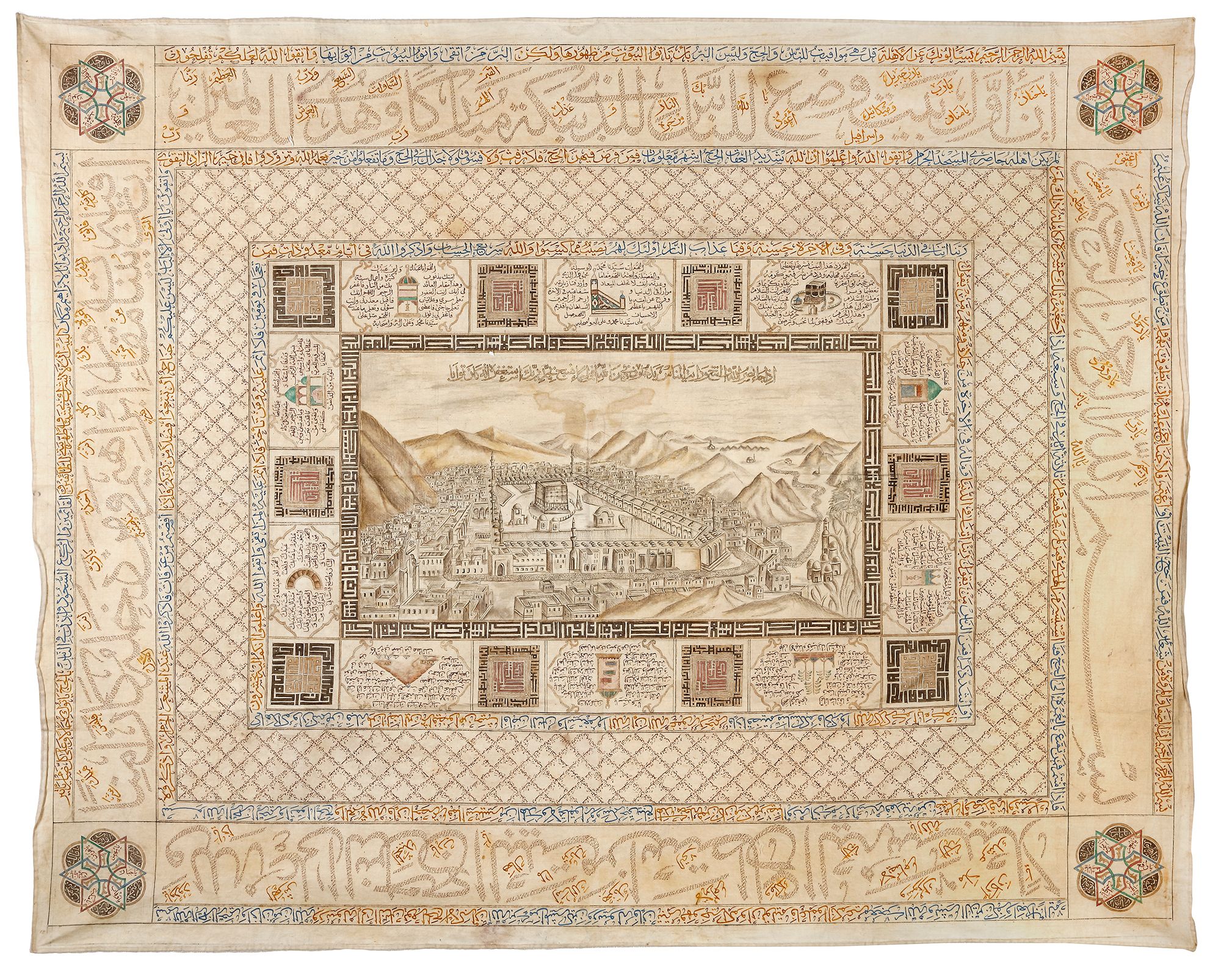 To the centre a large vieuw of Mecca with al-Masjid al-Haram with surah Al-Nasr at the top, surrounded by Dua'a al-Talbiyah in Kufic script. Further borderd by a band containing cartouches and squares with verse from the Quran an prayers.