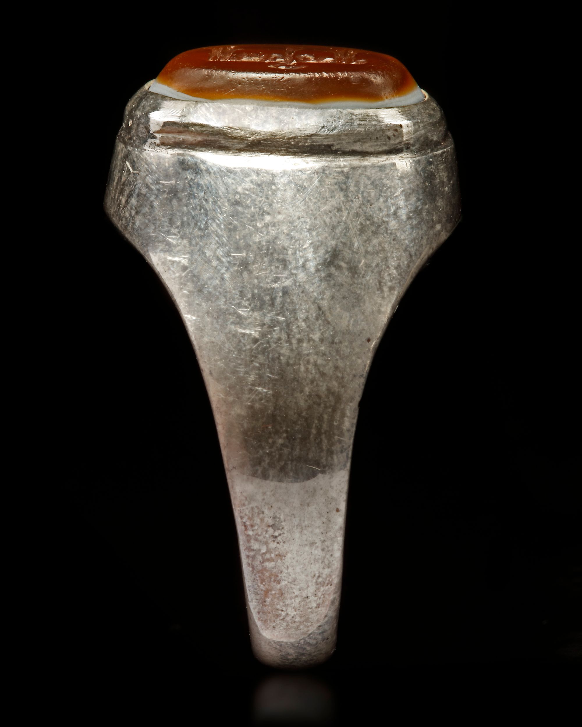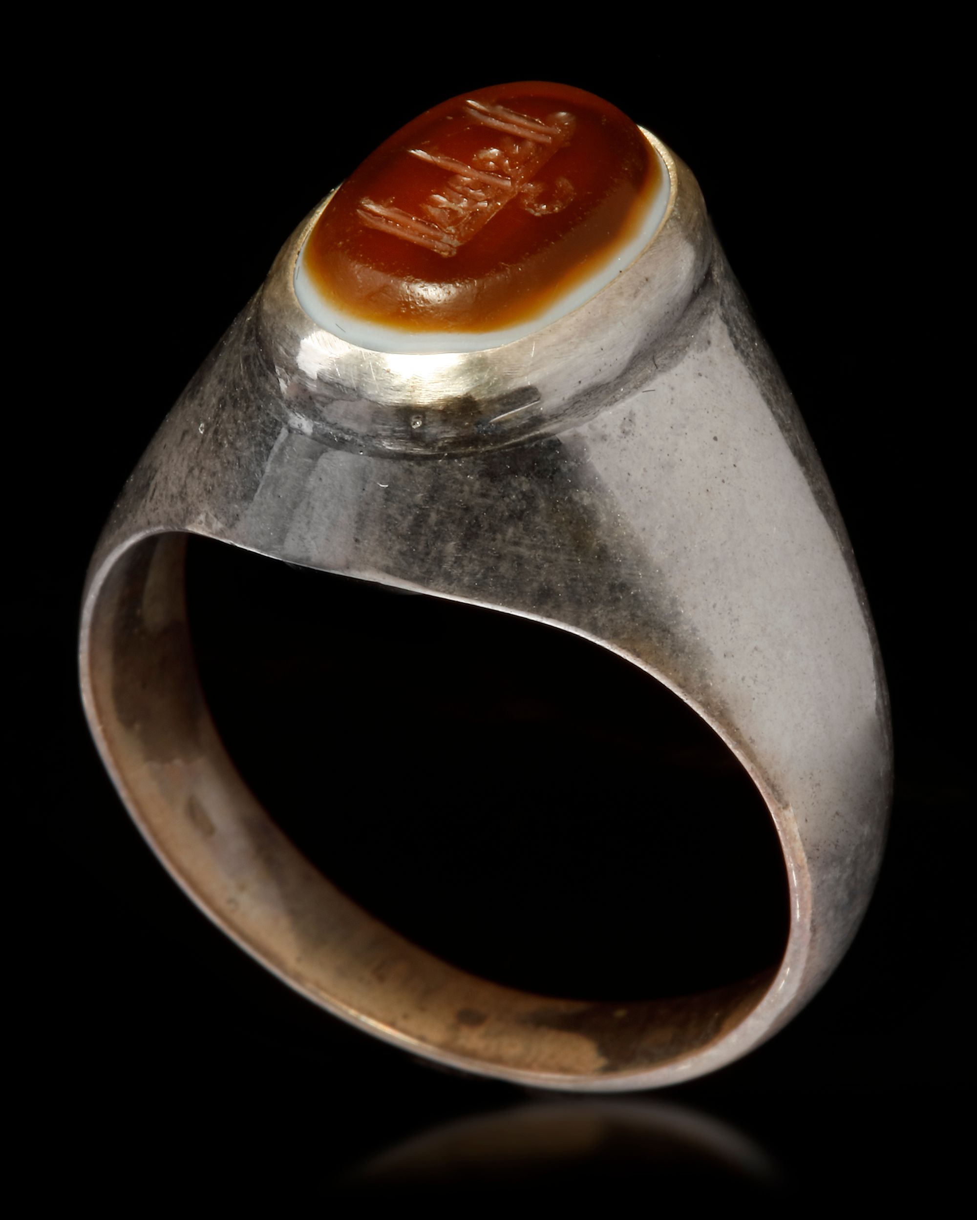 An agate seal of rounded shape, set in silver ring and engraved with the text "جعفر ولي الله ,Jafar Wali Allah "in naskh script.