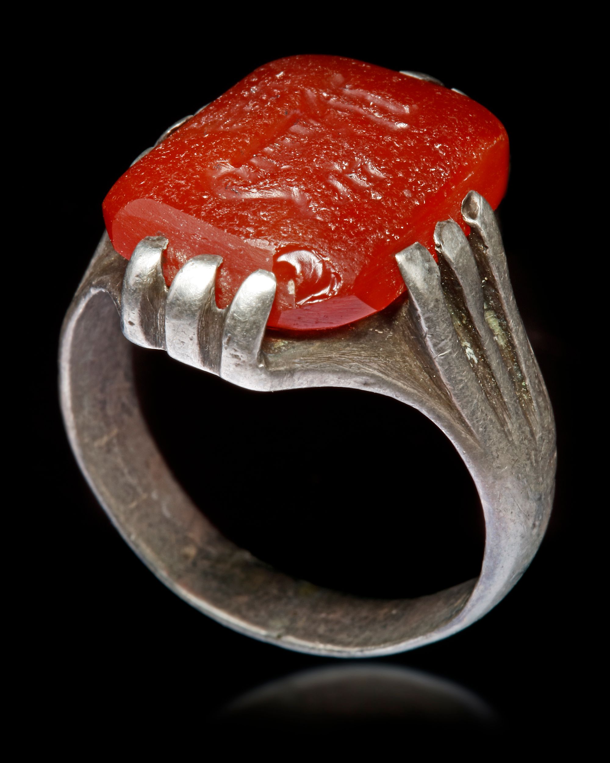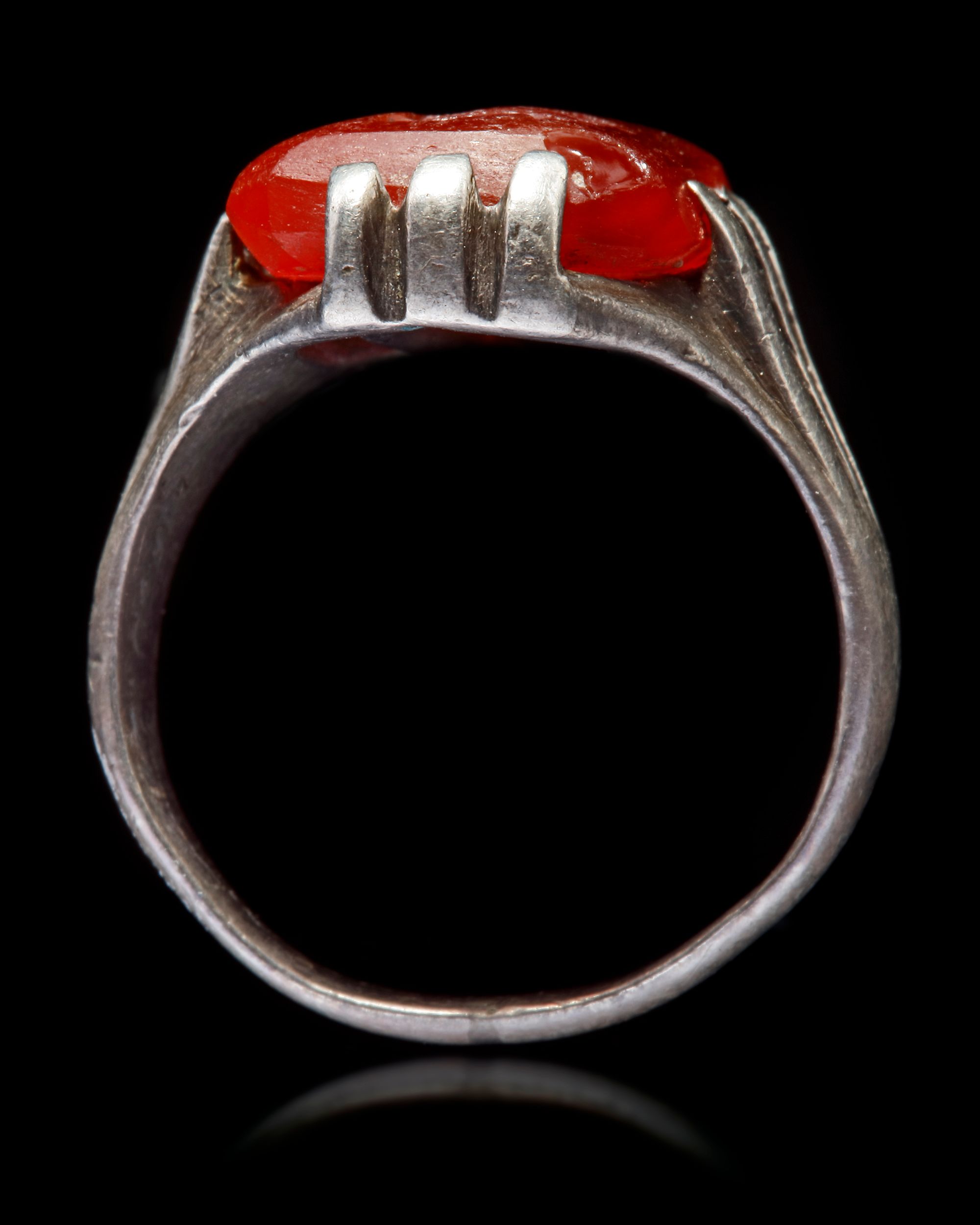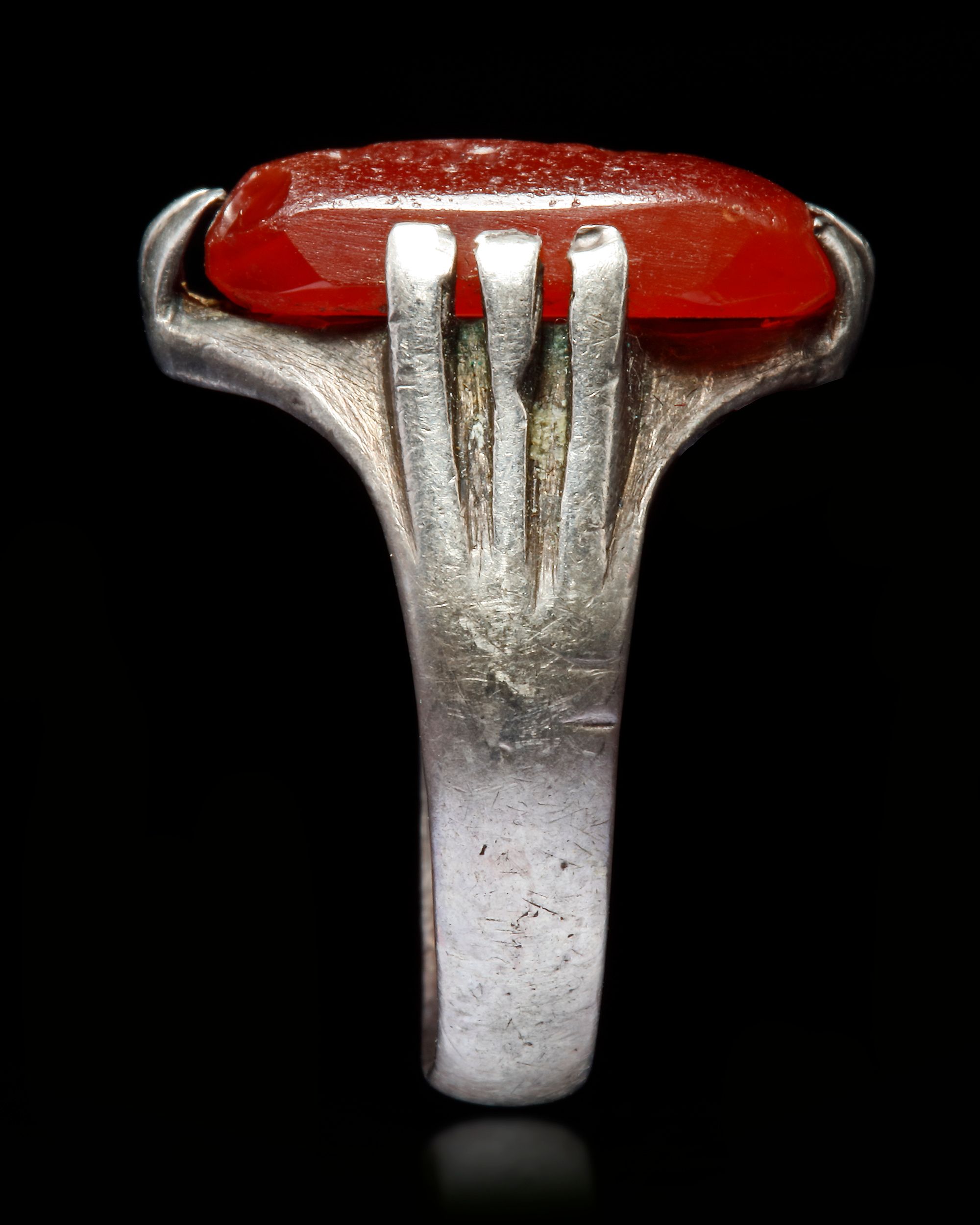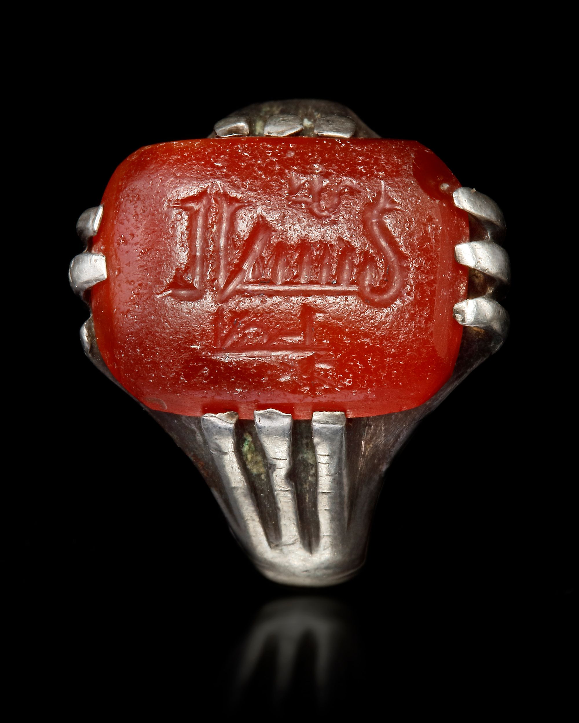 An agate seal of oval shape, set in a silver ring with claws and engraved with the text   "الحسين بن الفضل,  Al-Hussein bin Al-Fadl  " in kufic script.