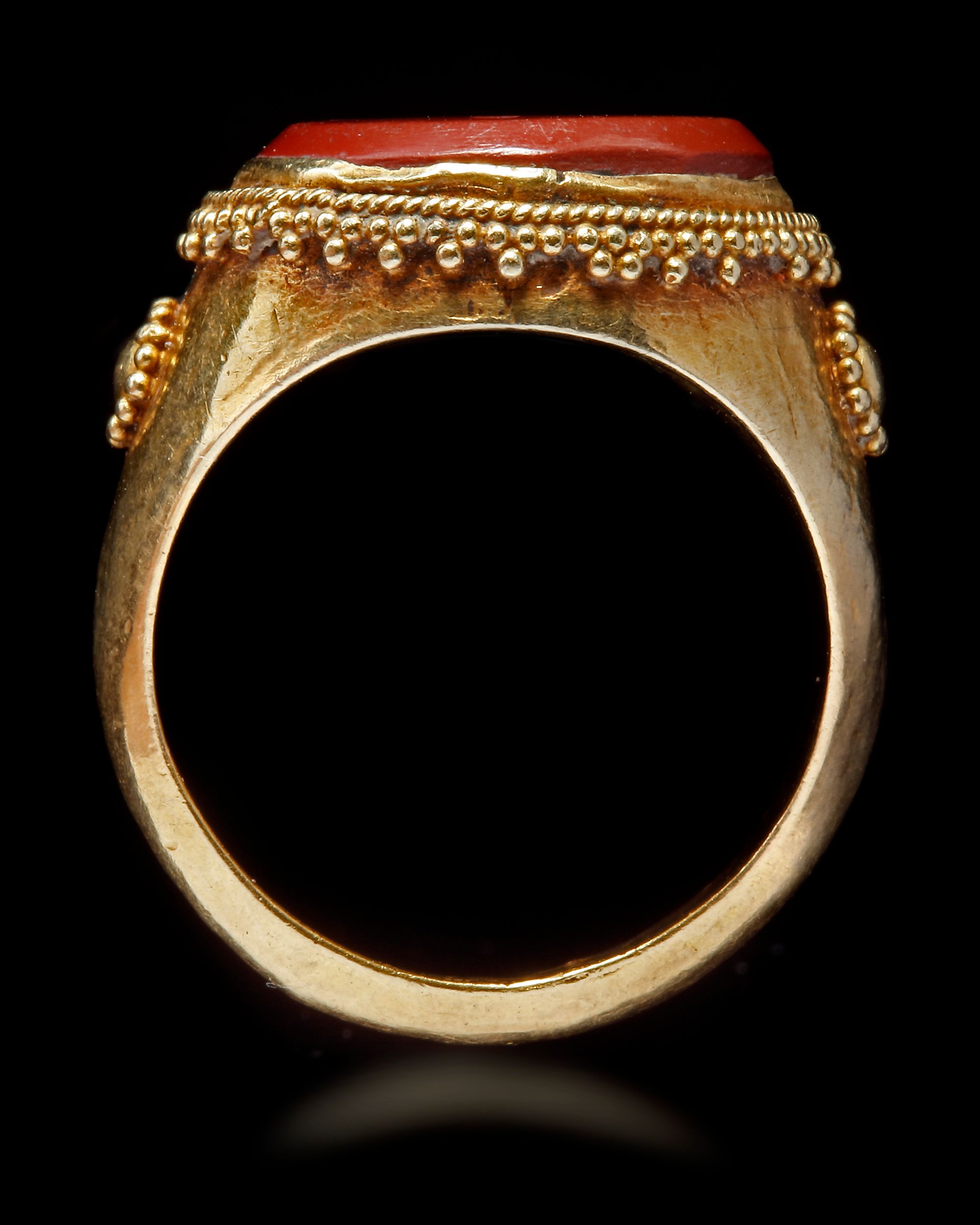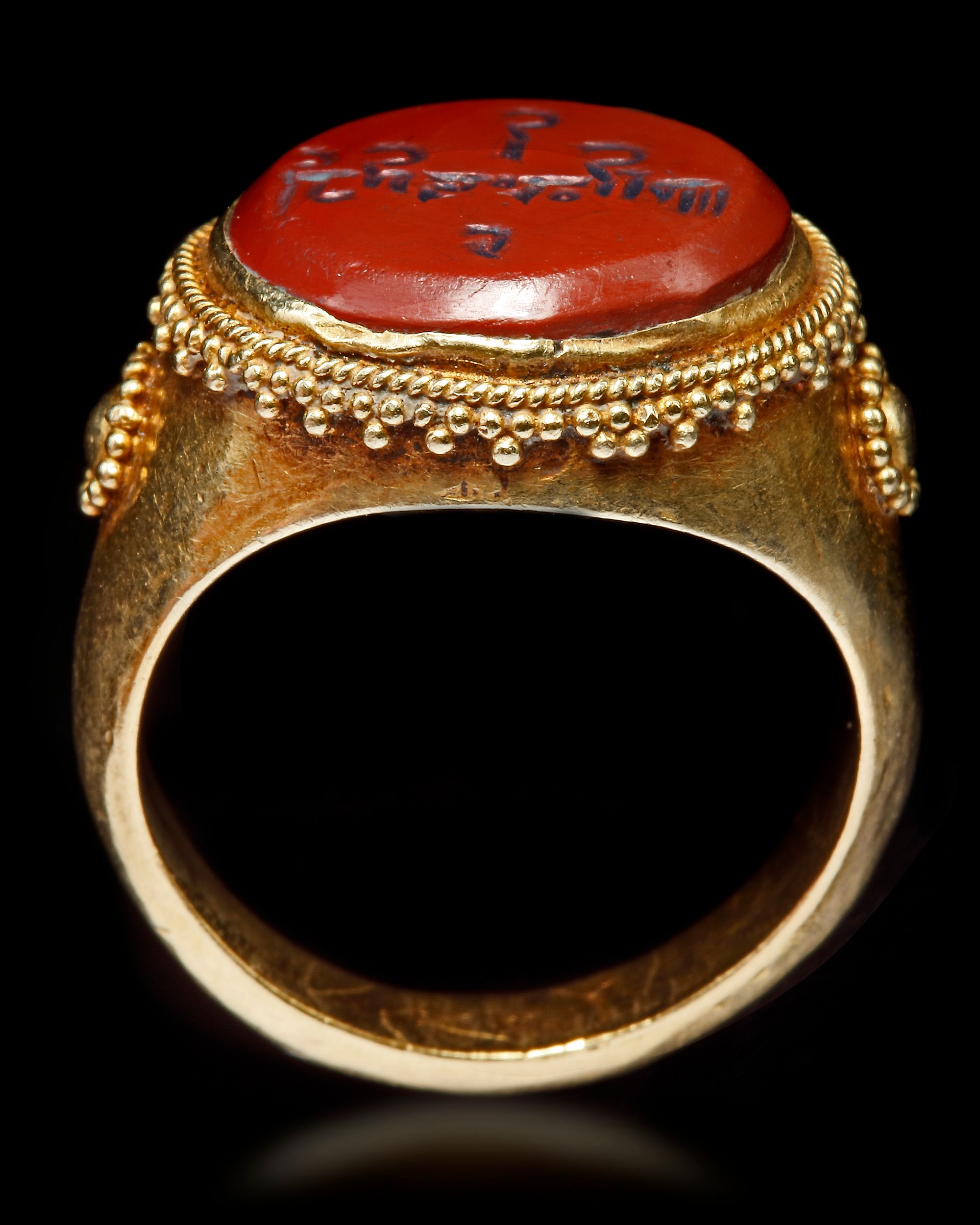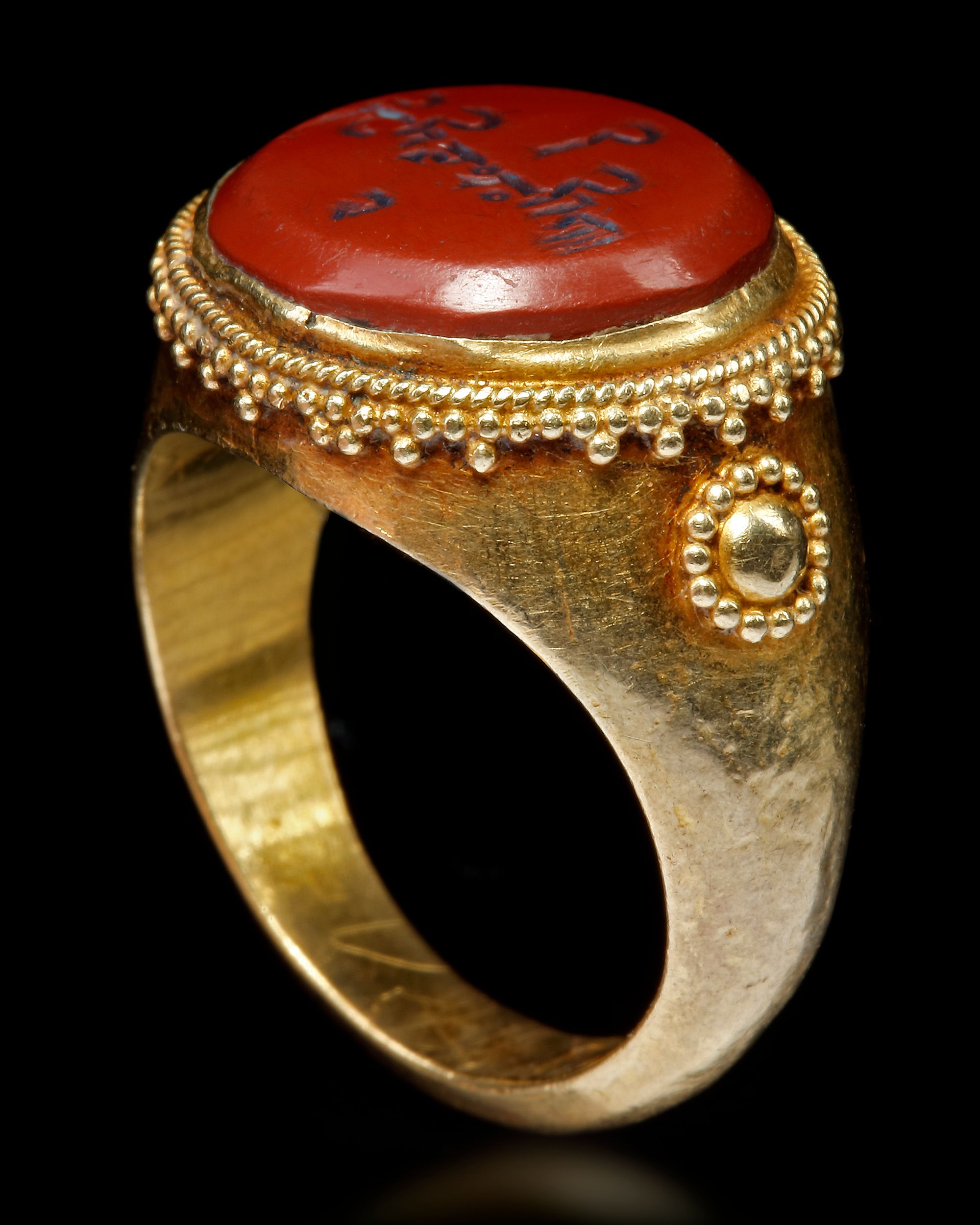 An agate seal of oval shape, set in a gold ring decorated with a row of dots, engraved with the text "محمد نبي الله ،علي ولي الله, Muhammad is the prophet of God, Ali is the guardian of God" in Kufic script.