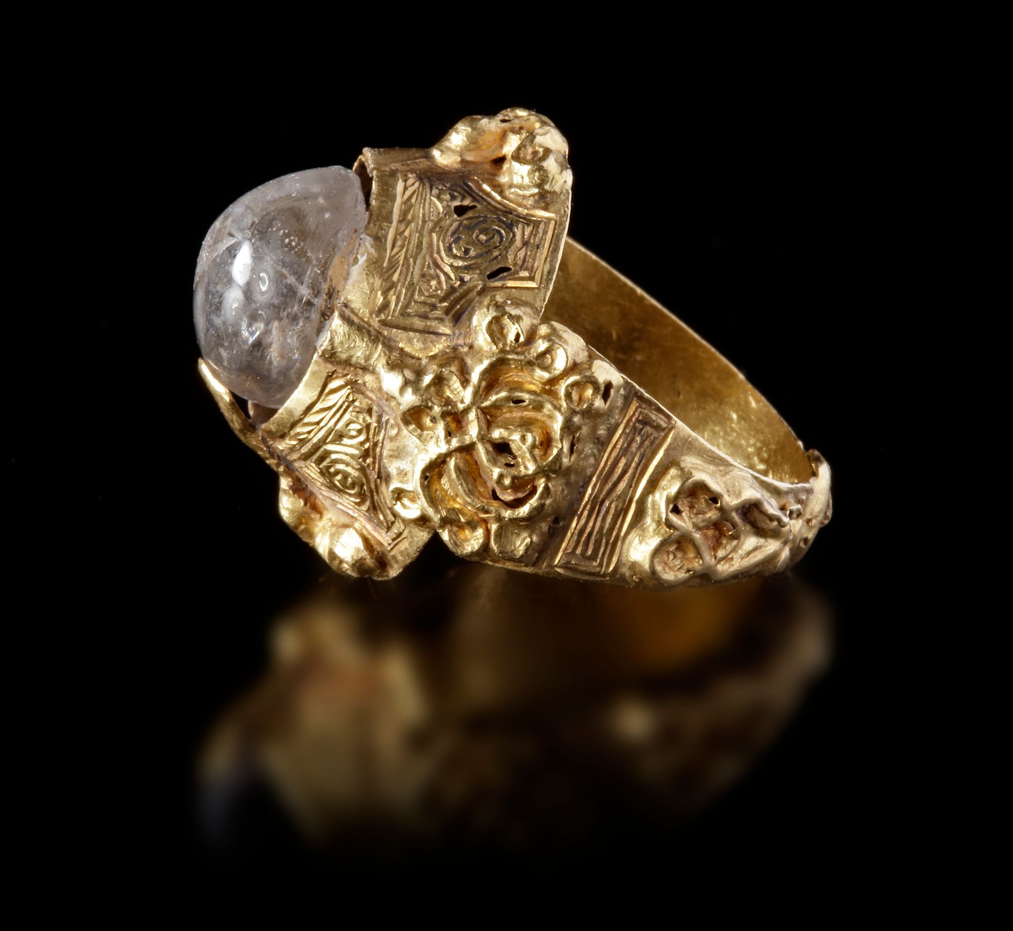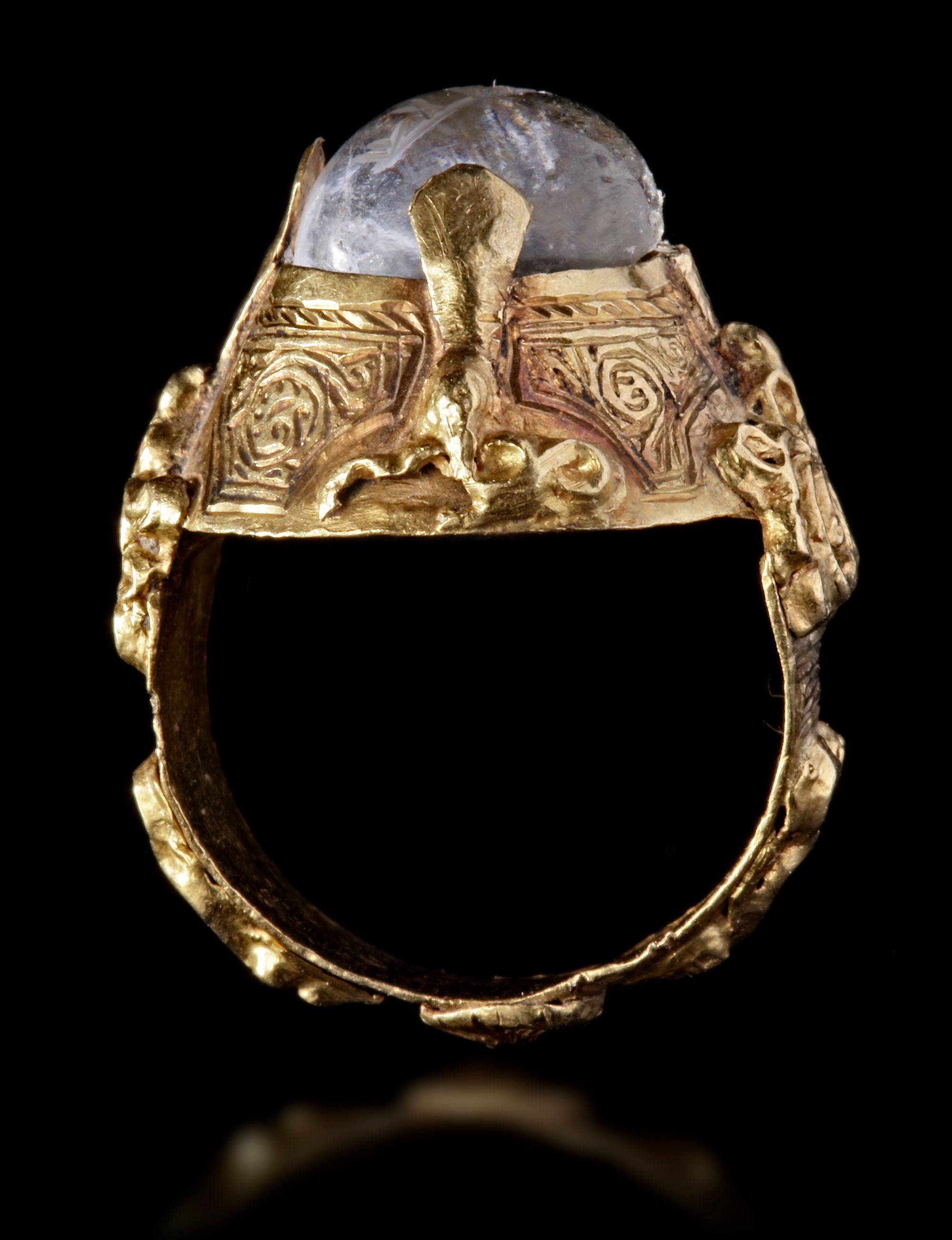 A crystal seal, set in a gold ring decorated with floral motifs, engraved with the text " حسبي الله, Allah is Sufficient for me" in Kufic script.