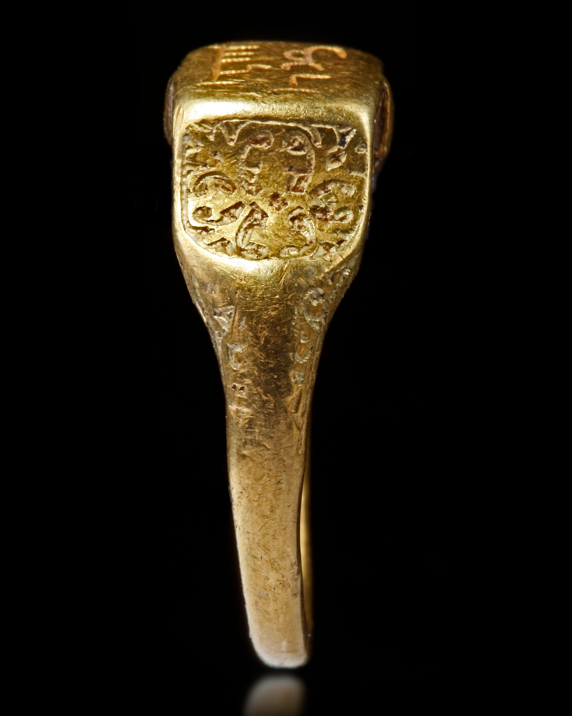 A gold ring engraved with the text " حمد بن سعد, Hamad ibn Saad" in kufic script and decorated with floral motifs on the shoulders.