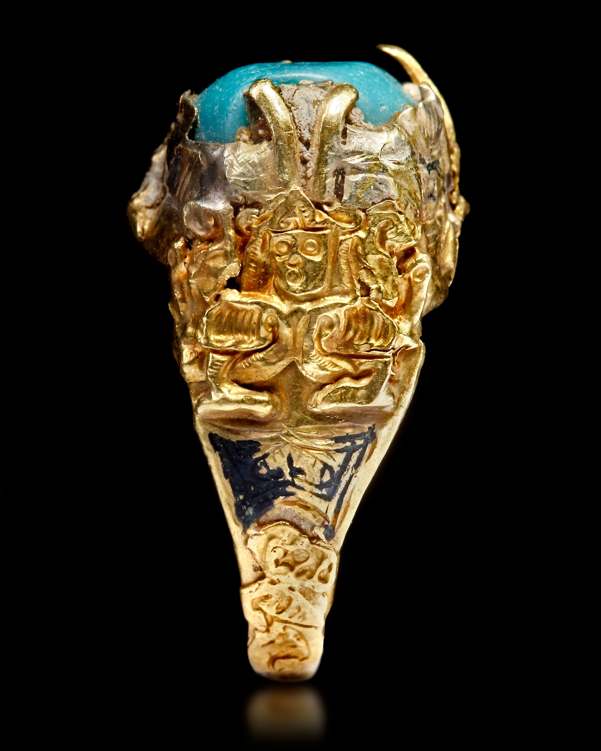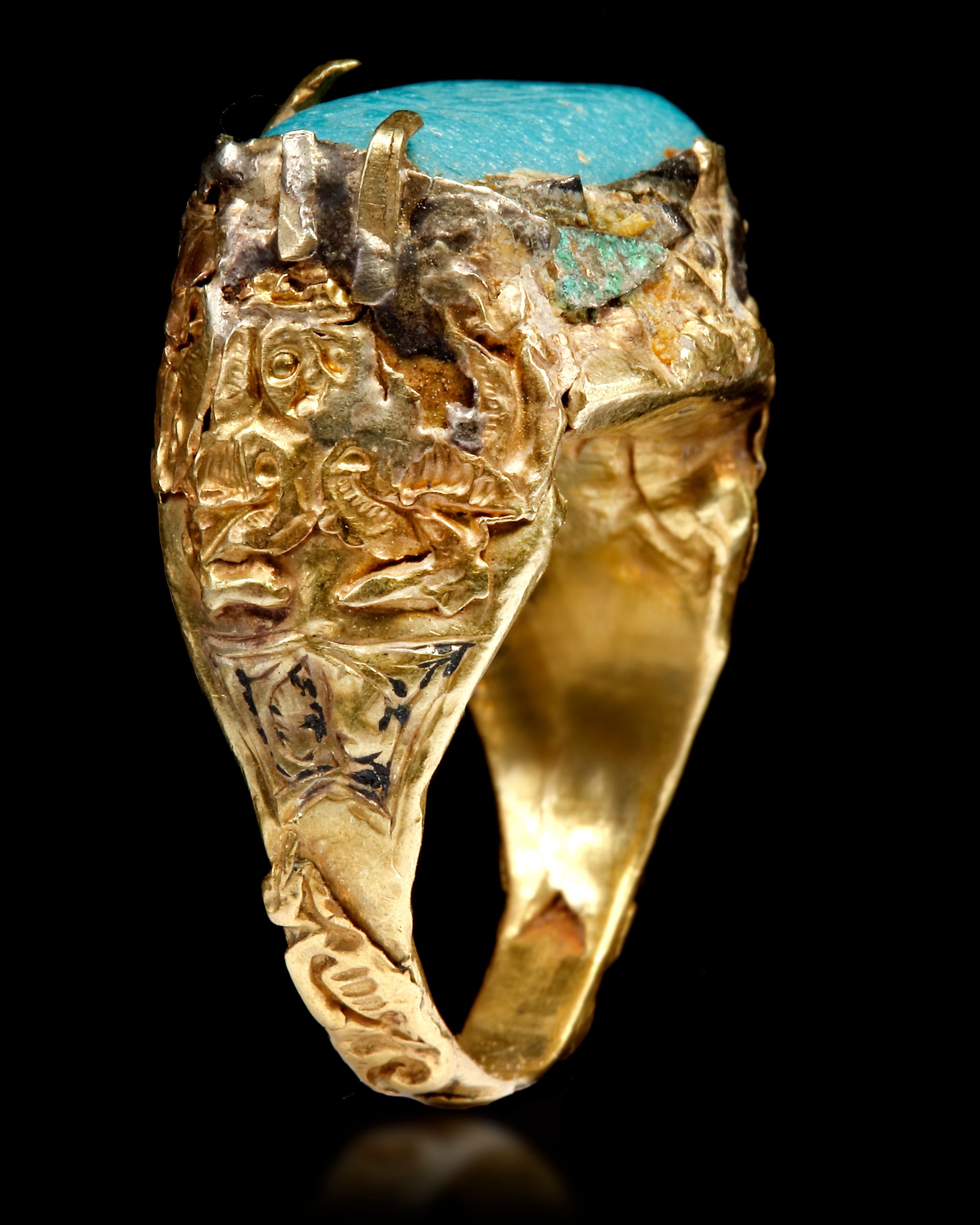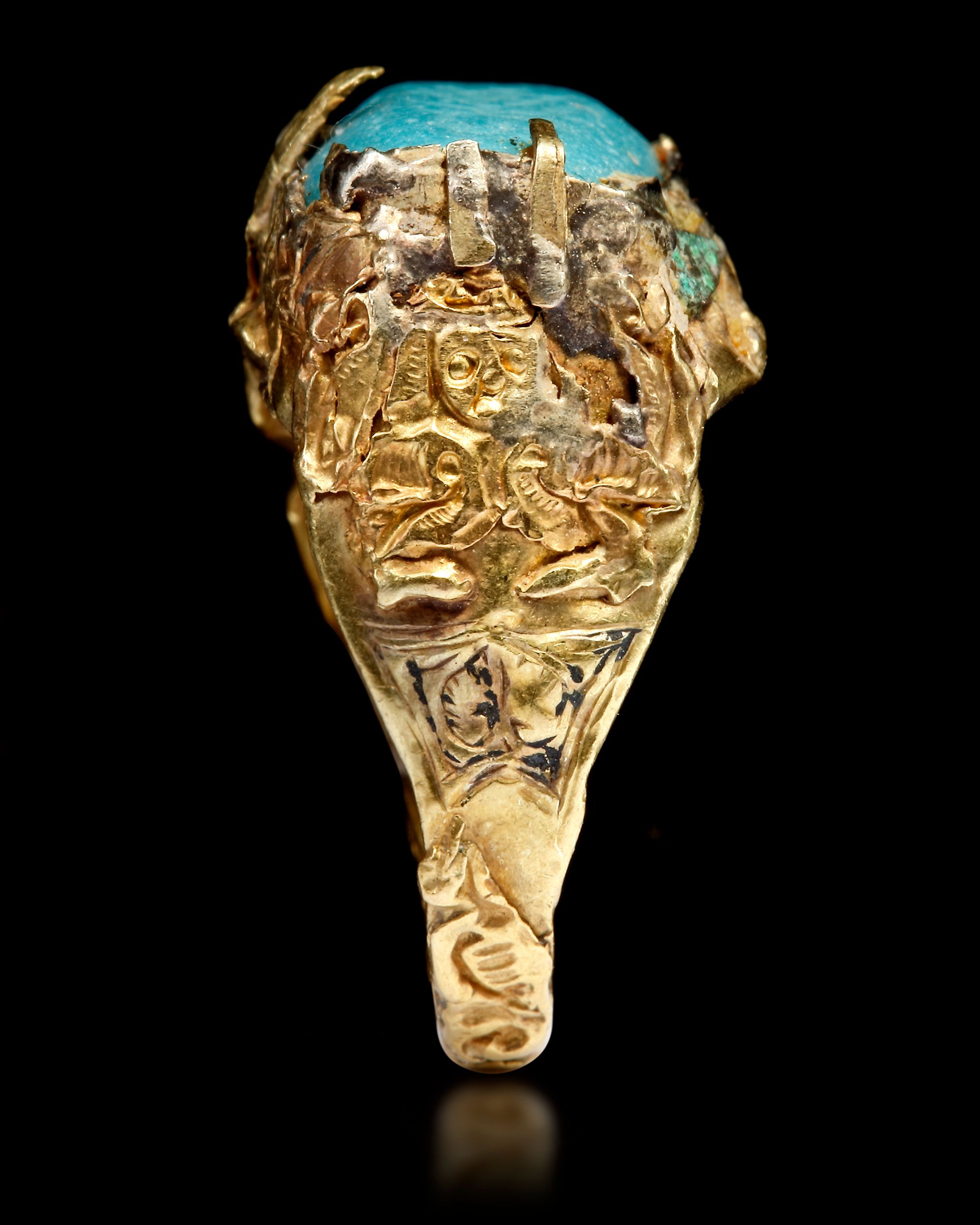 A turquoise seal of oval shape, set with claws in a gold ring decorated with floral motifs in low relief, and engraved with a text.
