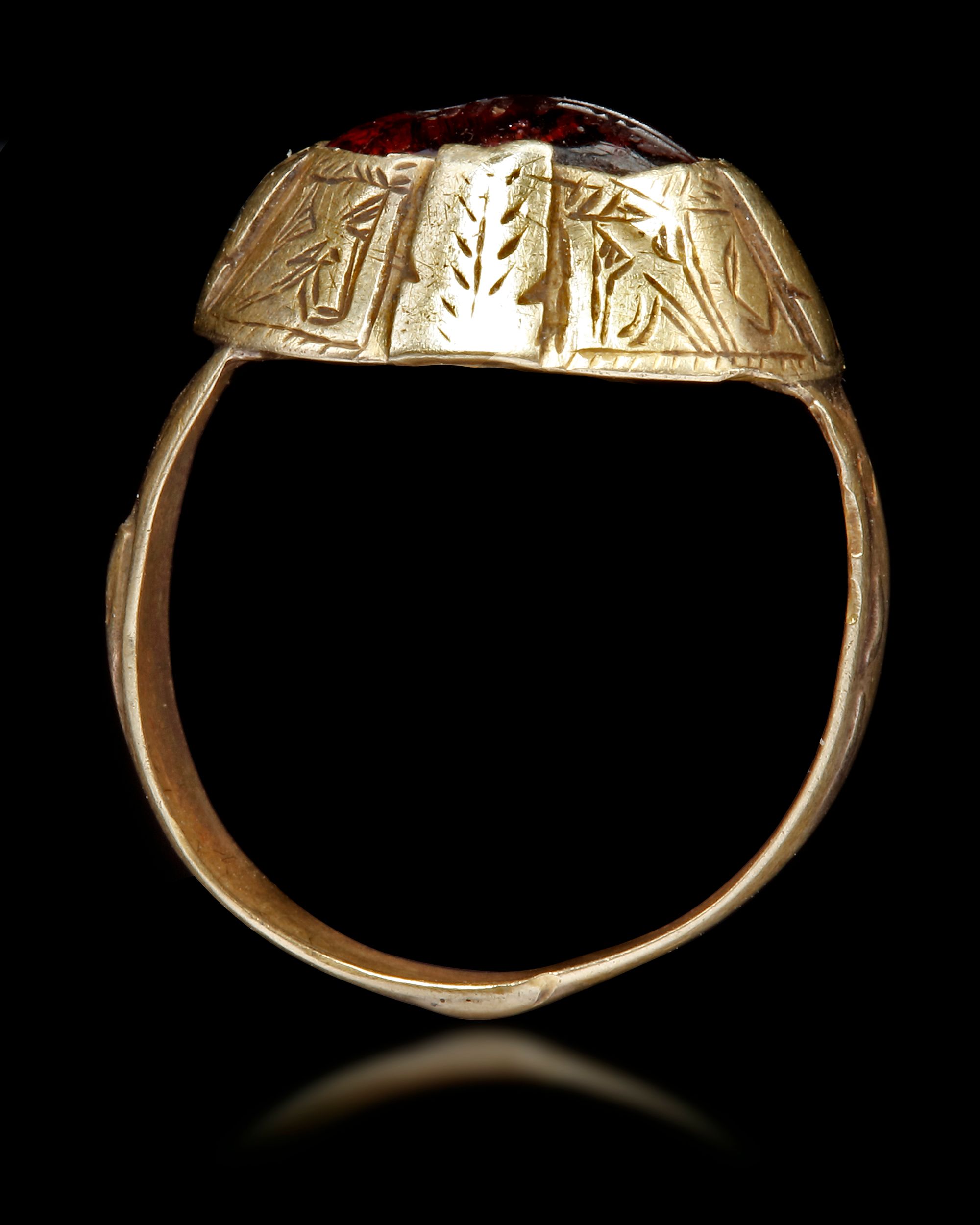 An agate seal of oval shape, set in a gold ring decorated with engraved floral motifs, engraved with the text " حسبي الله, For us Allah sufficeth" in Kufic script.