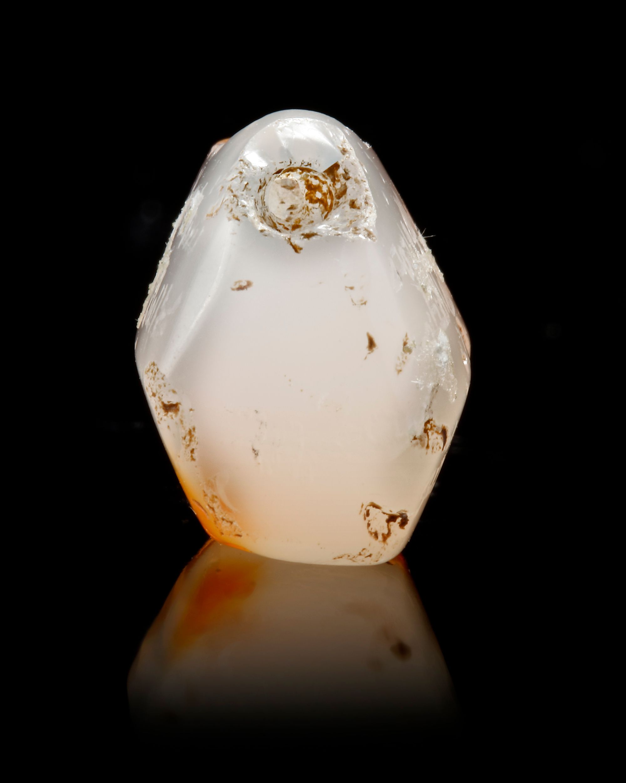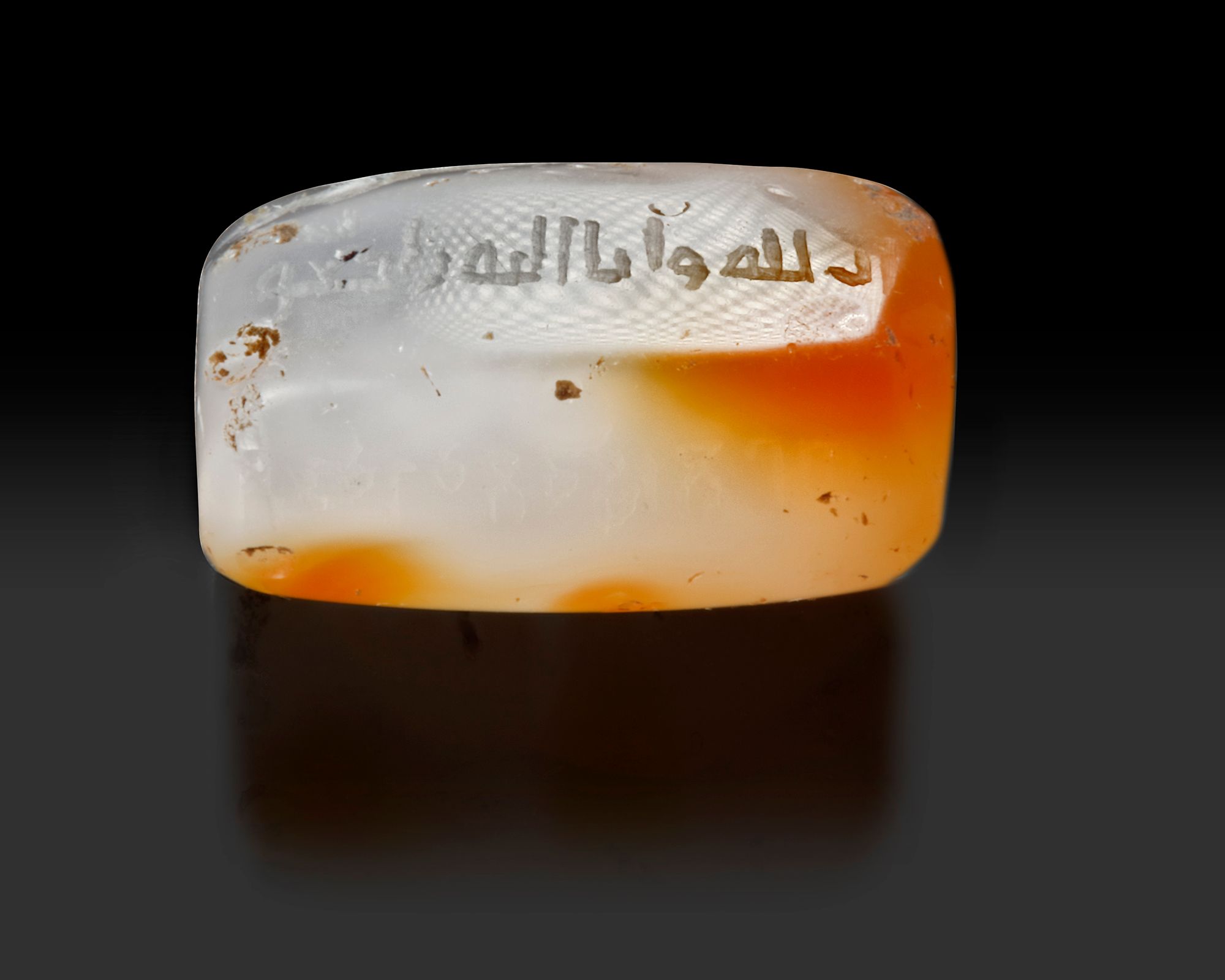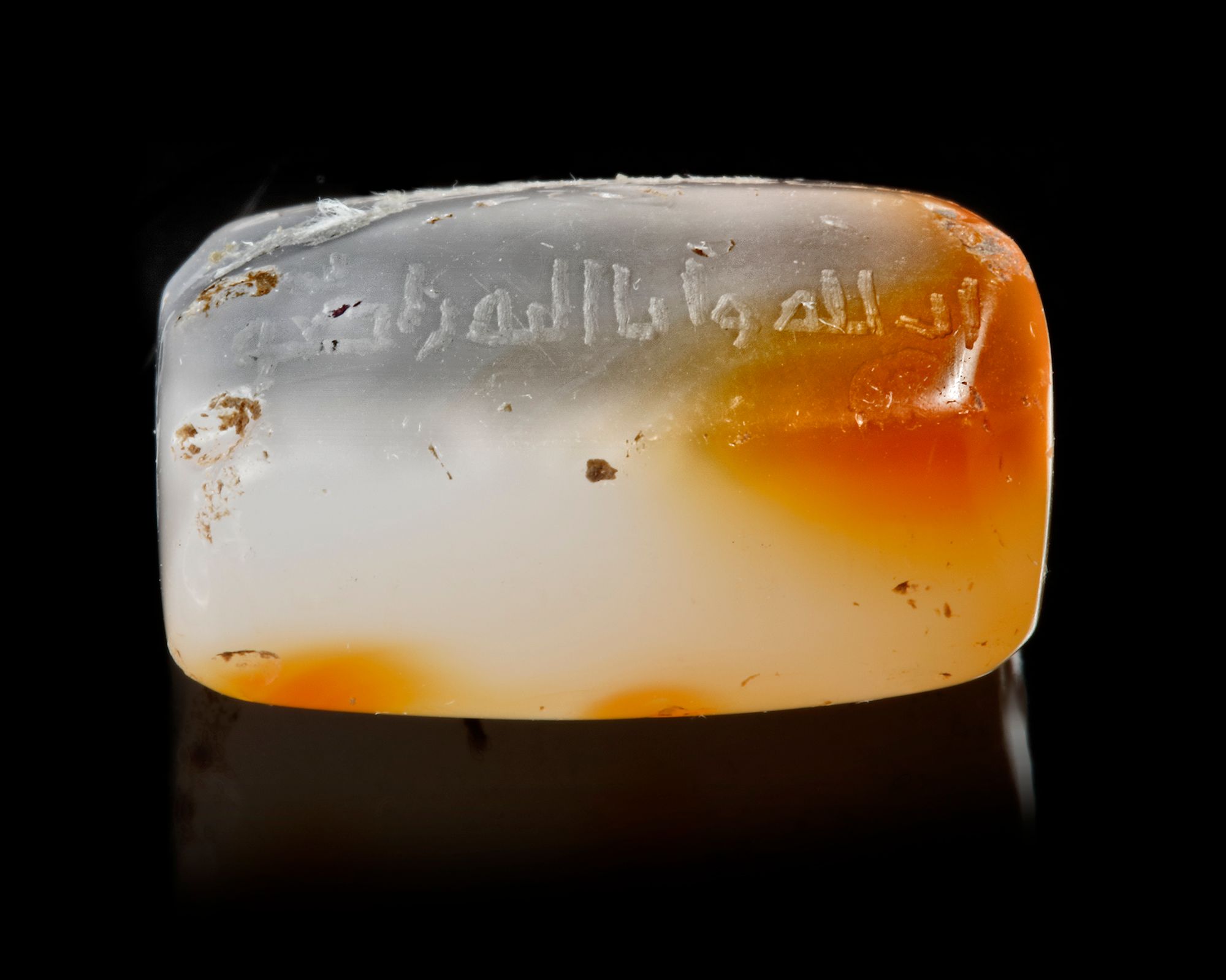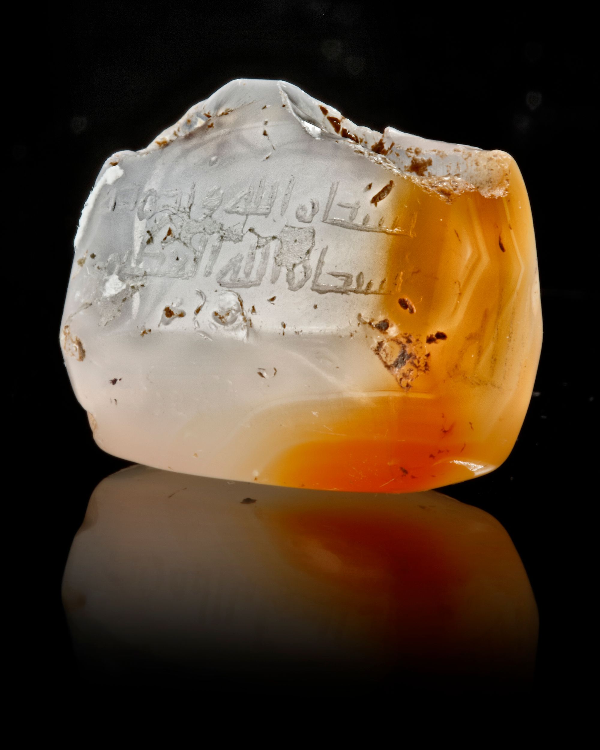 An agate seal of rectangular shape with rounded corners, engraved in Kufic script with the text "حسبنا الله ونعم الوكيل, استغفر الله ولاحول ولا قوة إلا بالله, سبحان الله والحمد لله ولا إله إلا الله والله أكبر, For us Allah sufficeth, and He is the best disposer of affairs, Forgive me, and there is no might nor power except with Allah, Glory be to Allah, praise be to Allah, and there is no god but Allah, and Allah is greater".