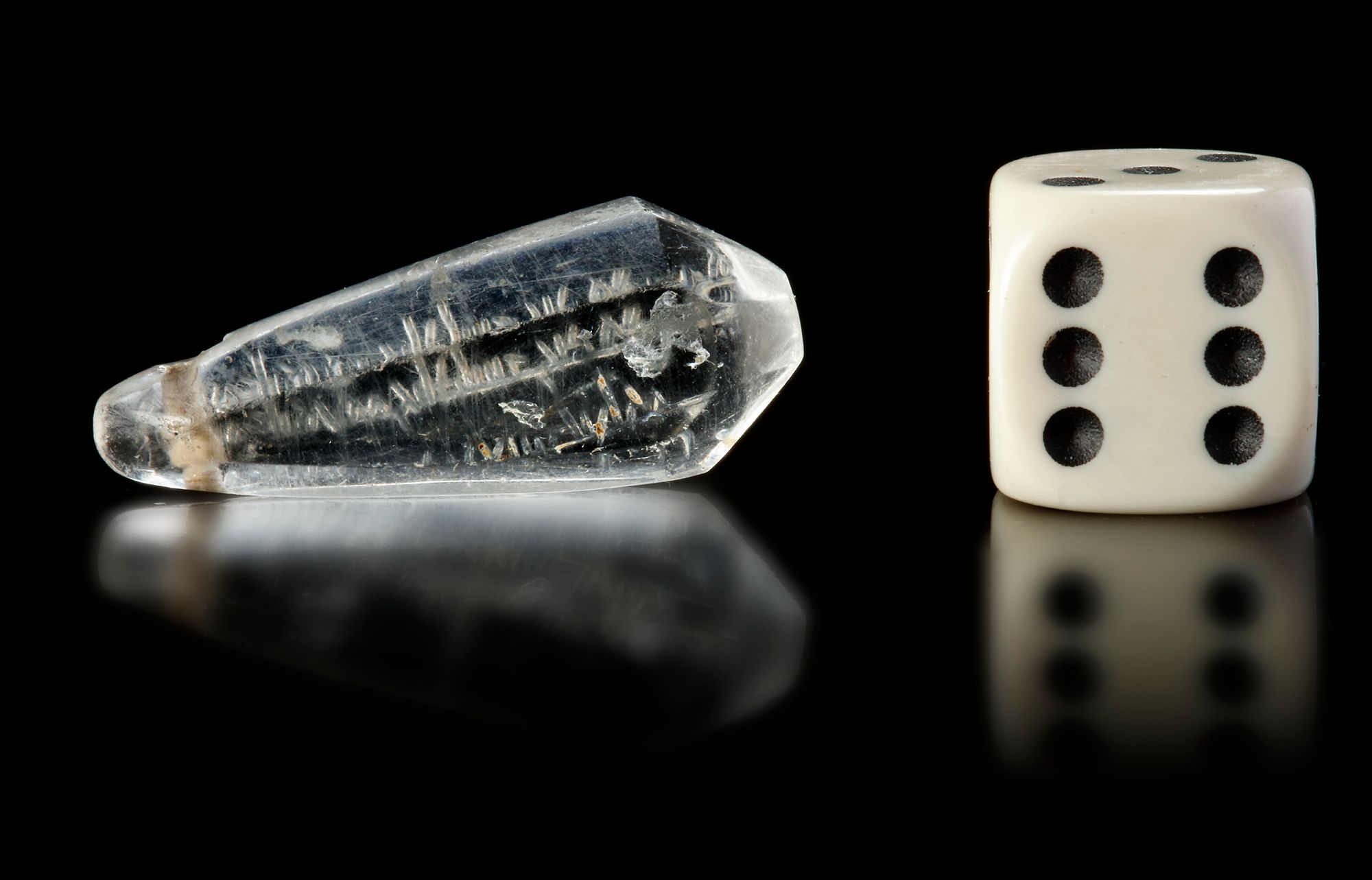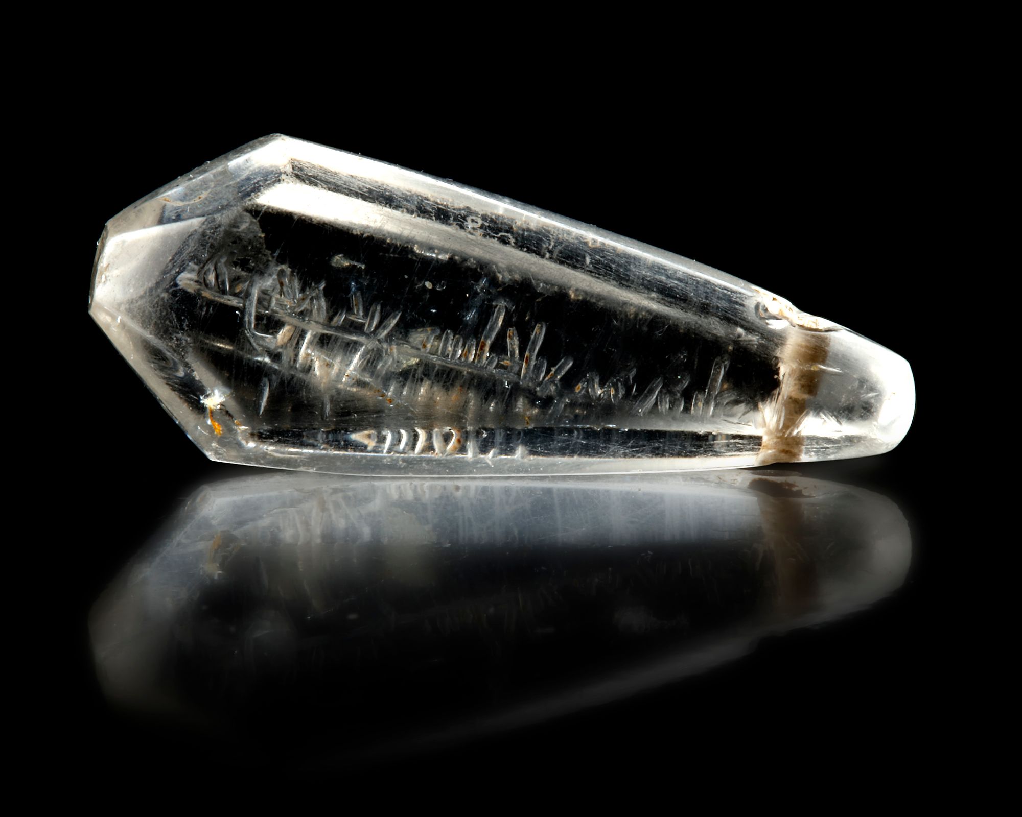 A crystal pendant engraved with "Kursi or throne verse from surah al-Baqraa" in kufic script.