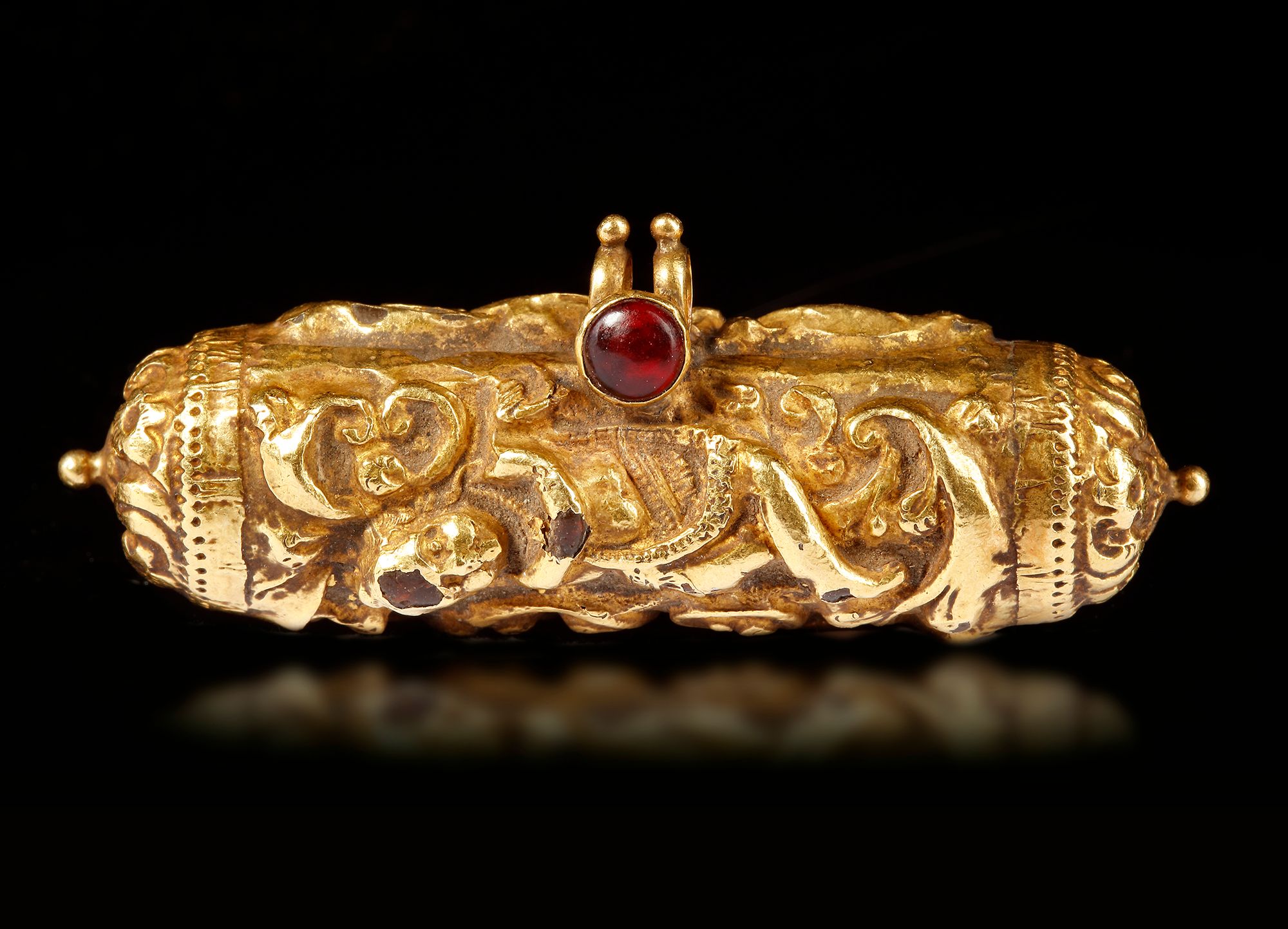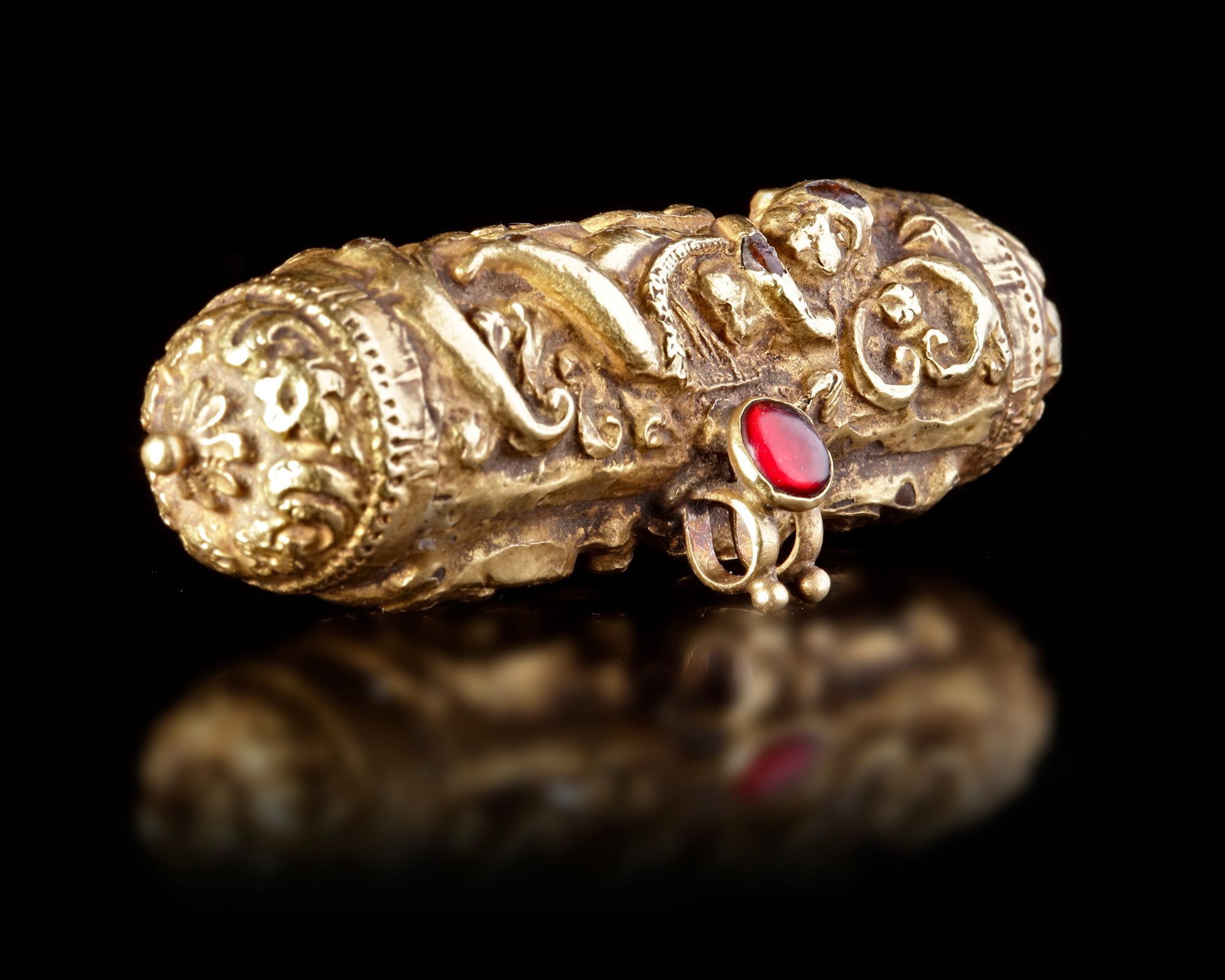 A gold talisman of rounded shape, engraved with floral motifs. 5.6 cm. Weight: 11.30 grams.