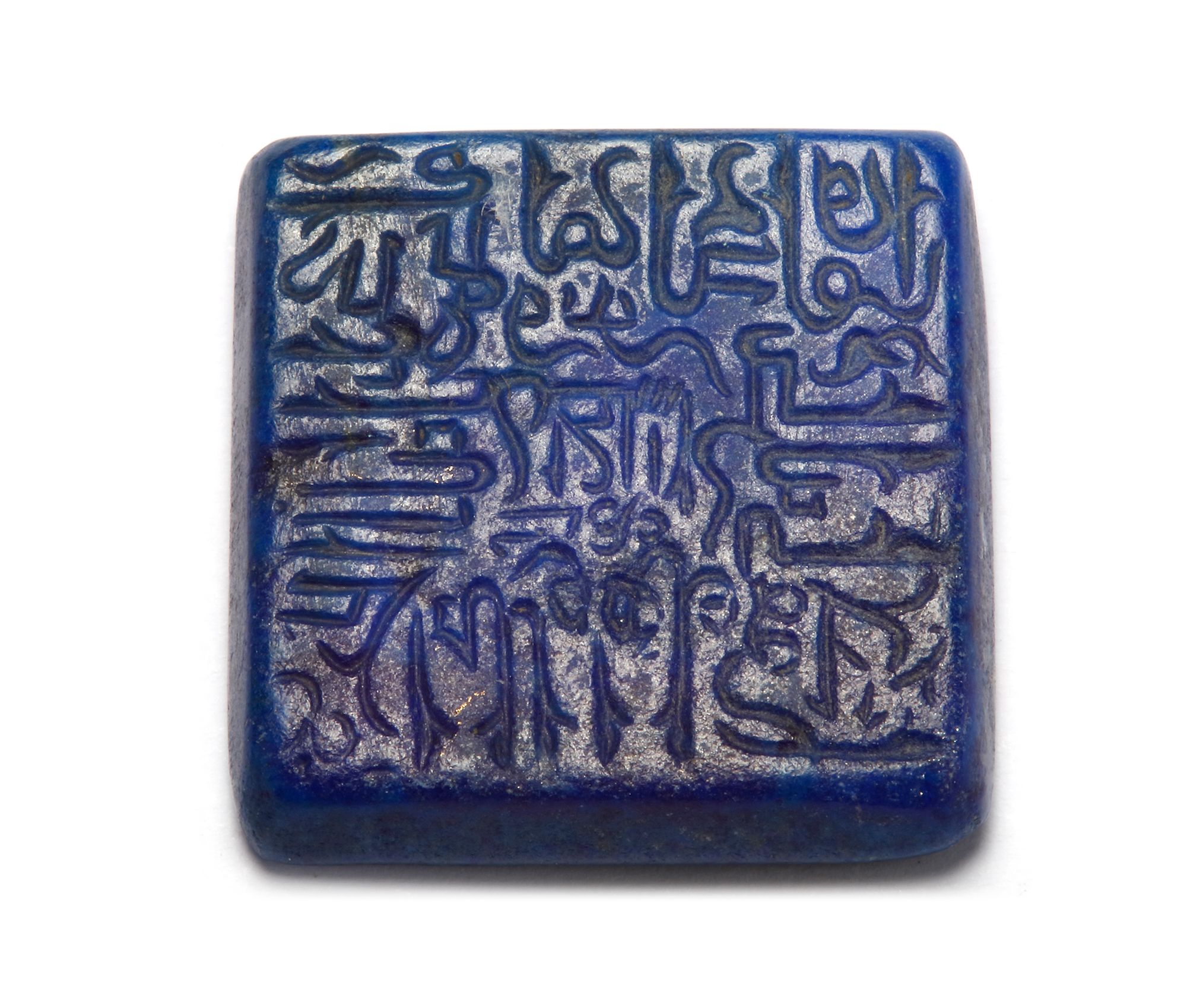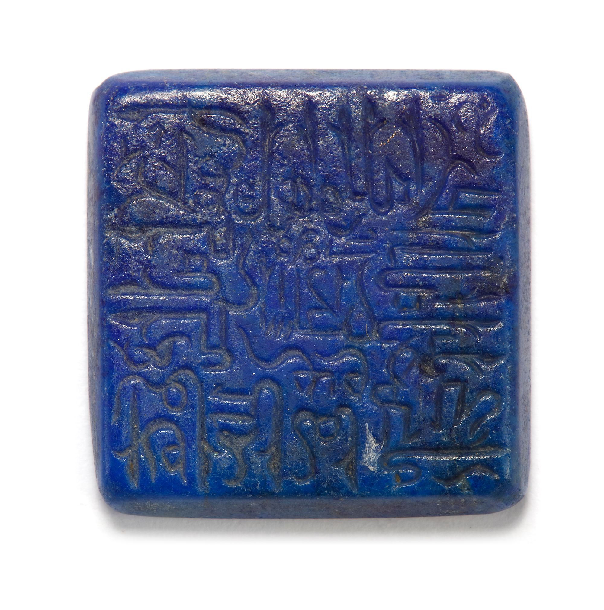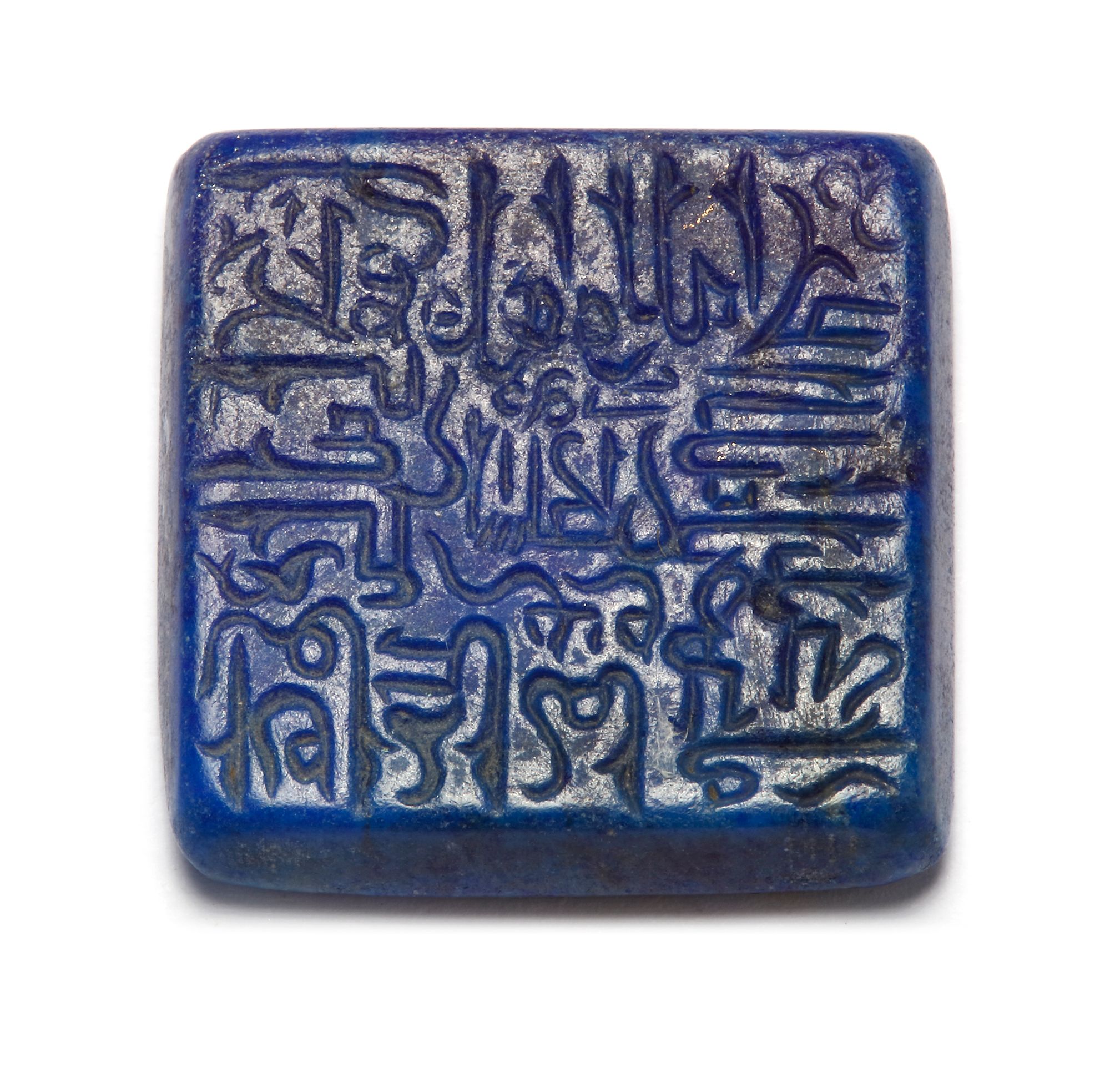 A lapis lazuli seal of square shape and engraved with the text " السلطان محمد ؛ سورة الإخلاص, Sultan Muhammad, Surah Al-Ikhlas".
