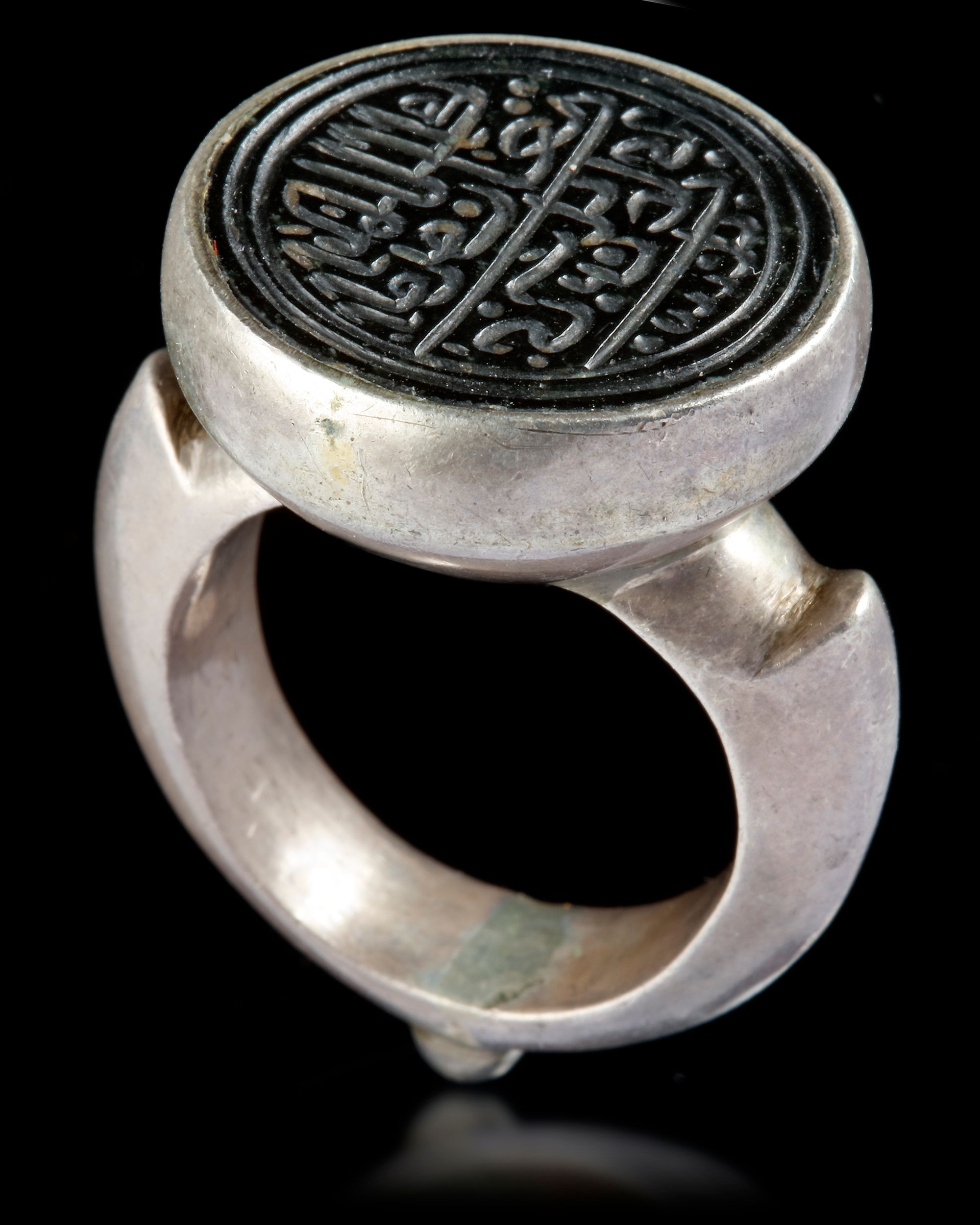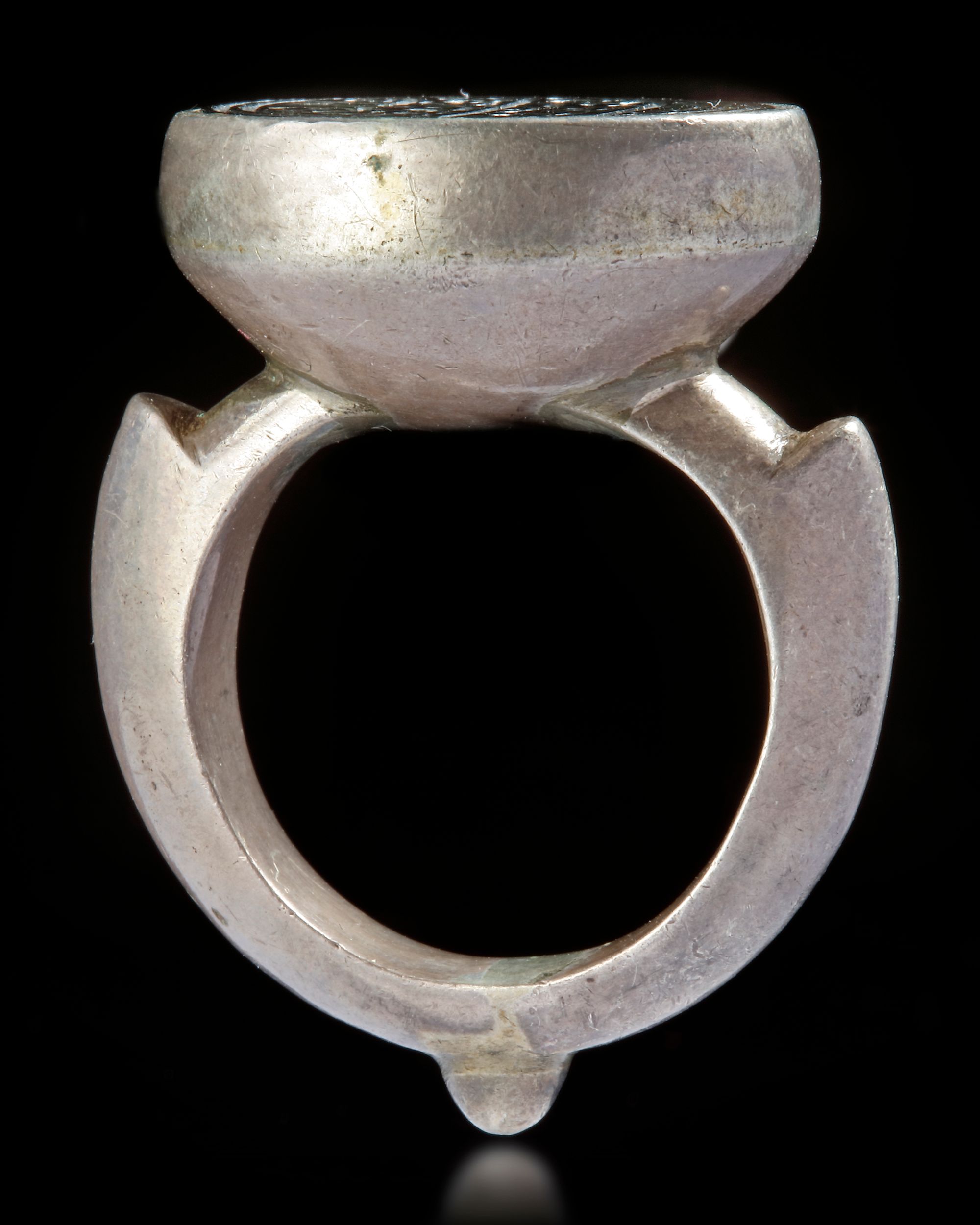 An agate seal of rounded shape, set in a silver ring, engraved with the text "الواثق بالملك الديان هرمز شاه بن أغا خان, Confident in the King -Malik- Al-Dean, Hormuz Shah bin Aga Khan" in nastali'q script.