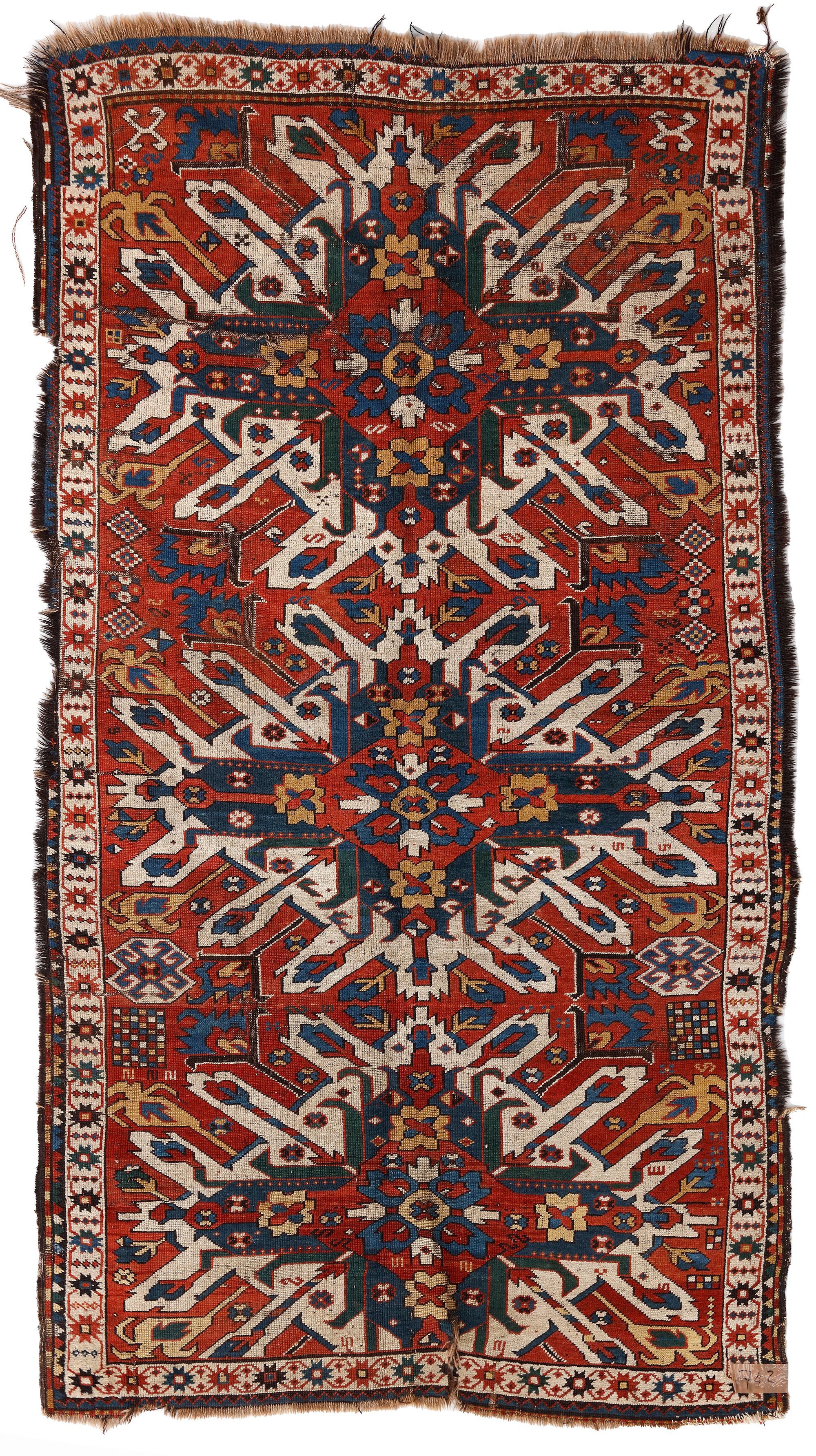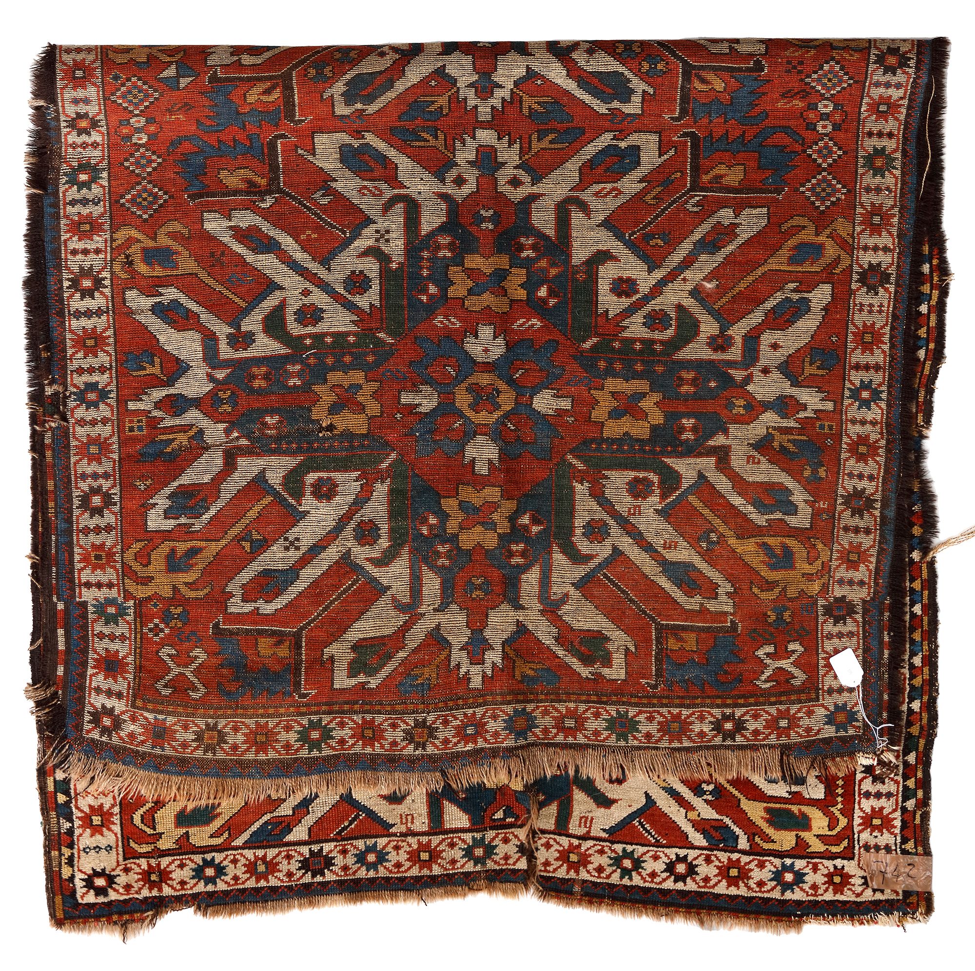 Overall low in pile, both sides damages, a small rip at one end. 233 by 132 cm.