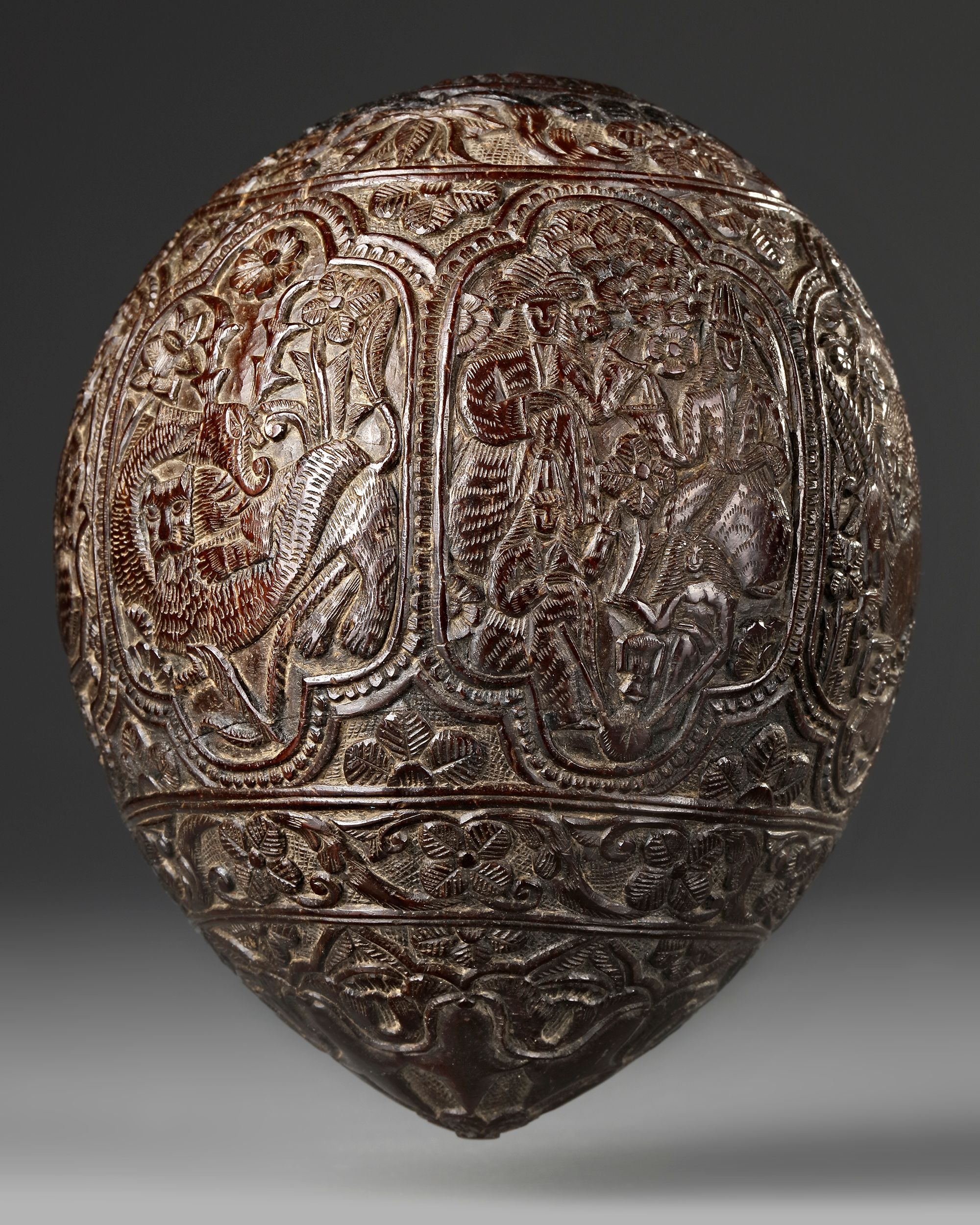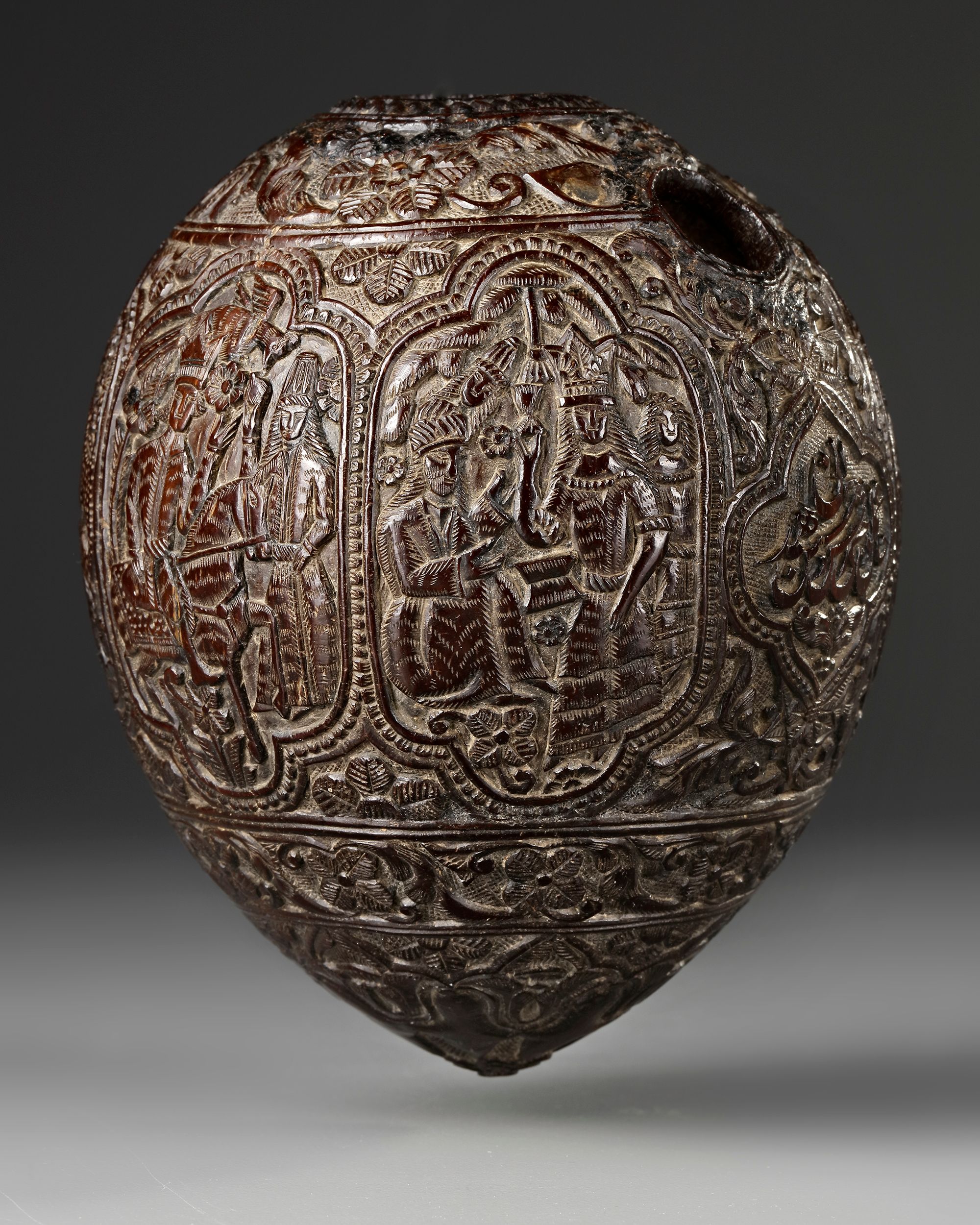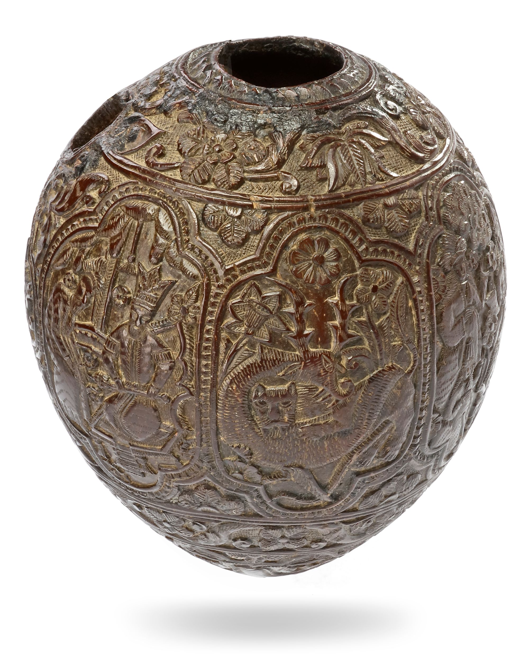 Of ovoid form with tapering base, the exterior is carved with a broad band containing cartouches enclosing seated figures and animals in hunting scenes.