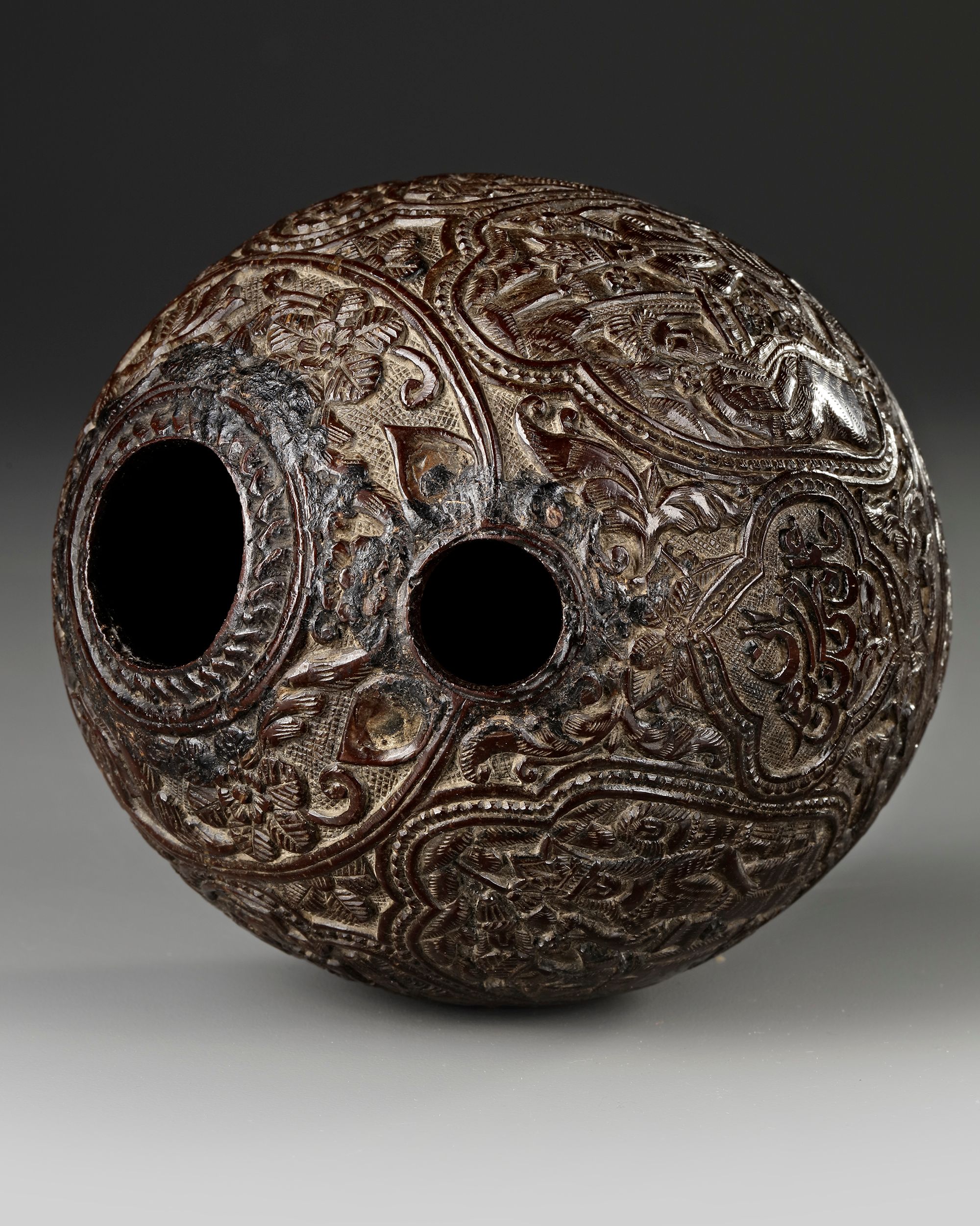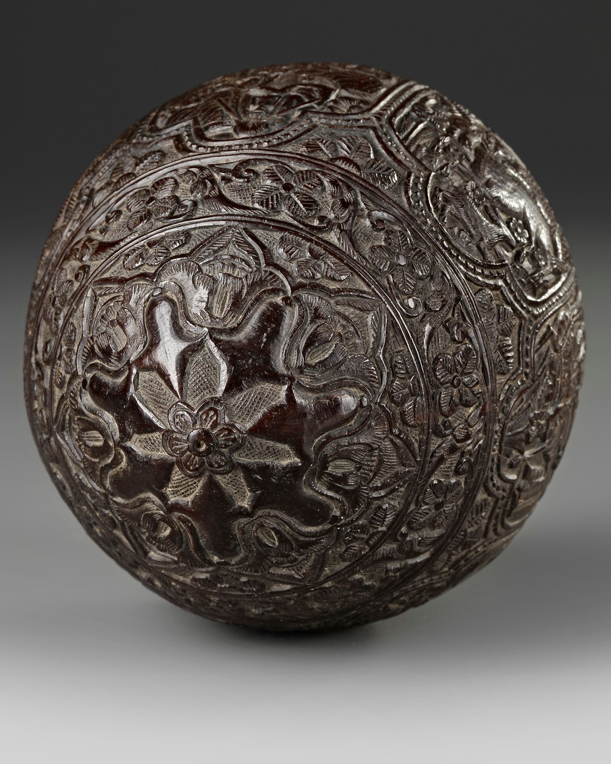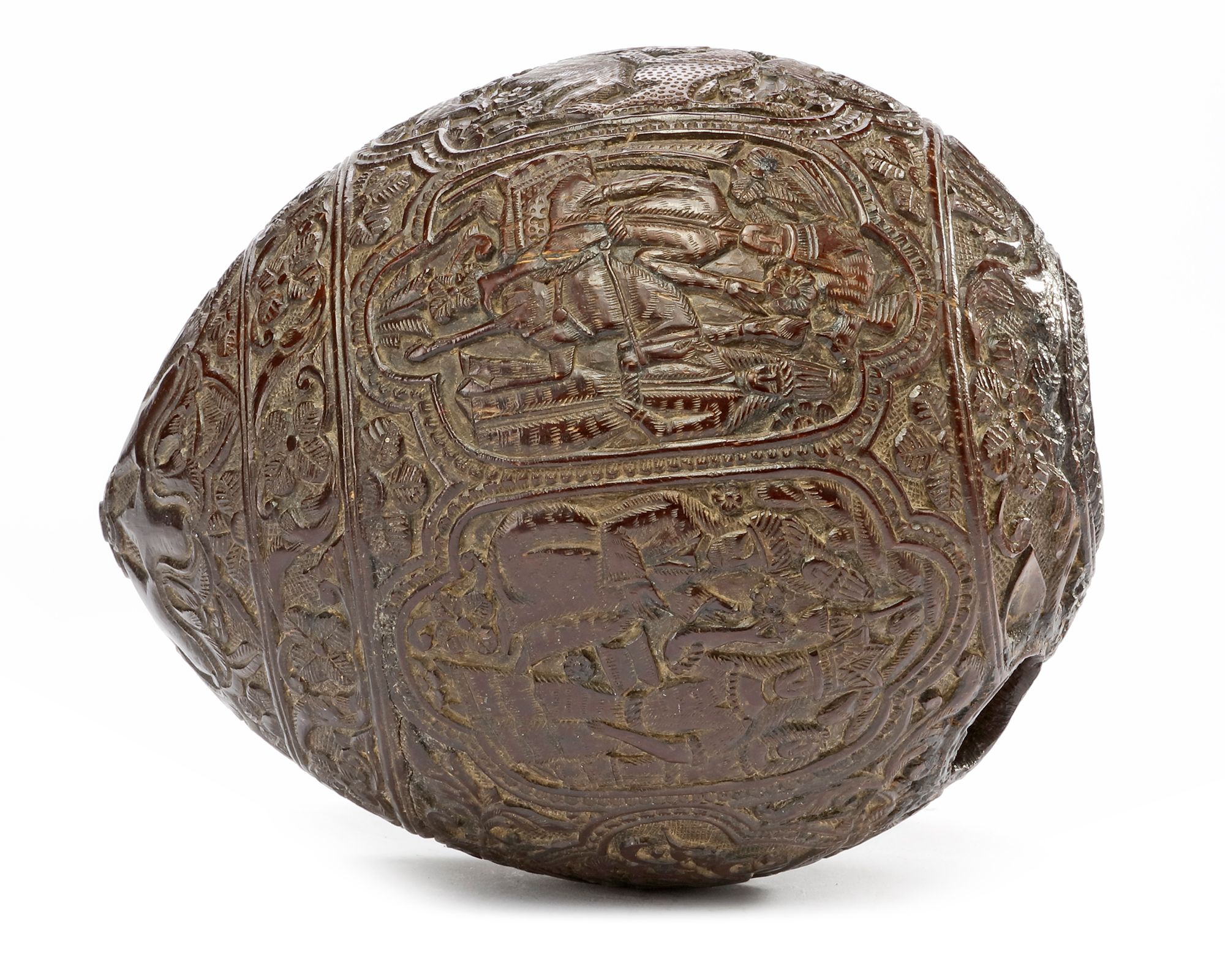 Of ovoid form with tapering base, the exterior is carved with a broad band containing cartouches enclosing seated figures and animals in hunting scenes.