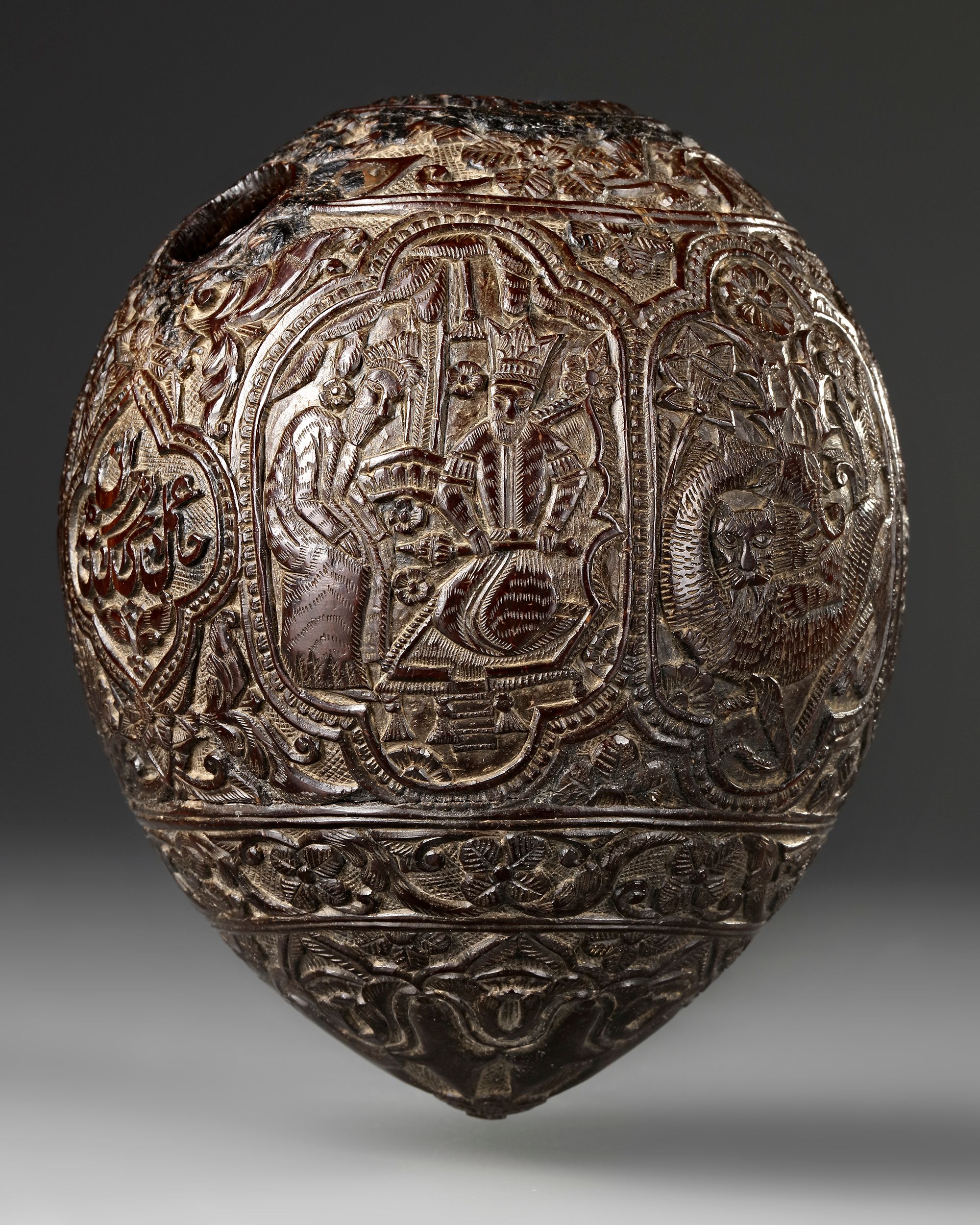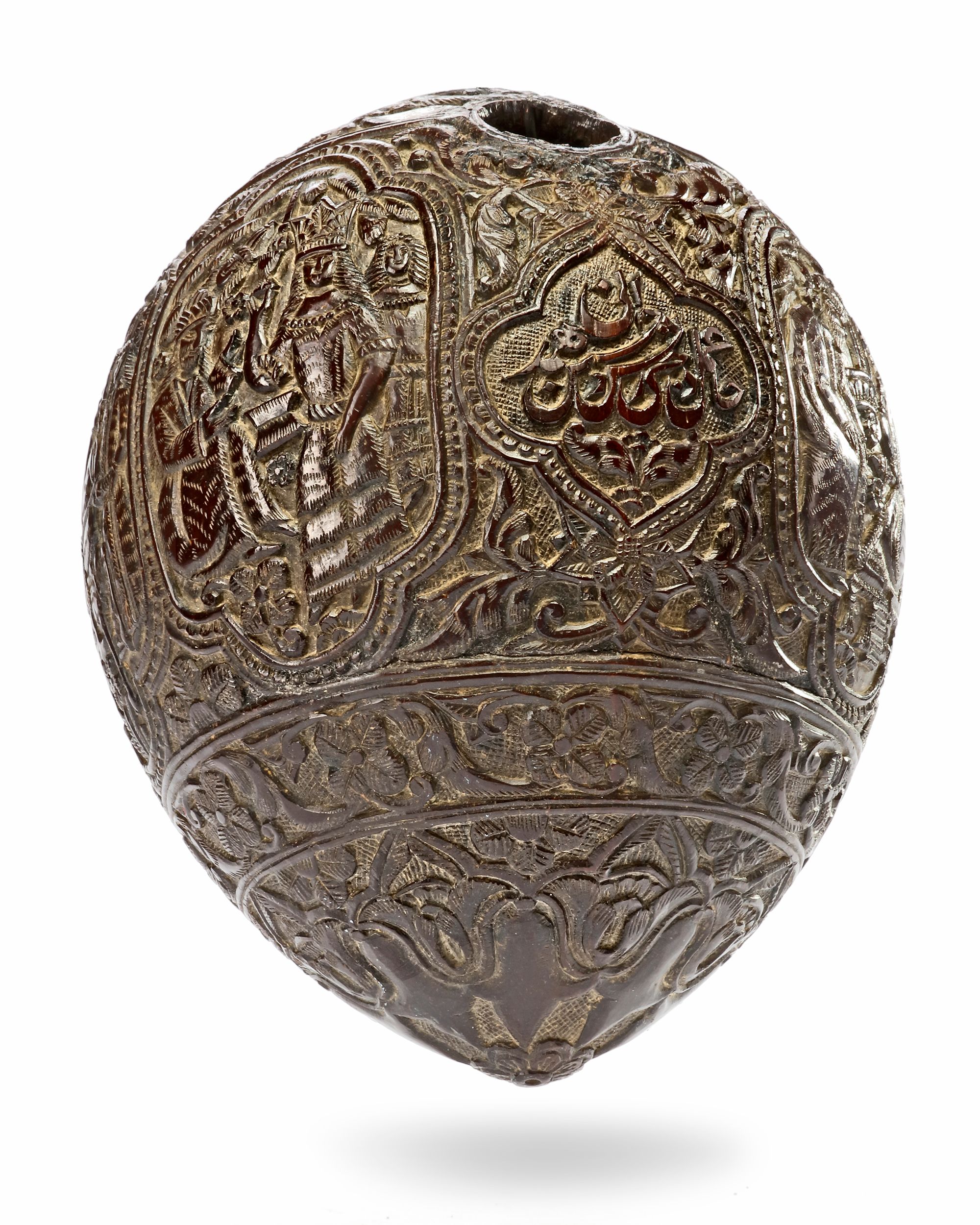 The upper and the lower part engraved with floral motifs amongst foliage. A floral cartouche enclosing the inscription " made by Haji Hussein Hassan Darwish Hamedani".
