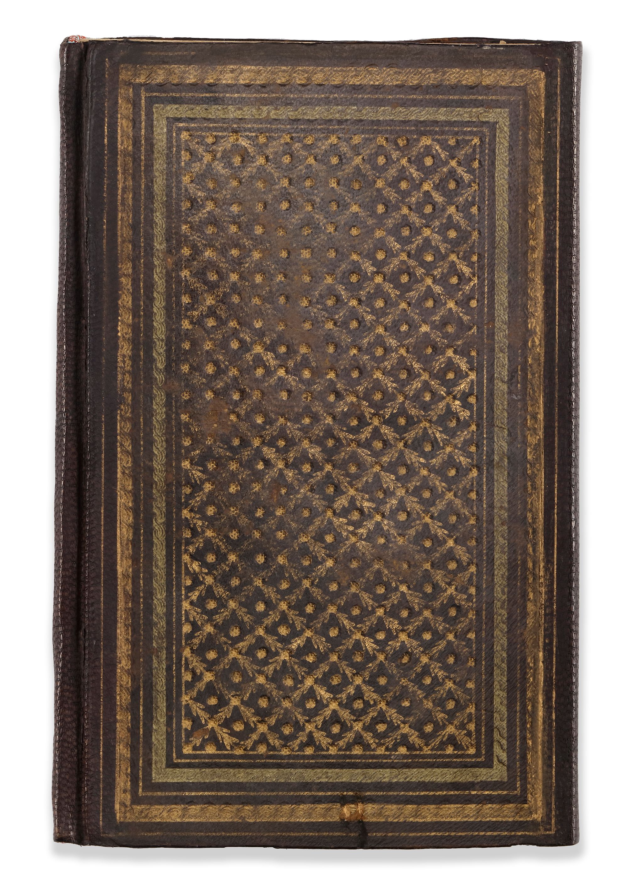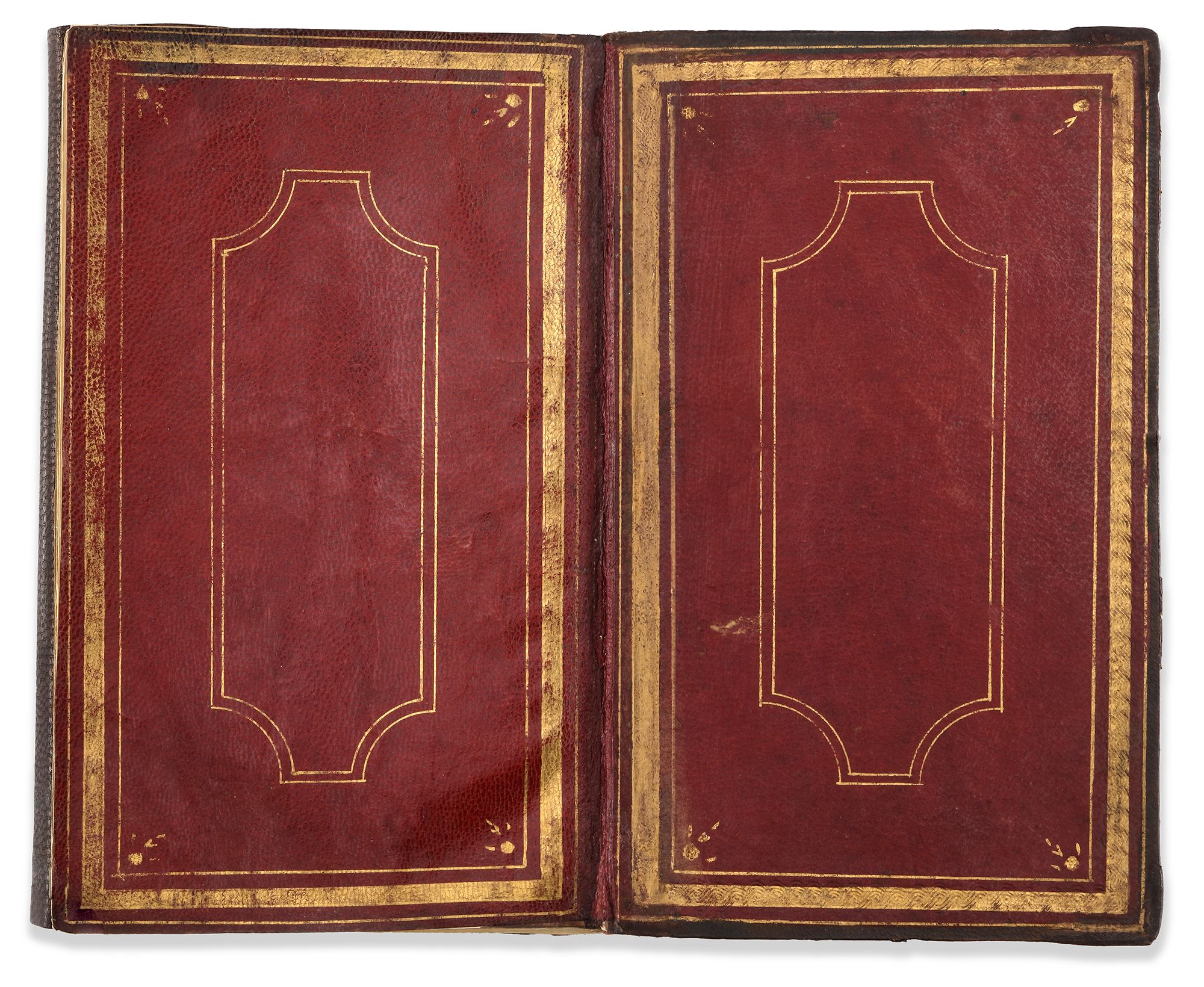 In original tooled and stamped gilt brown morocco binding with flap.