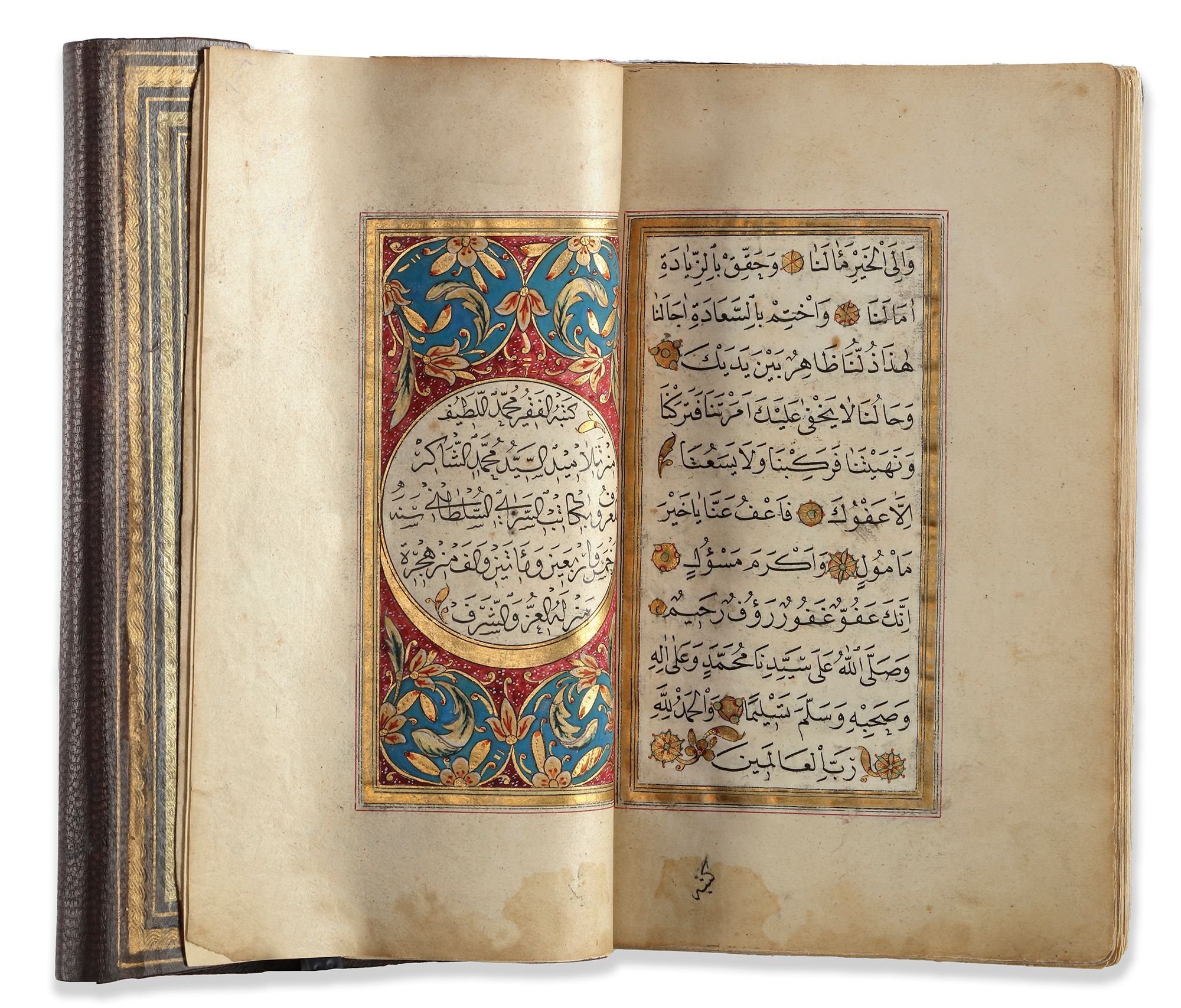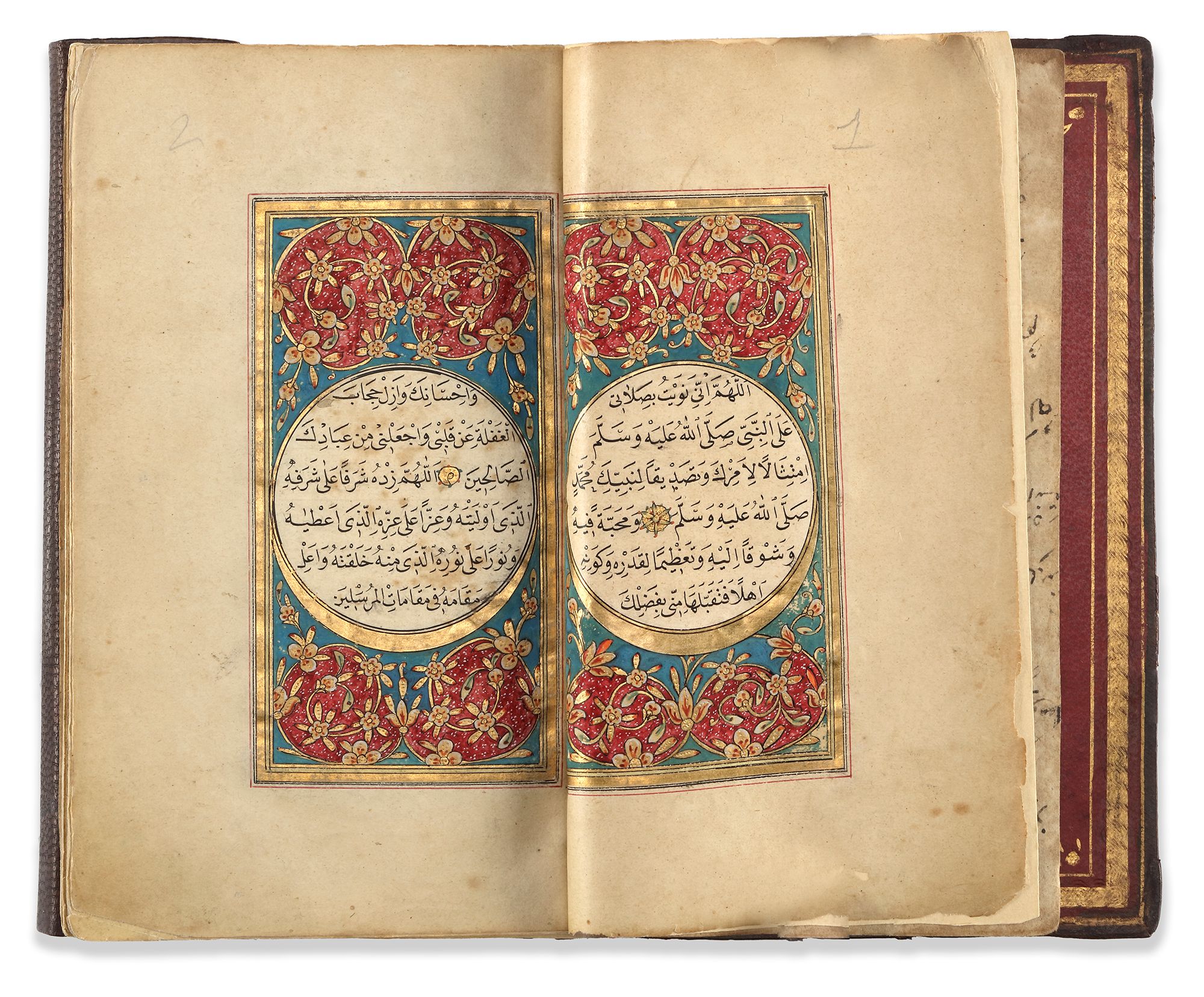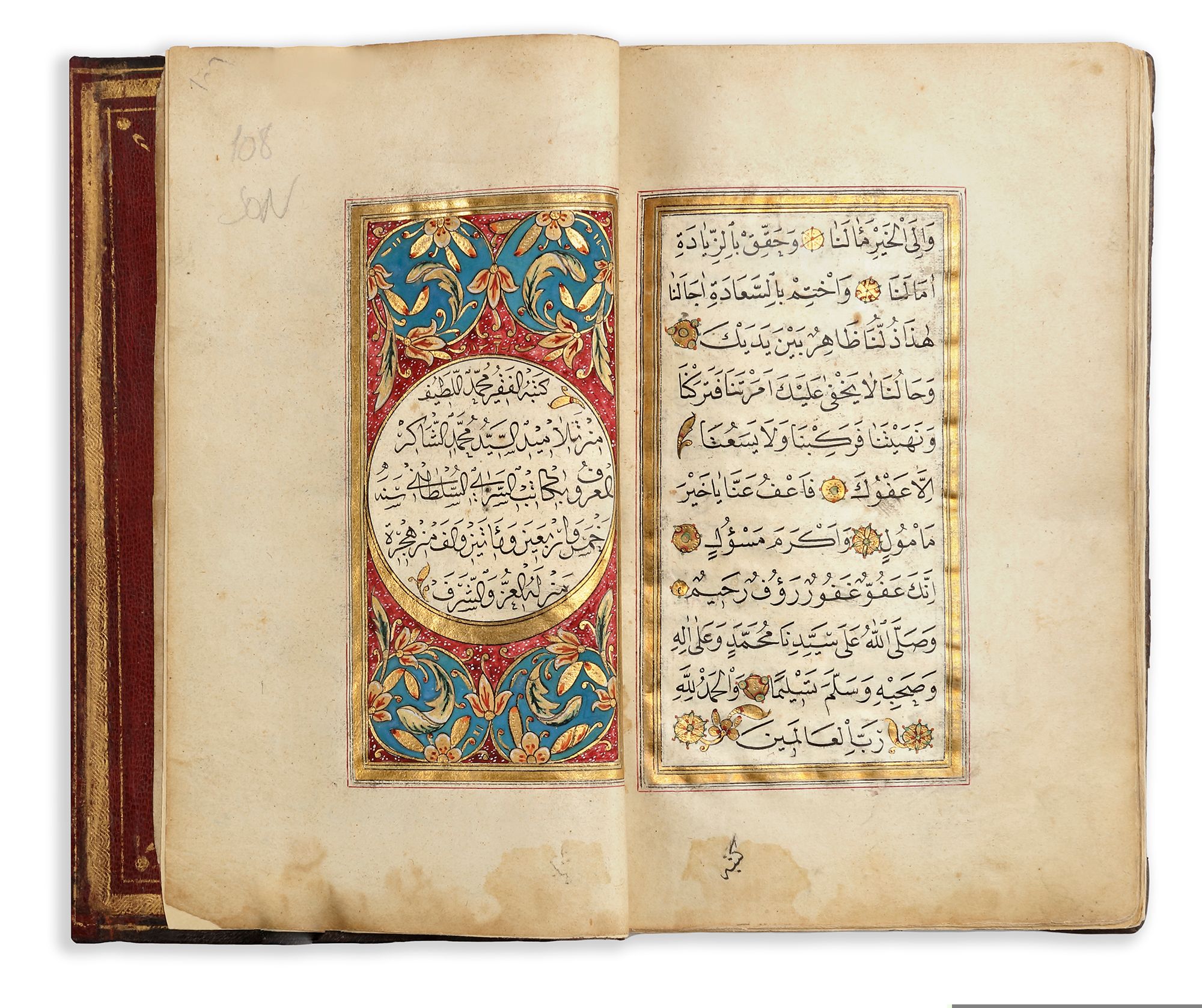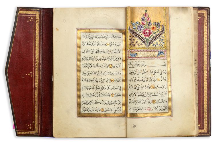 Arabic manuscript on paper depicting prayers in honour of the Prophet Muhammad, 108 leaves with 3 fly-folio, each folio with 11 lines written in elegant black naskh script, with gold verse markers pointed out in polychrome dots, some words picked out in red, text within double gold and red rules, two opening biofolio with royal gold and rococo-style decoration.