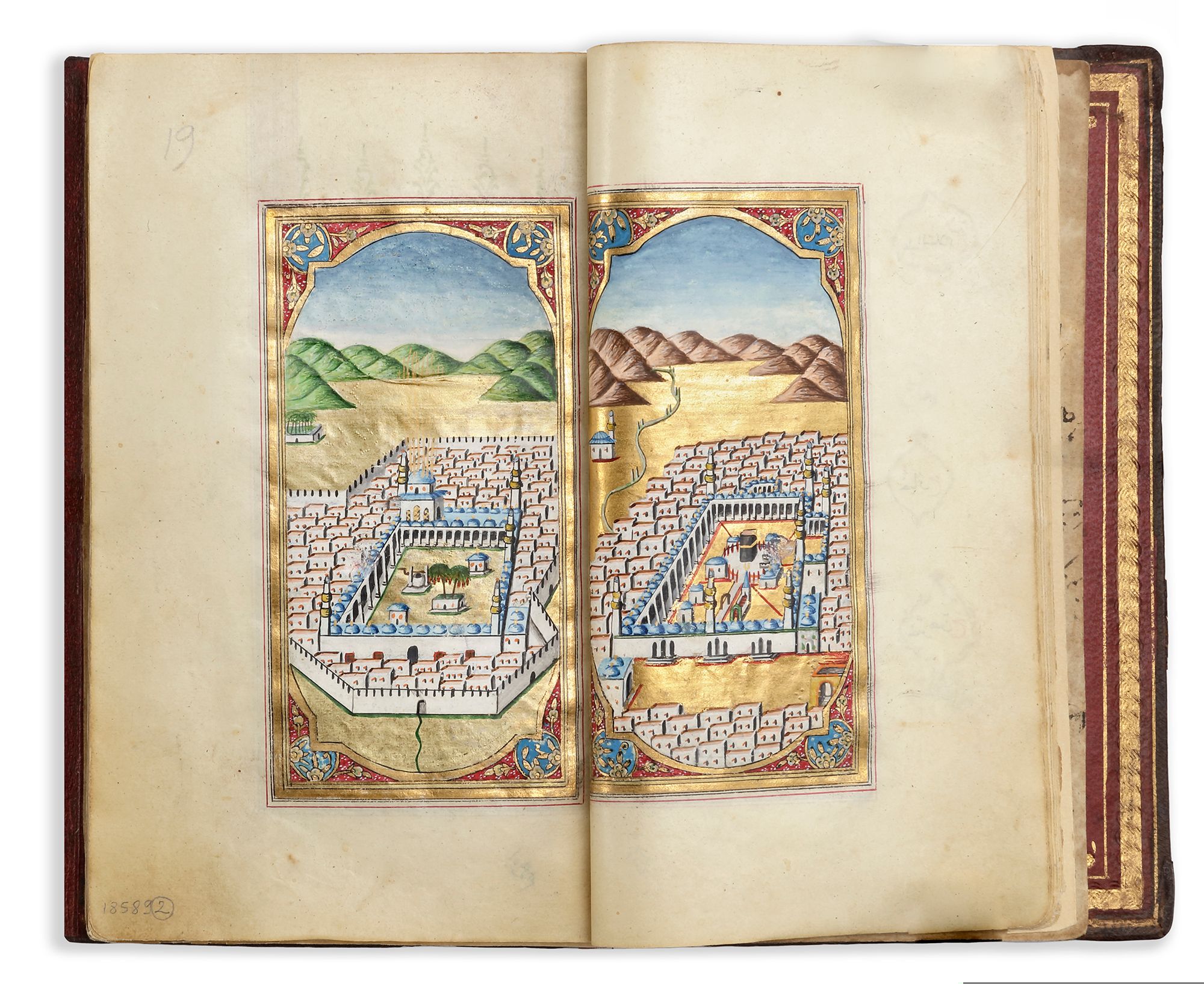 Further two detailed illustrations Mecca and Medina with Al-Masjid AL-Haram and Al-Masjid AL-Nabawi, different attributed names to the Prophet, occasional marginal floral motifs, colophon signed 'Mehmed Latîf Efendi student of Mehmed Sakir Efendi and dated 1245 AH'