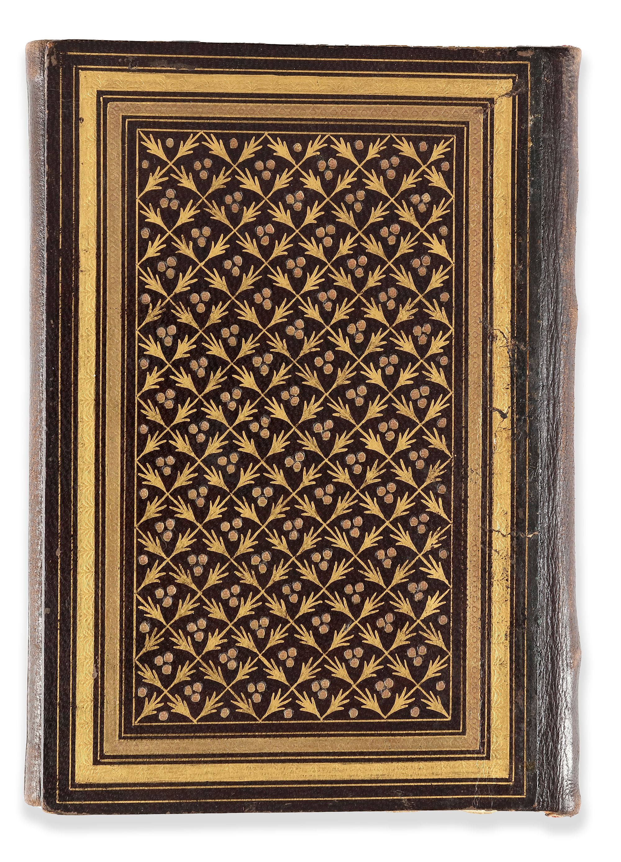 In brown morocco binding with flap decorated with gold painted floral motifs.