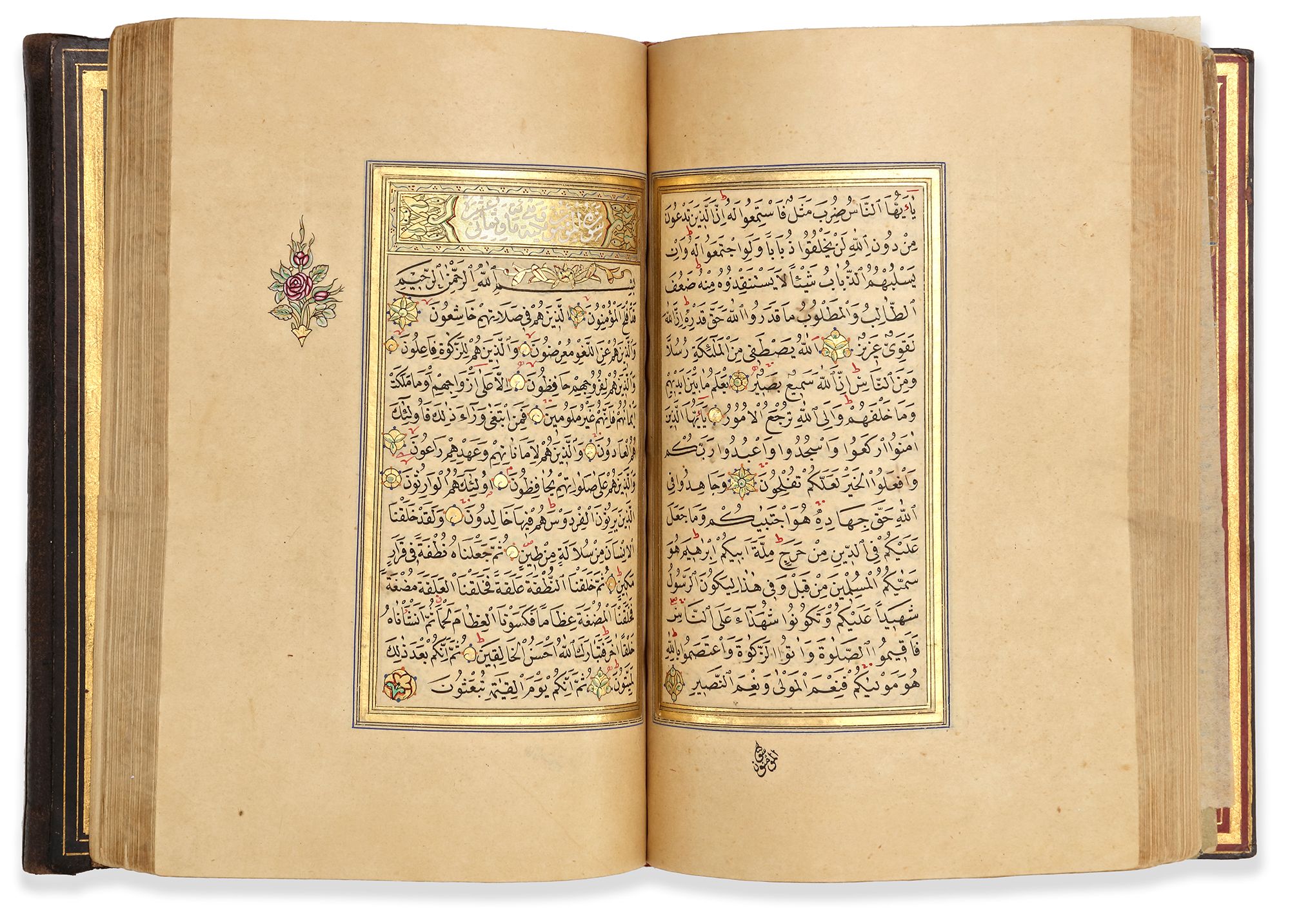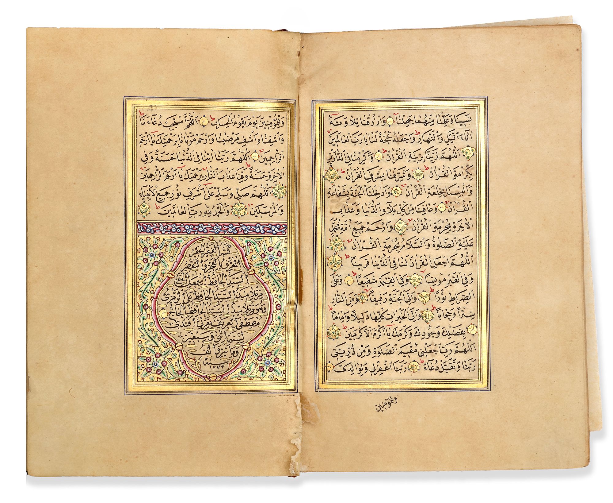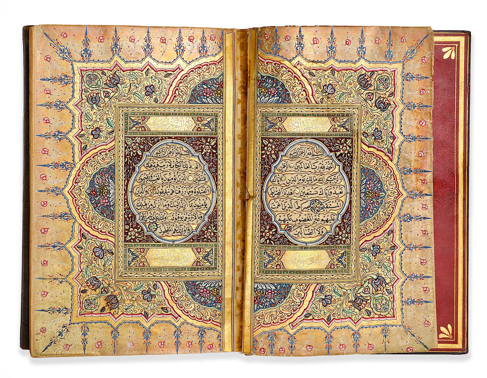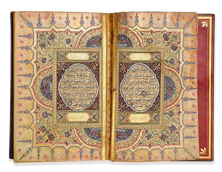 A complete Quran, Arabic manuscript on cream paper, each page with 15 lines written in black naskh script within gold and red rules, gold roundel verse markers outlined in polychrome dots. Surah headings in white thuluth script on a gilt ground within a decorated panel, gold and polychrome marginal floral motifs indicating the 'Juz'. Opening folio heavily with gilt and polychrome decoration framing 7 lines of black naskh script in clouds reserved against a sprinkled gold ground. Final folio signed by 'written by al-Faqir Hafiz Ismail Hakki student of Ali Al-Ramzi 1272 AH/1855 AD' within a roundel on a gilt and polychrome decorated ground.