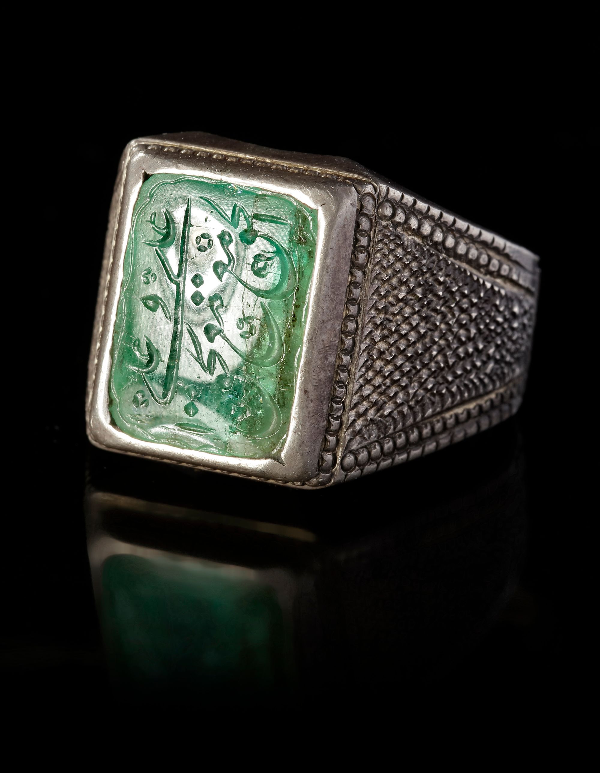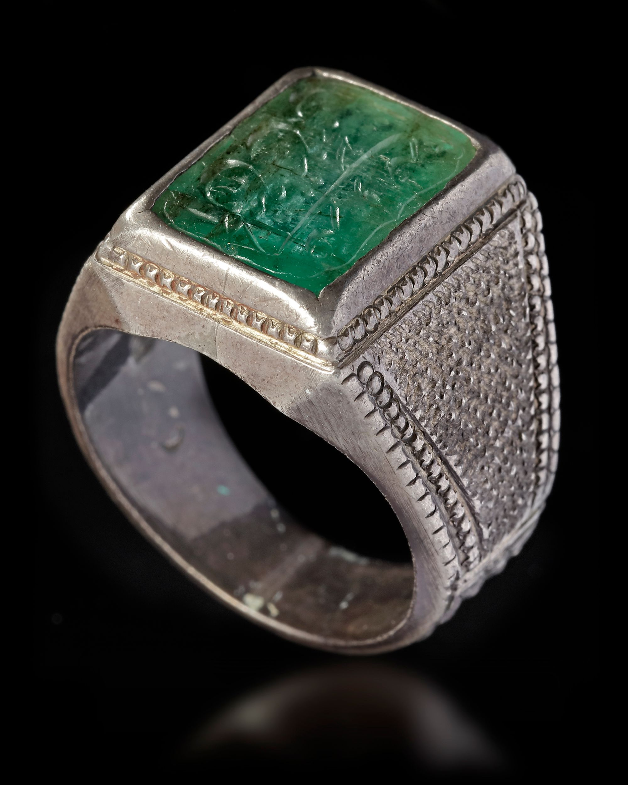 An Emerald seal of rectangular shape, set in silver ring engraved with the text "الحق مع علي وعلي مع الحق, The truth is with Ali and Ali is with the truth".