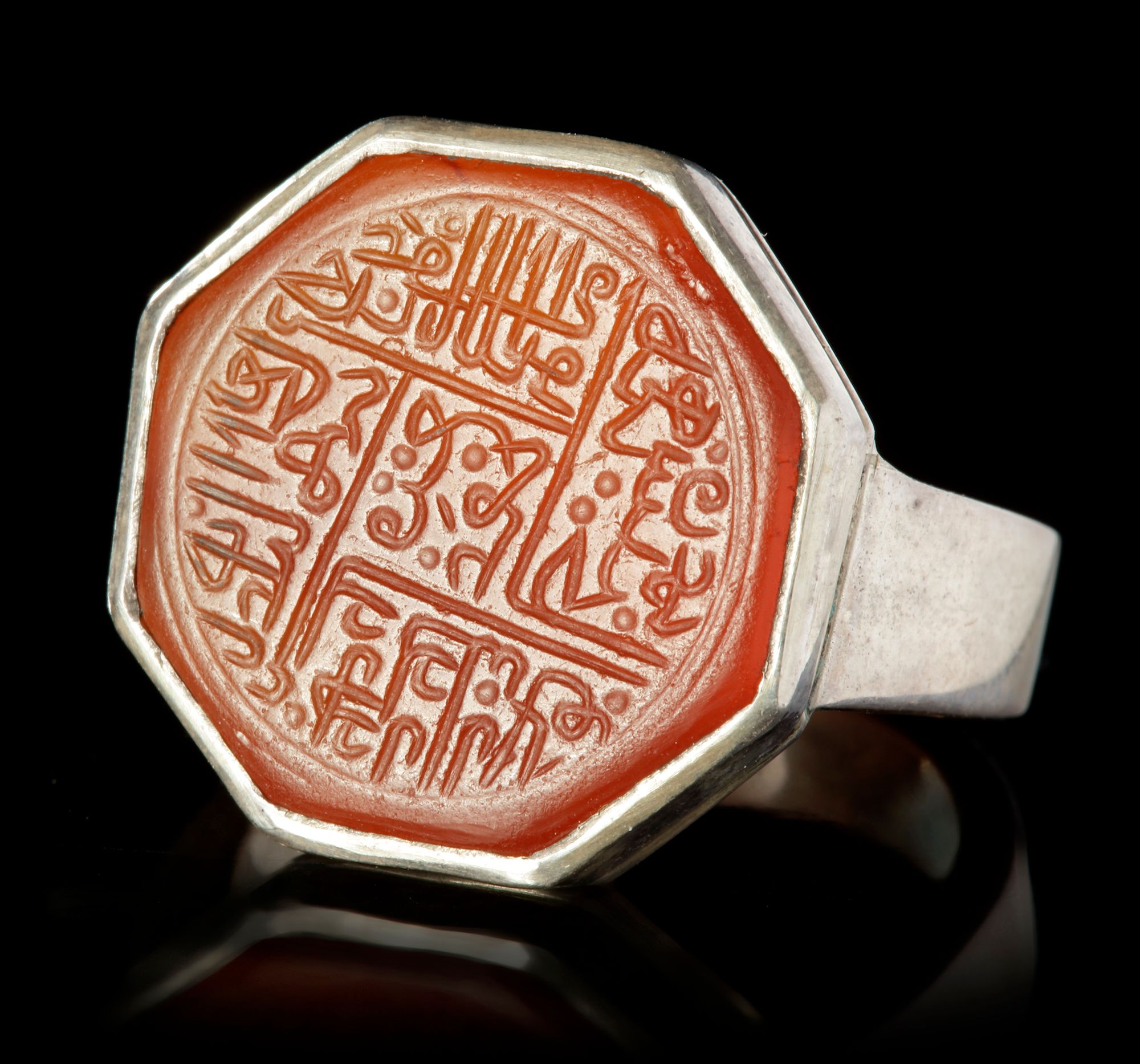 An agate seal of octagonal shape, set in silver ring engraved with the text "نداء علي مظهر العجائب, Nada Ali" in nastali'q script.