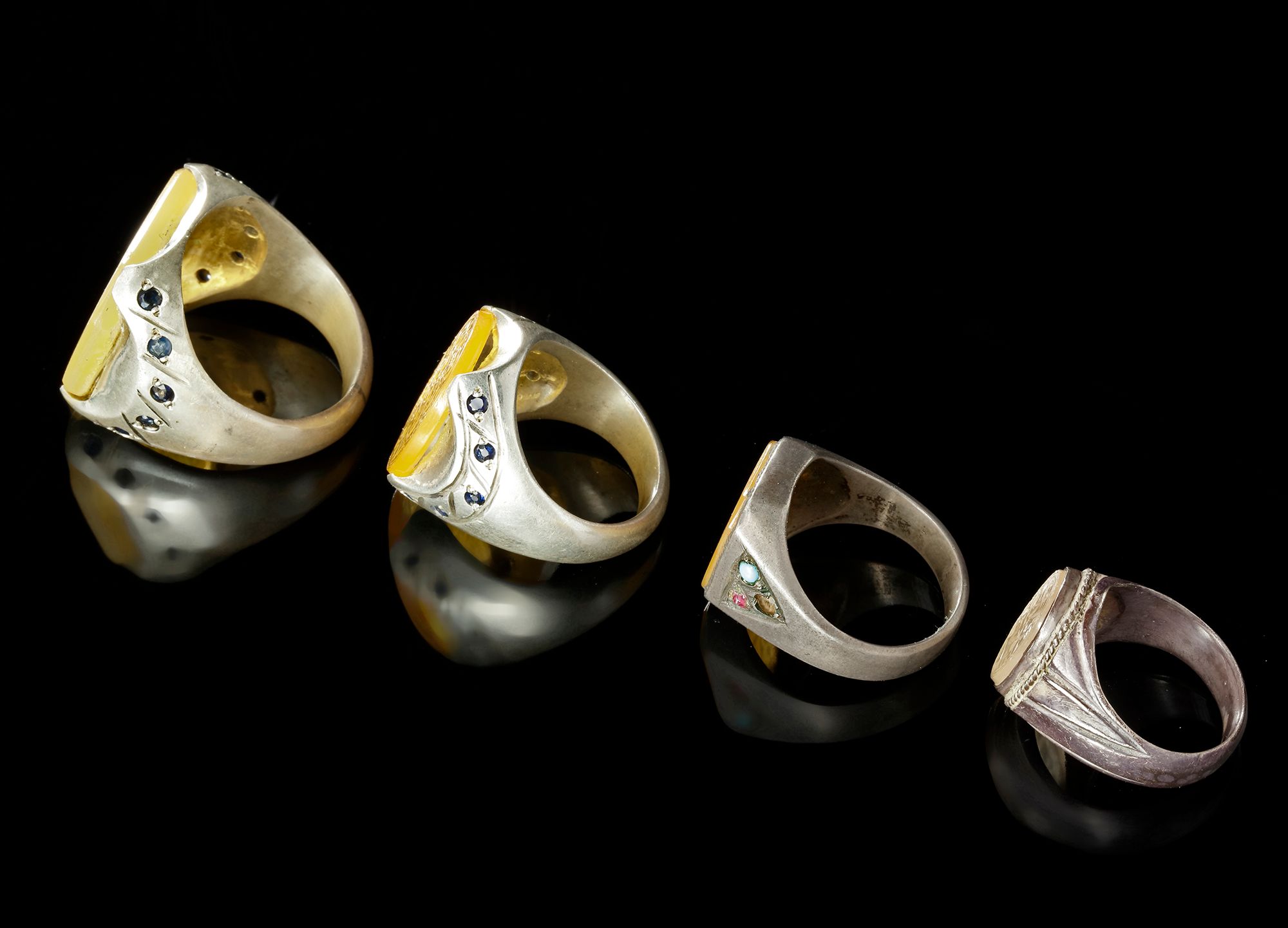 An agate seal of octagonal shape, set in silver ring and engraved with the text "بهلوي ولد شيخ رحيم, Pahlavi Bin Sheikh Rahimi "in nastali'q script. 1222 AH/ 1807 AD Size: 31 Weight: 24.35 grams.