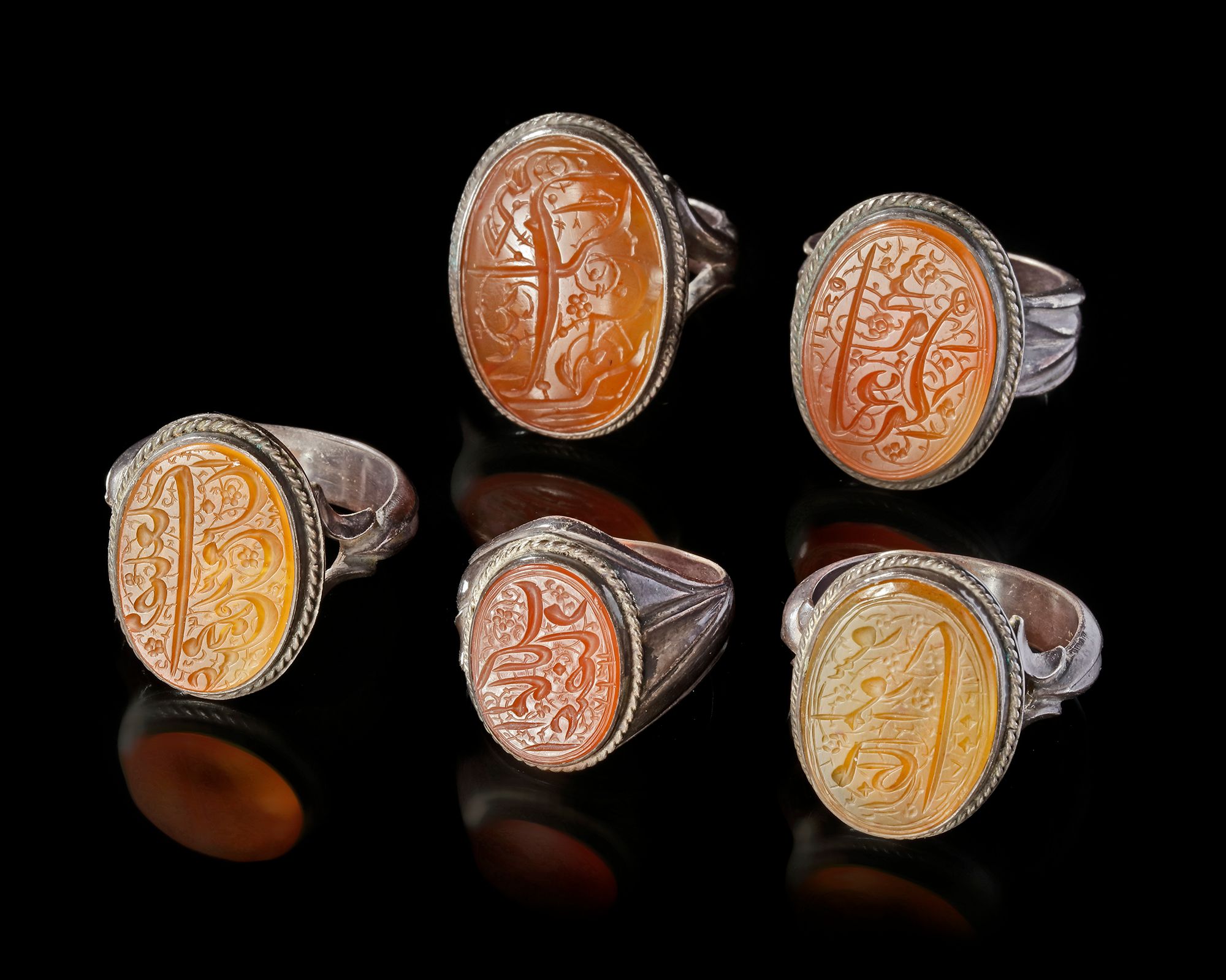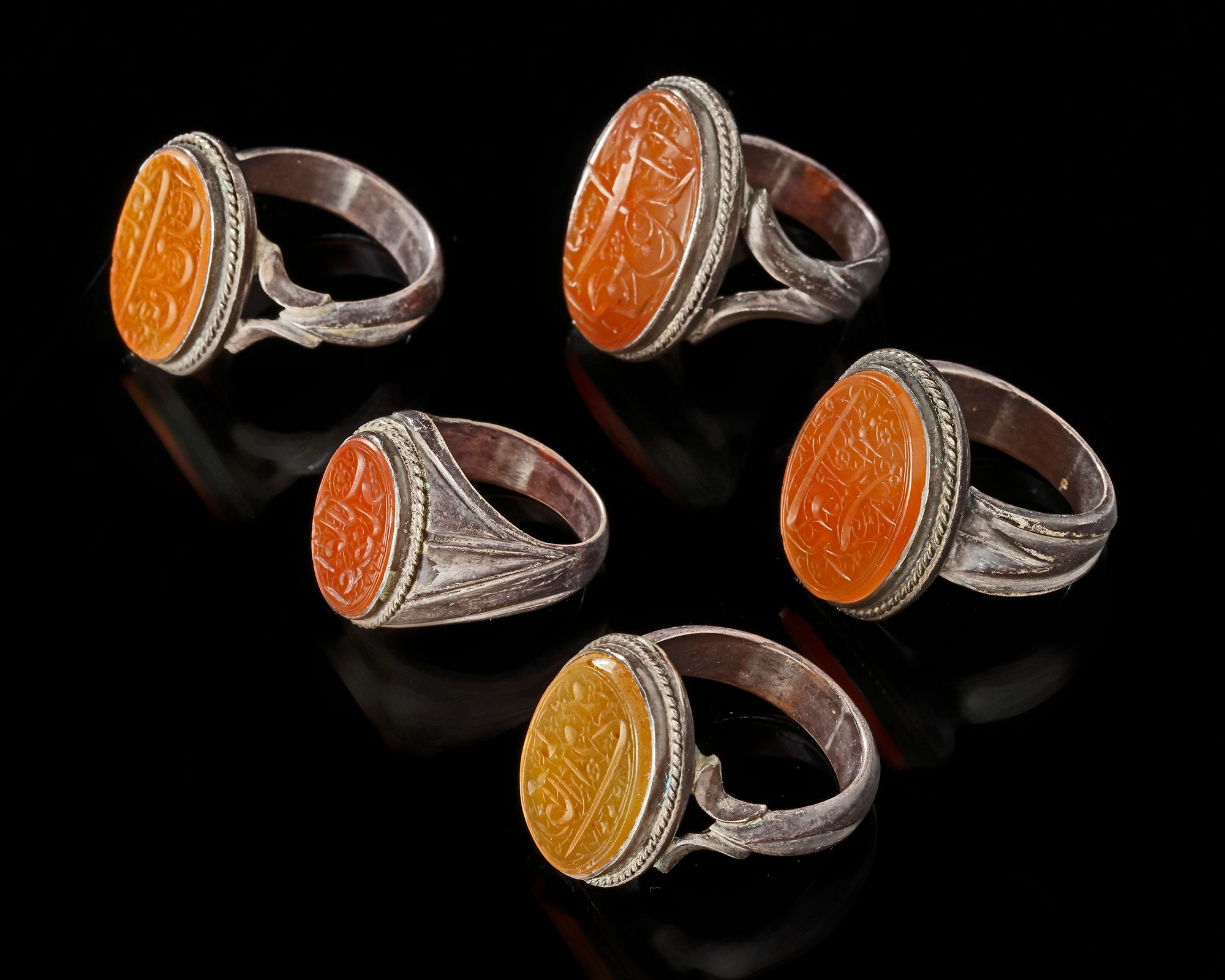 An agate seal of oval shape, set in silver ring engraved with the text "رضي الله على عبده محمد بن الربيع, May Allah be pleased with his servant Muhammad bin Al-Rabi` in nastali'q script.