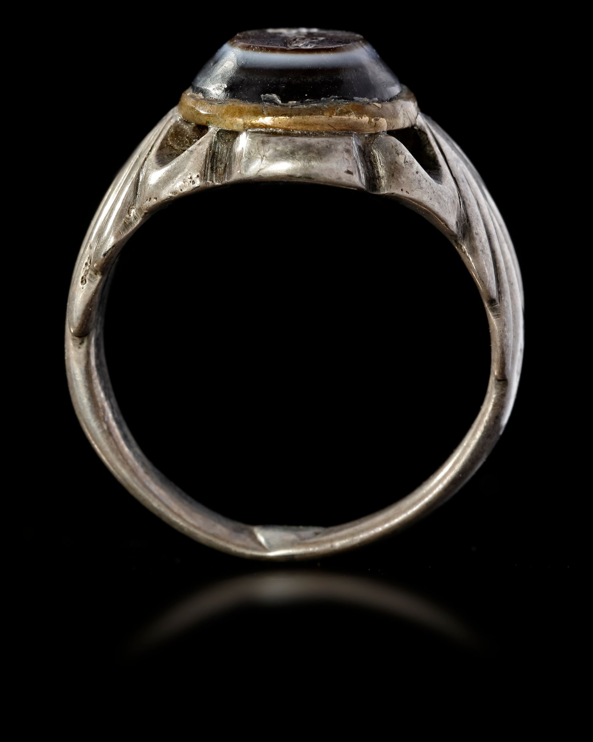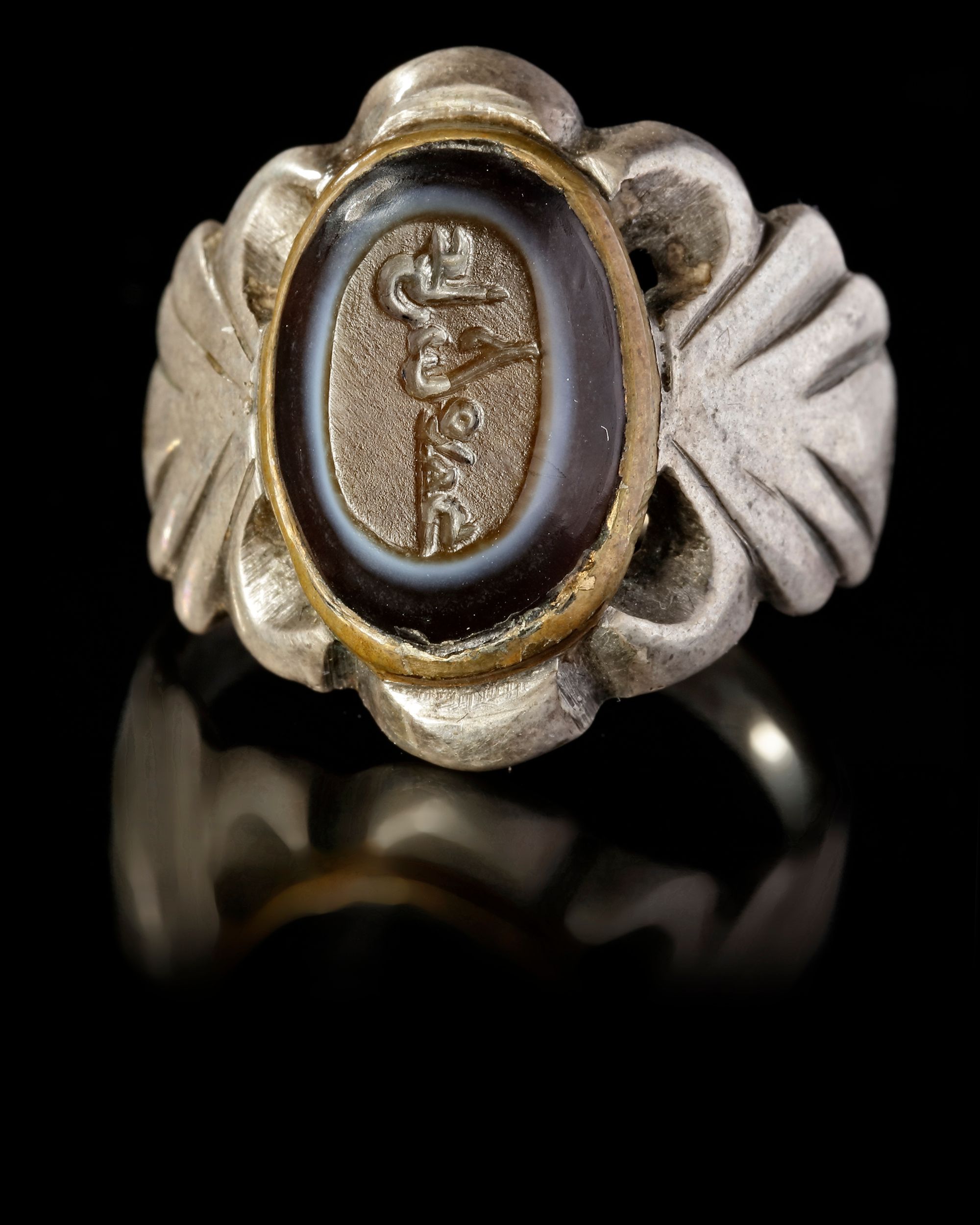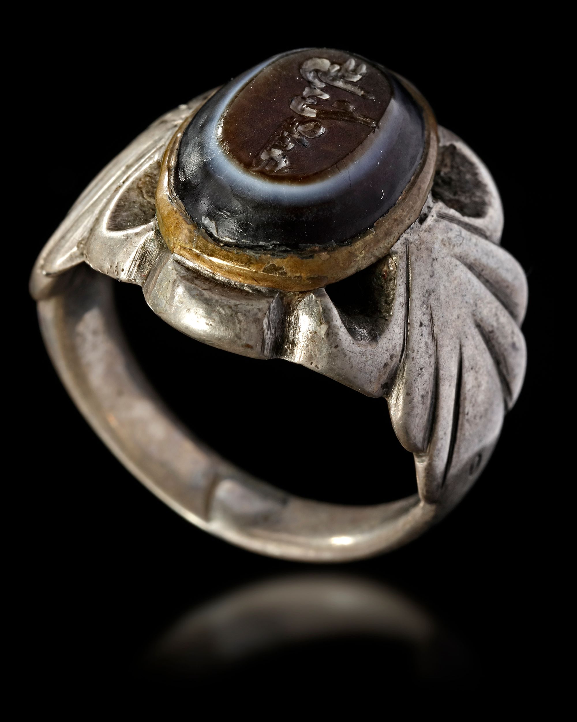 An agate seal of oval shape, set in a silver ring engraved with the text "علي بن محمد, Ali bin Mohammed". 4th AH/11th AD century