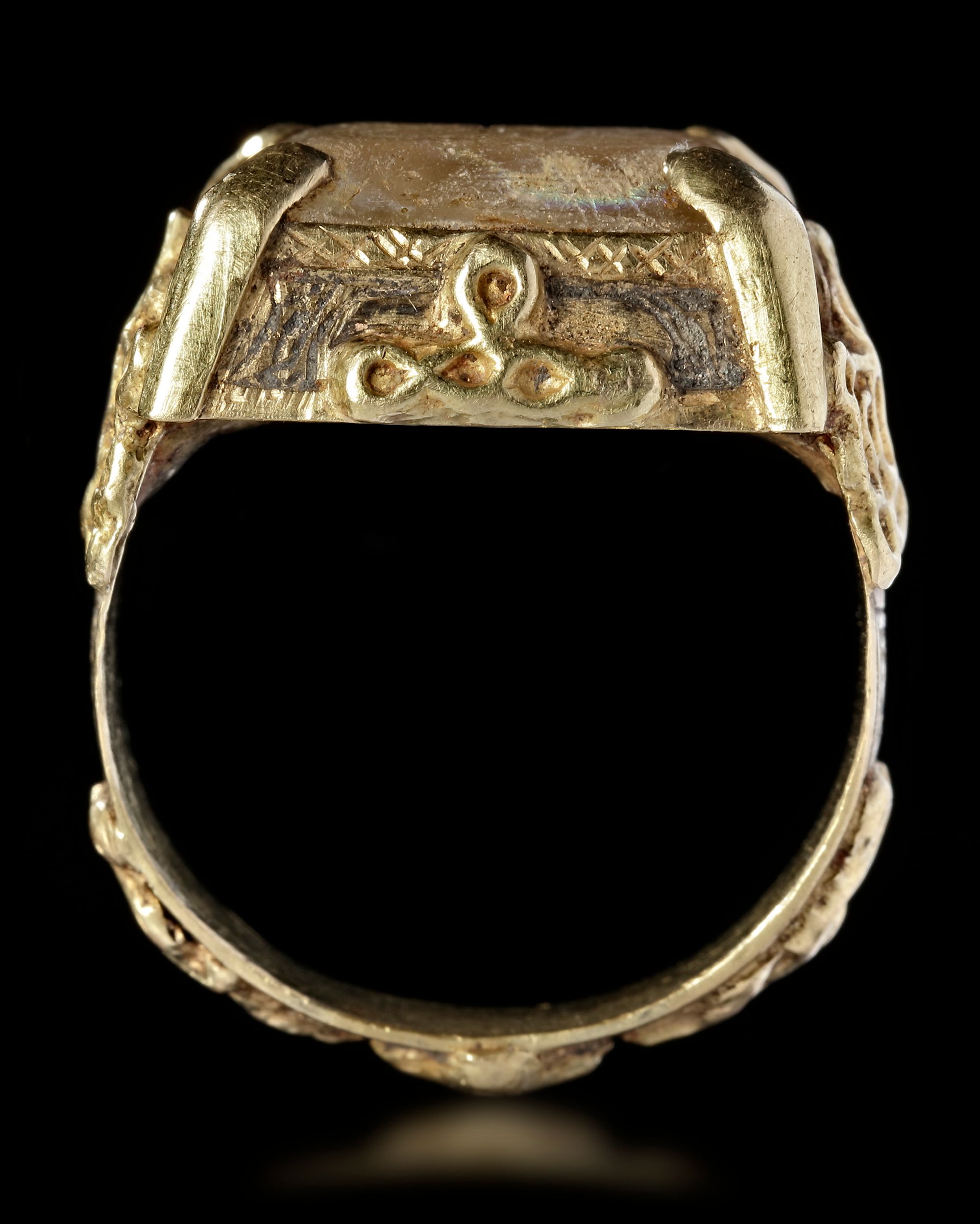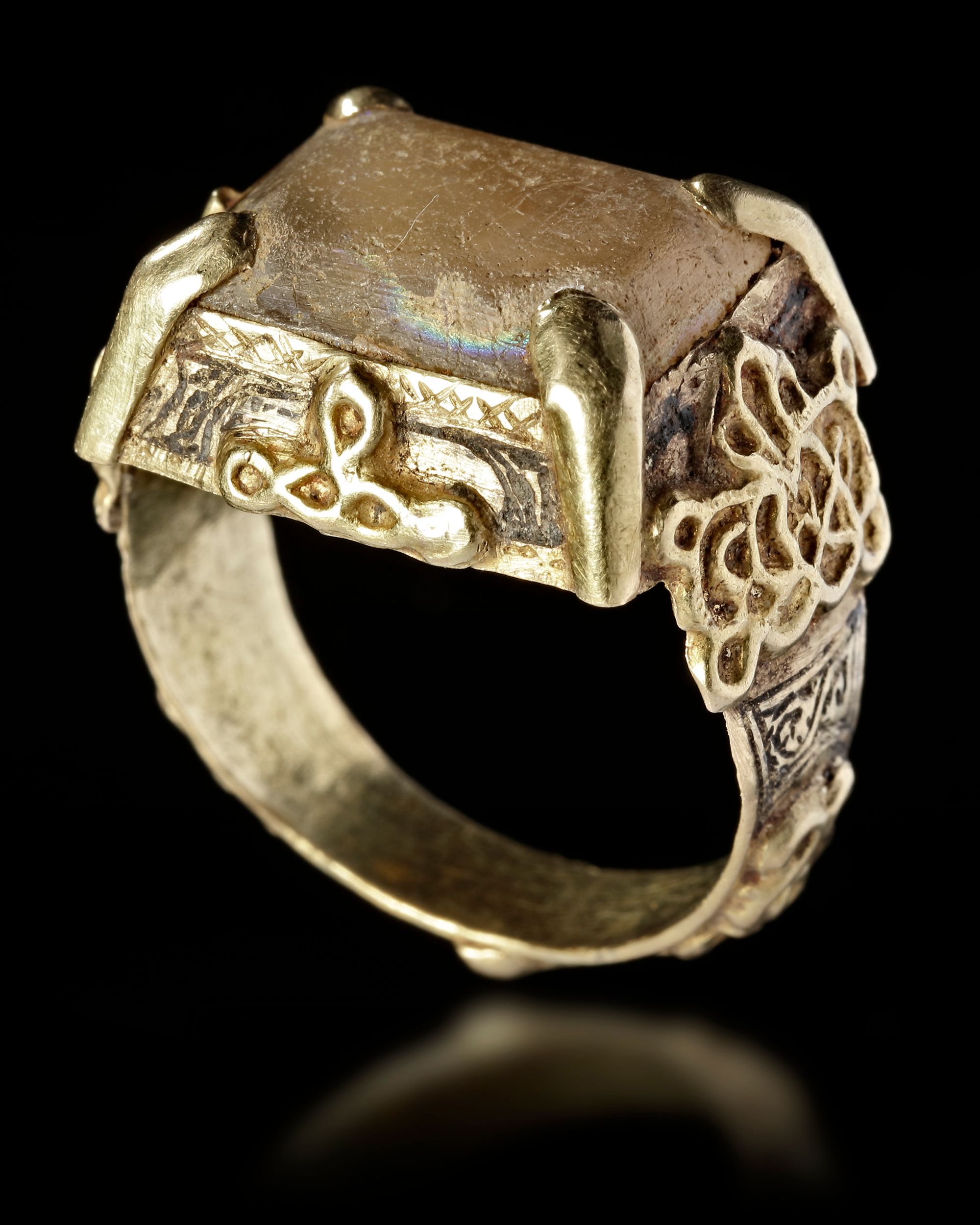 An agate seal of rectangular shape, set in gold ring decorated with floral motifs. 6th AH/13th AD century