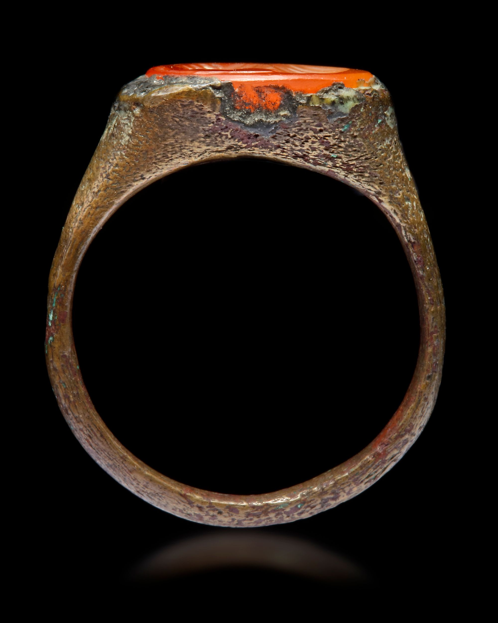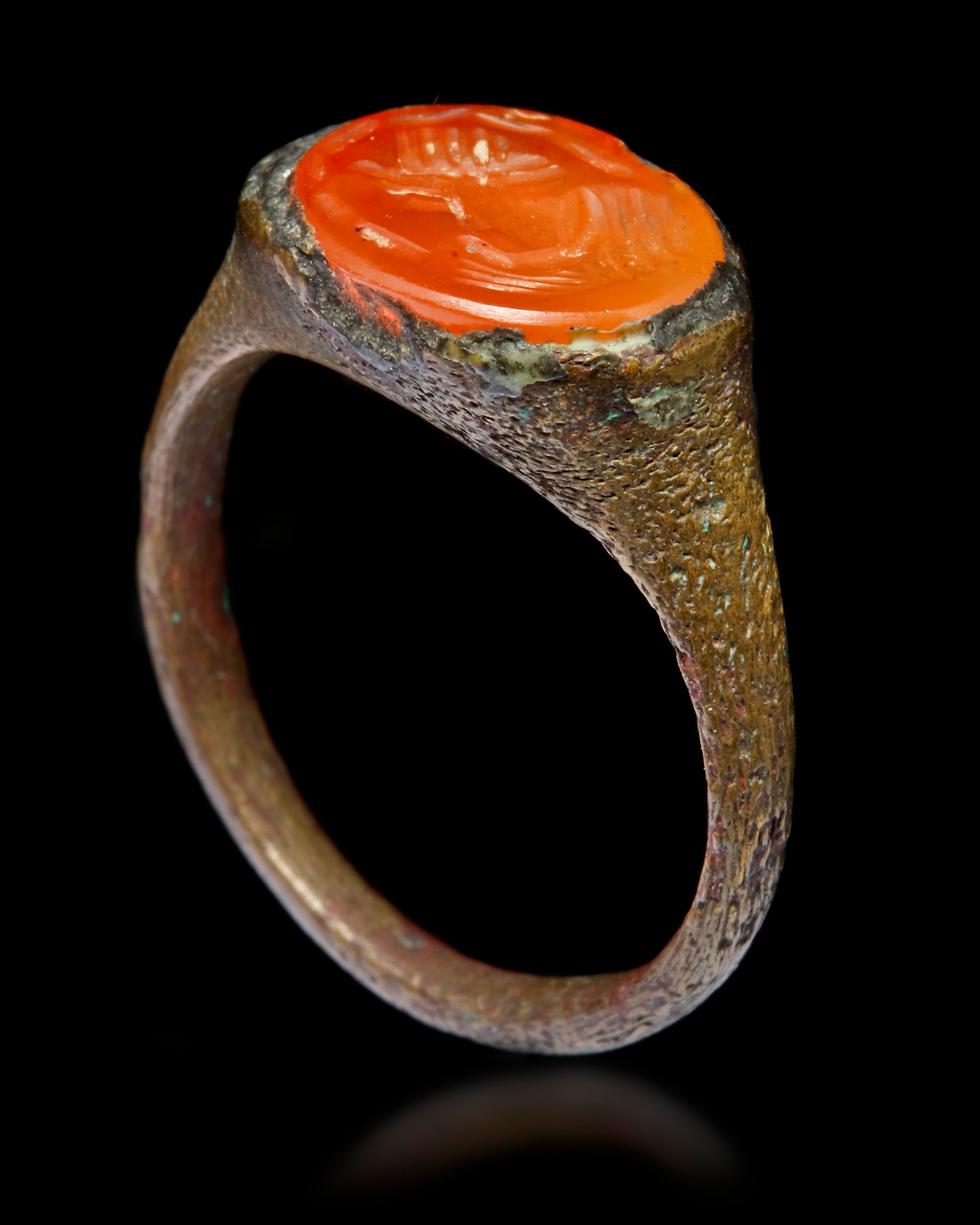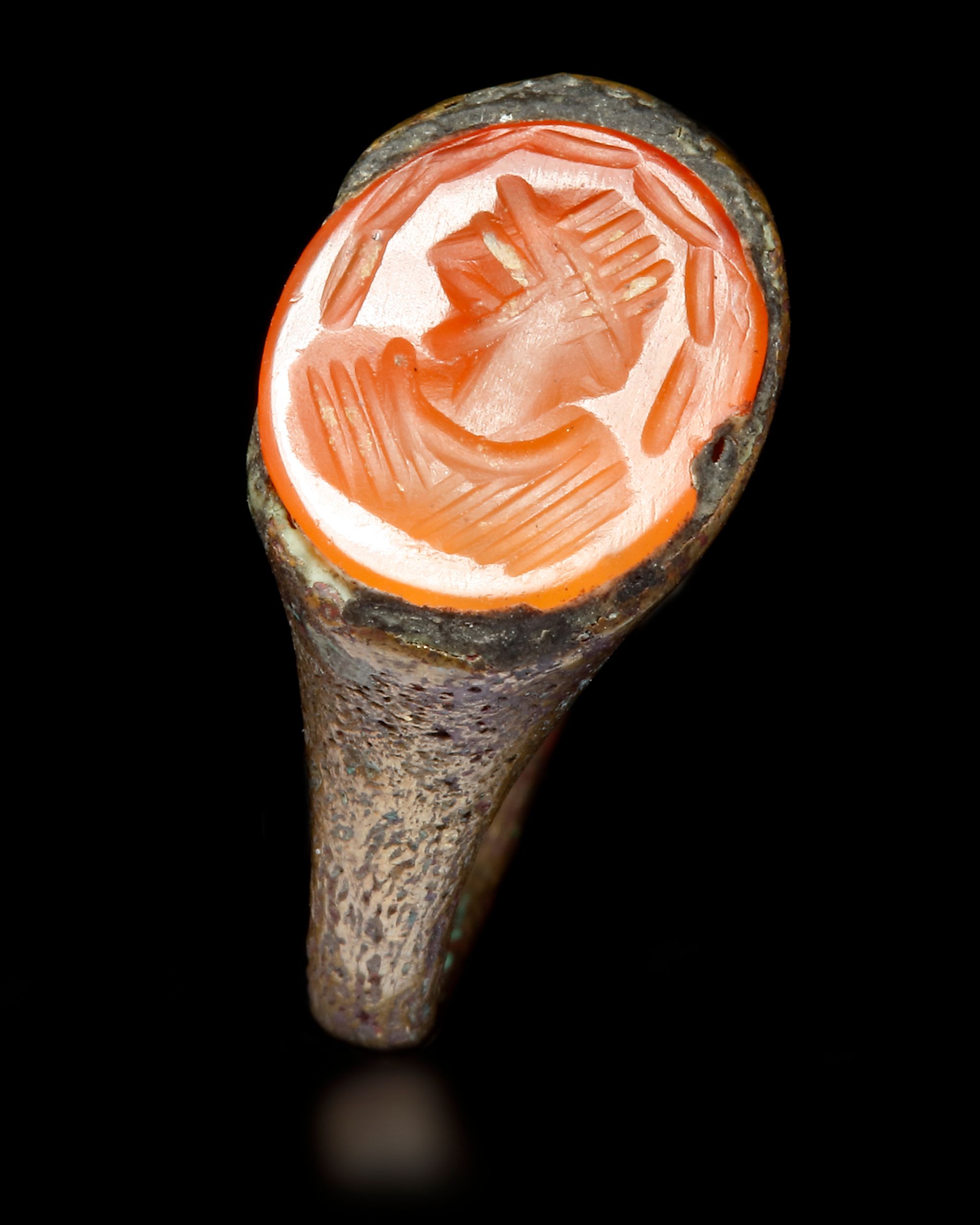 An agate seal of oval shape, set in a silver ring engraved with a Sassanian figure. 1st AH-7th/8th AD century