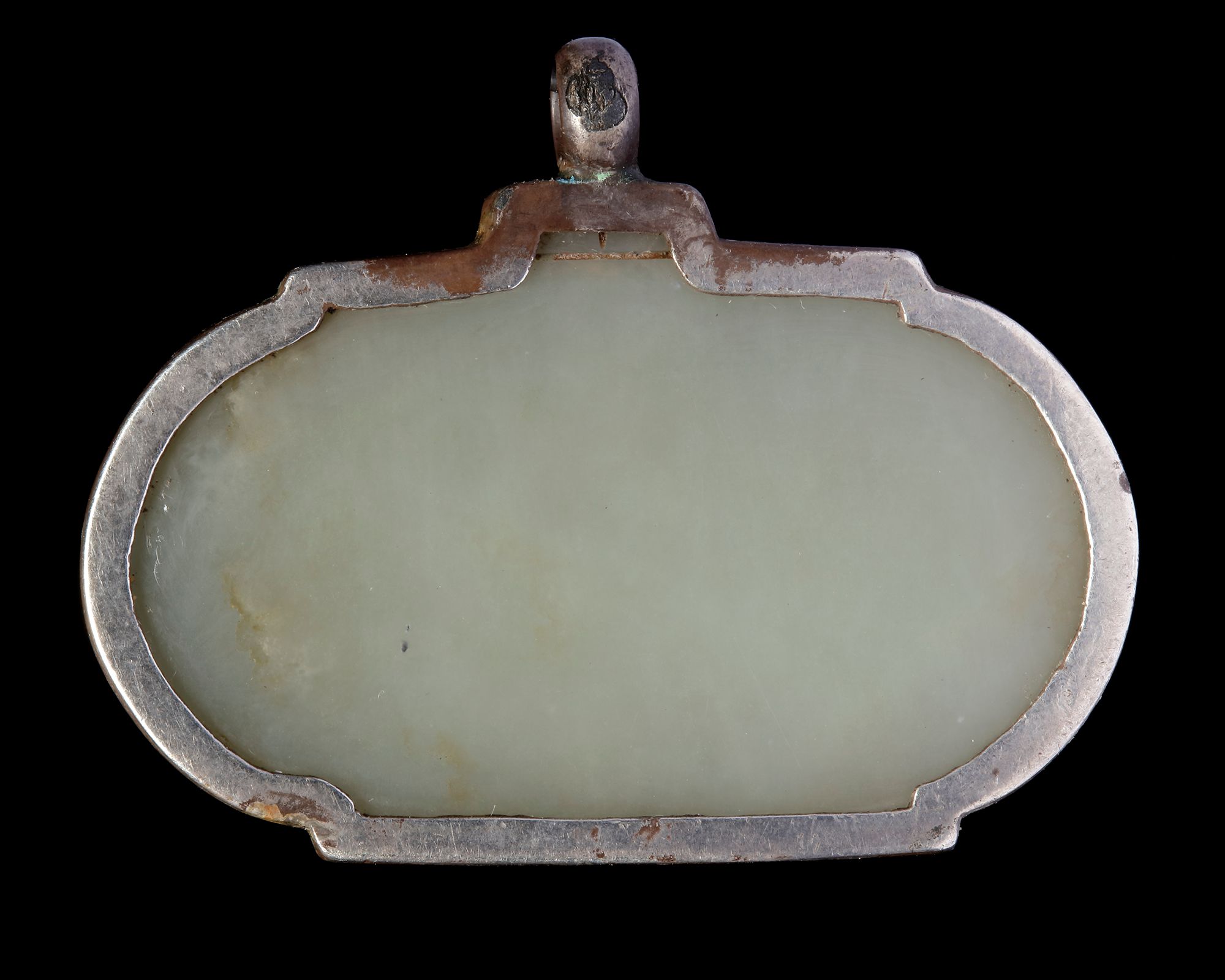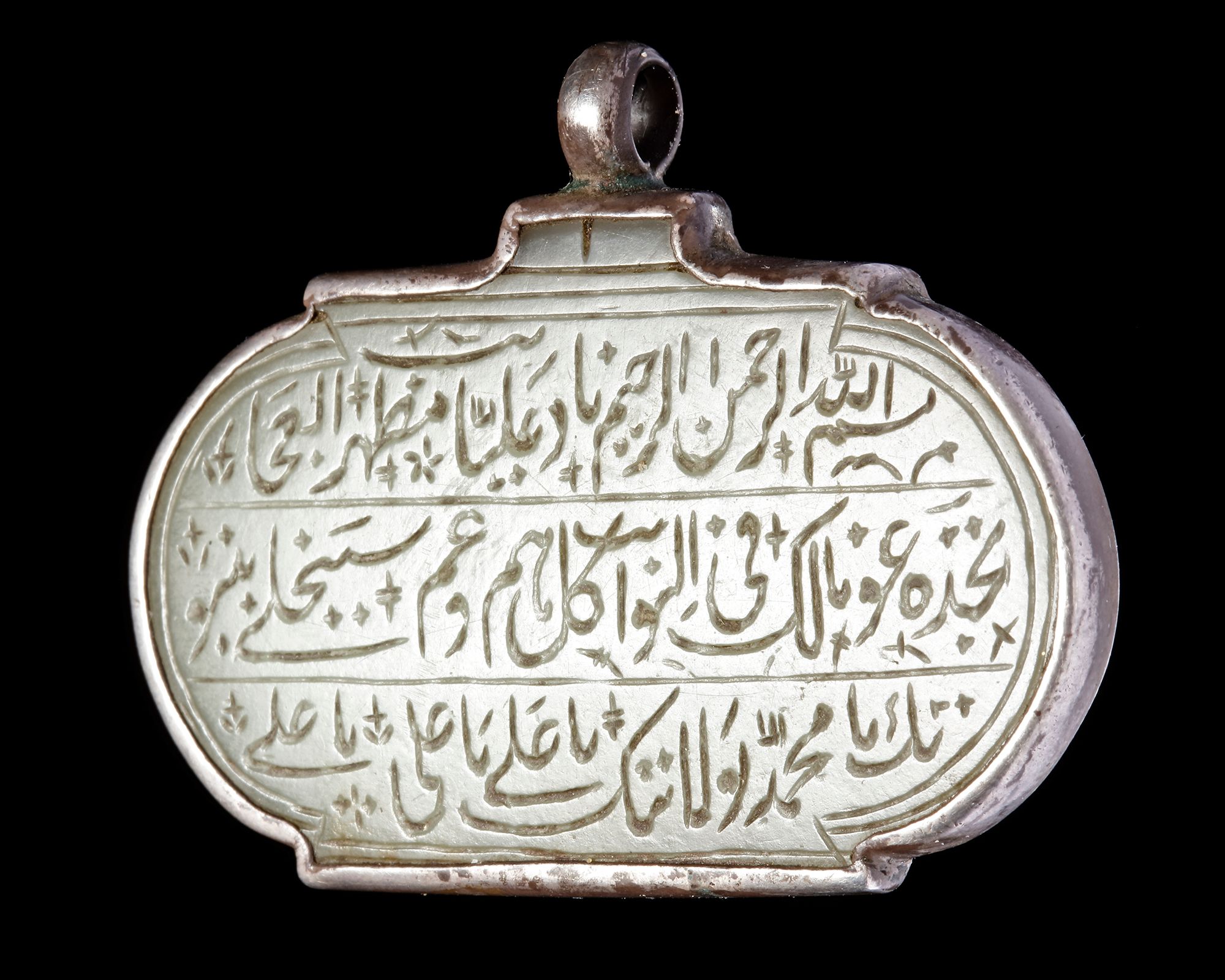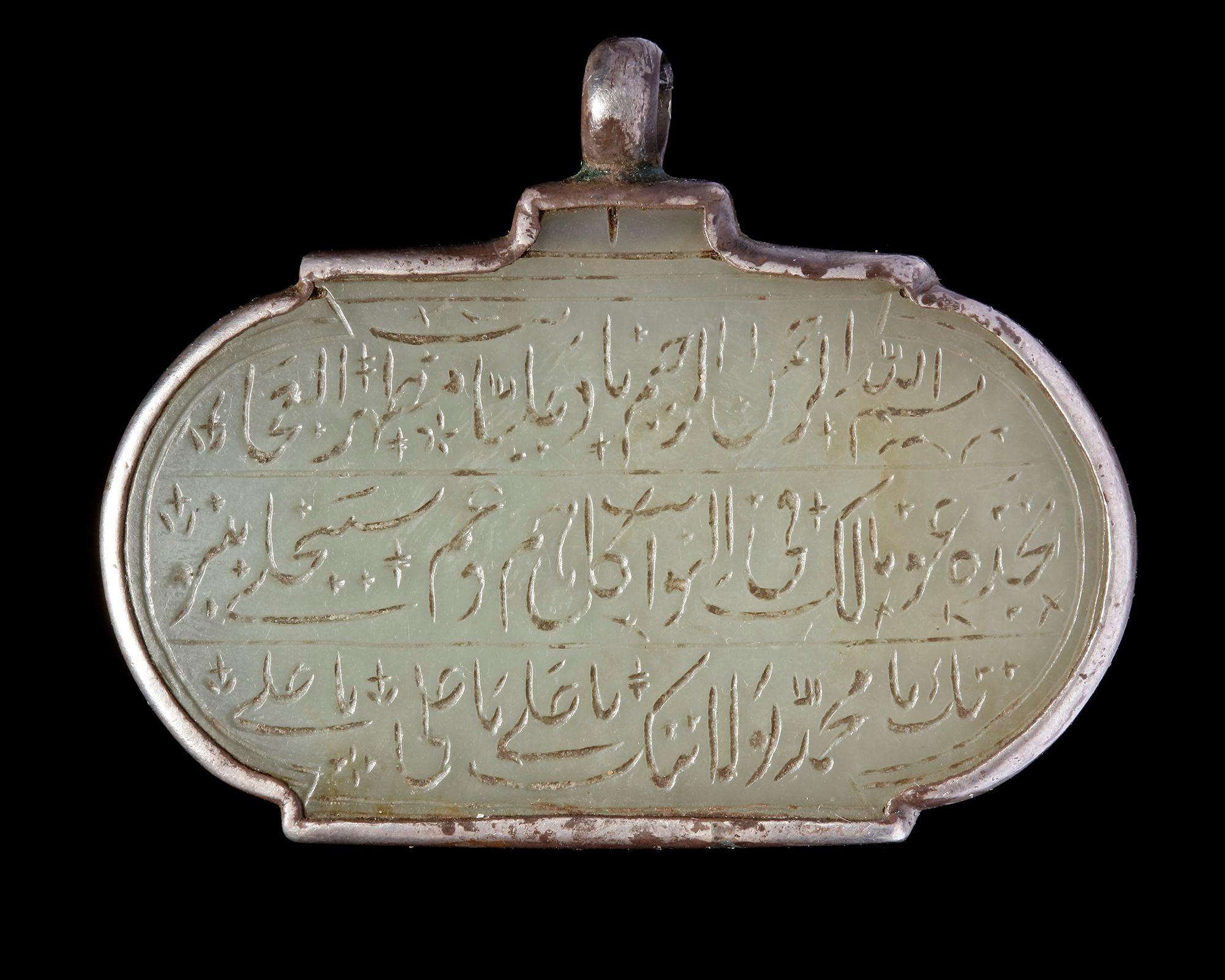 A jade pendant of oval shape, set in silver mounting, engraved with the text "نادى علي مظهر العجائب, Nada ali " in nastali'q script.