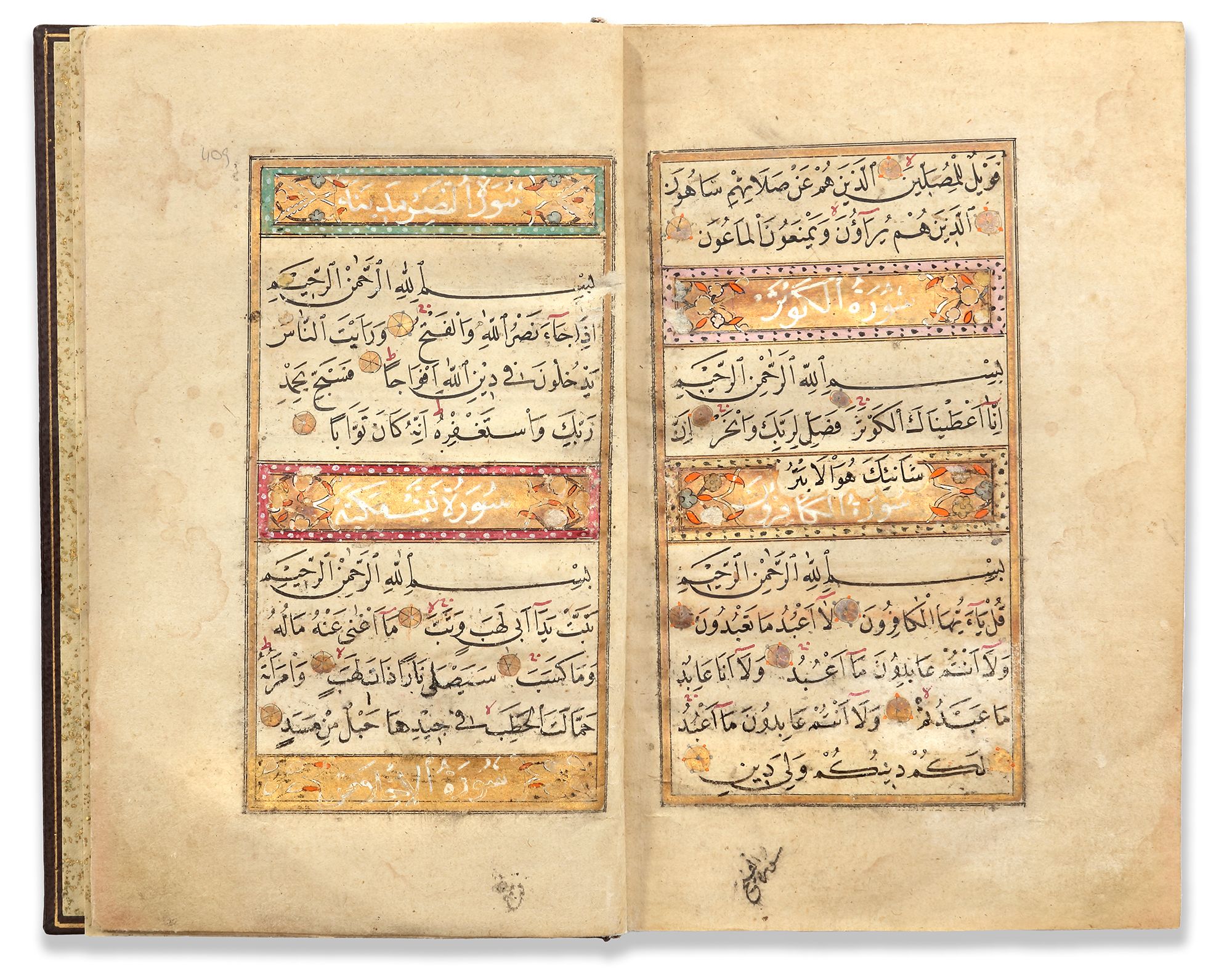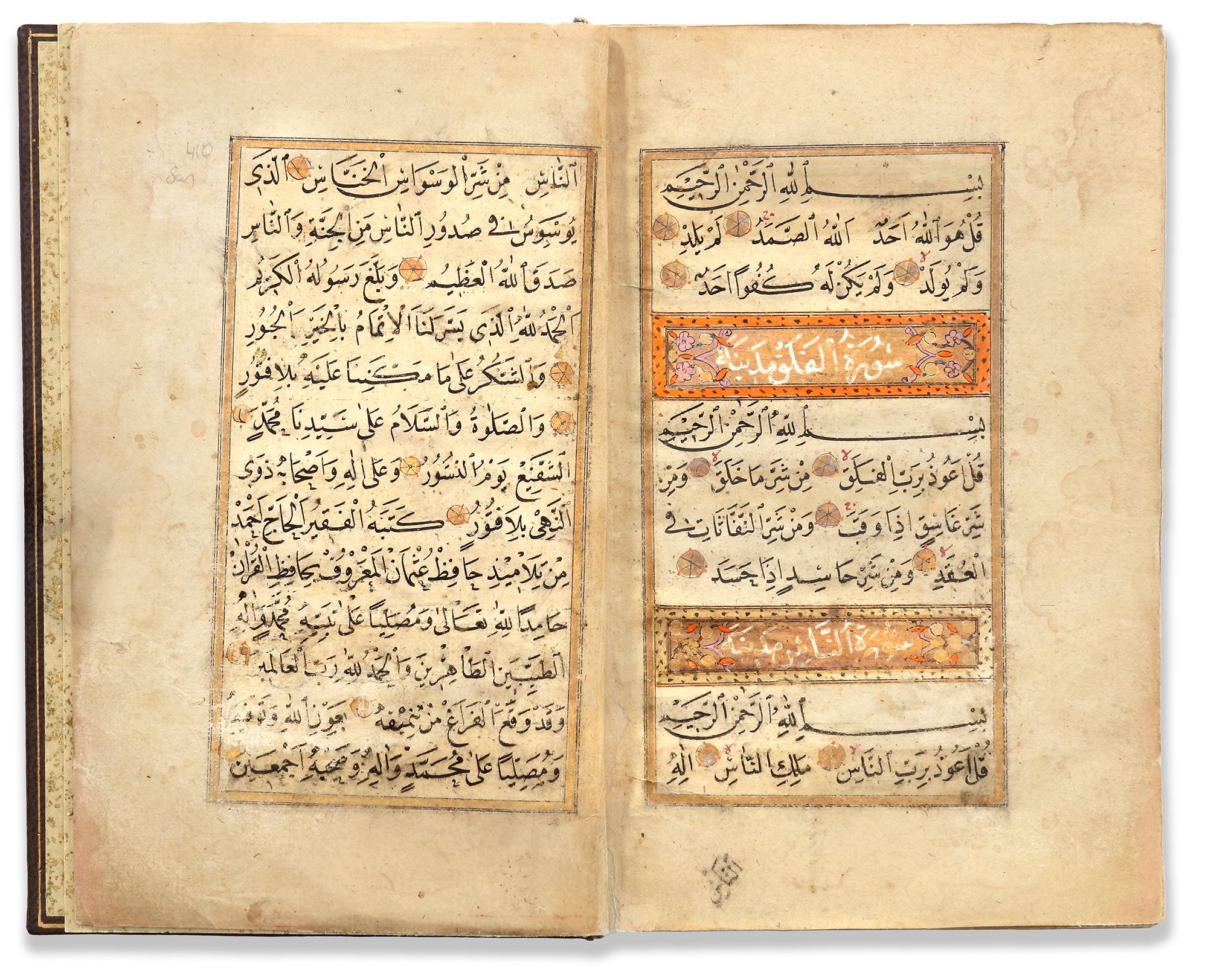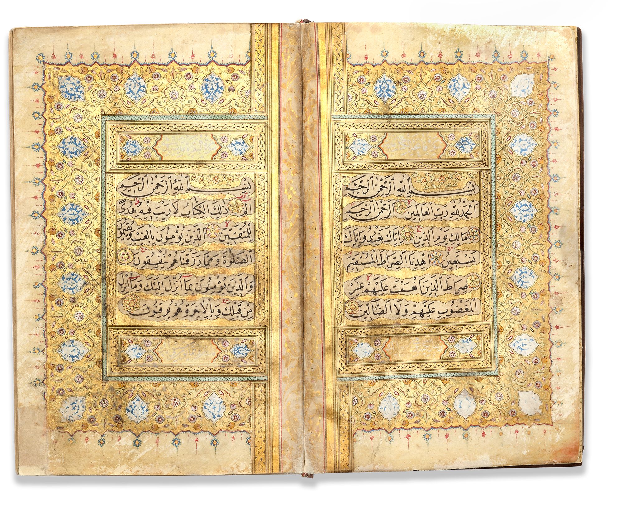 Arabic manuscript on paper, 410 leaves, each folio with 13 lines of elegant black naskh script, diacritics and vowels in red, gold roundel verse markers outlined in black with polychrome dots, large gilt and polychrome floral marginal 'juz' and hizb medallions', text within gold and black rules. Surah headings in white thuluth script on cartouches with polychrome floral illuminated ground, two opening bifolia fully illuminated in gold and polychrome framing 7 lines of black naskh script in clouds reserved against a sprinkled gilt ground. The last page with a prayer for completion of the recitation of the Quran (Dua'a al-khatm) and signed 'written by al-Fakir Ahmed student of Hafiz Osman known by Hafiz al-Quran'.