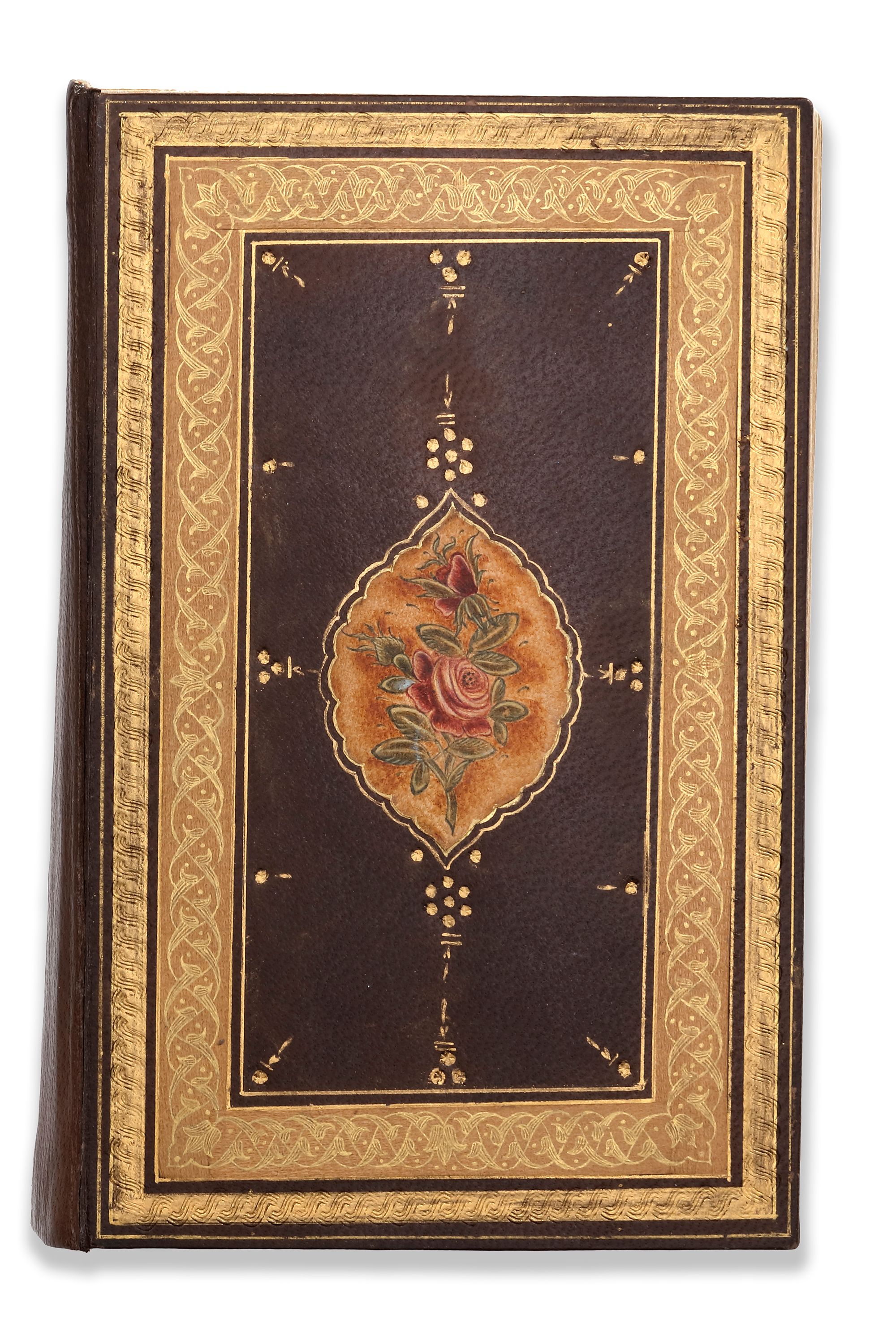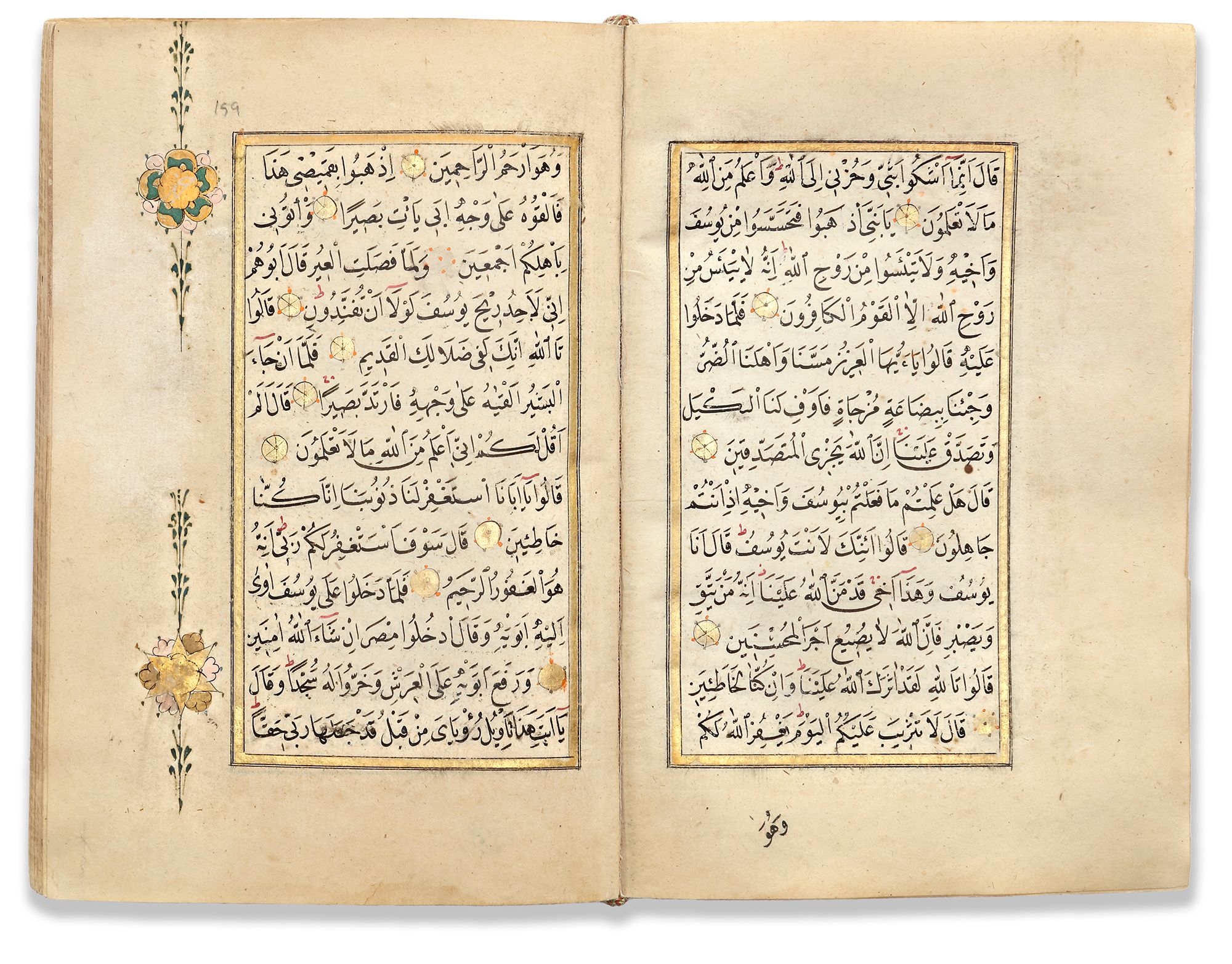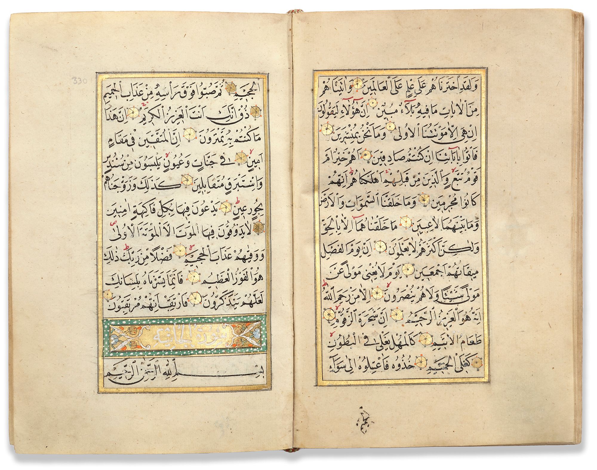 Arabic manuscript on paper, 410 leaves, each folio with 13 lines of elegant black naskh script, diacritics and vowels in red, gold roundel verse markers outlined in black with polychrome dots, large gilt and polychrome floral marginal 'juz' and hizb medallions', text within gold and black rules. Surah headings in white thuluth script on cartouches with polychrome floral illuminated ground, two opening bifolia fully illuminated in gold and polychrome framing 7 lines of black naskh script in clouds reserved against a sprinkled gilt ground. The last page with a prayer for completion of the recitation of the Quran (Dua'a al-khatm) and signed 'written by al-Fakir Ahmed student of Hafiz Osman known by Hafiz al-Quran'.