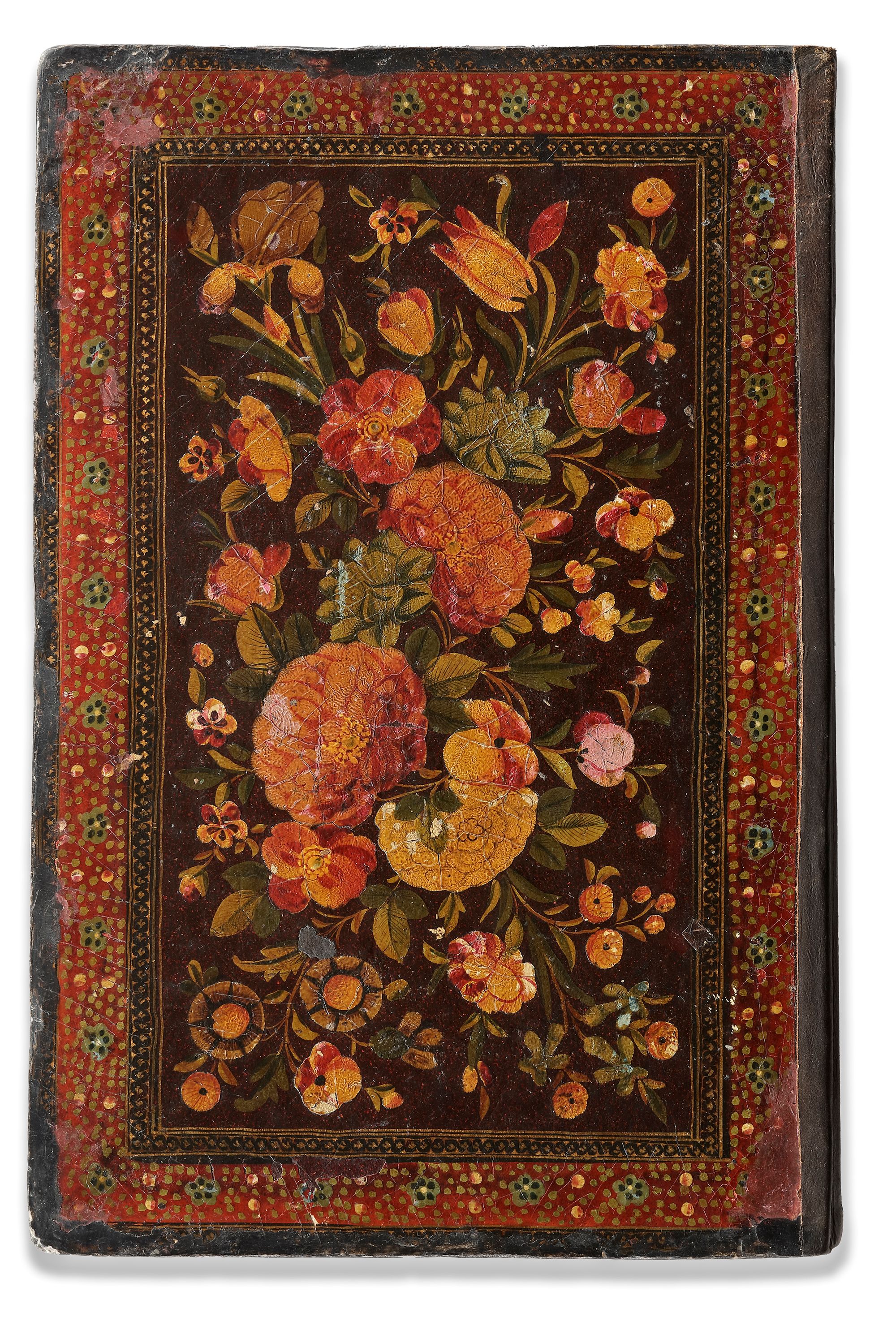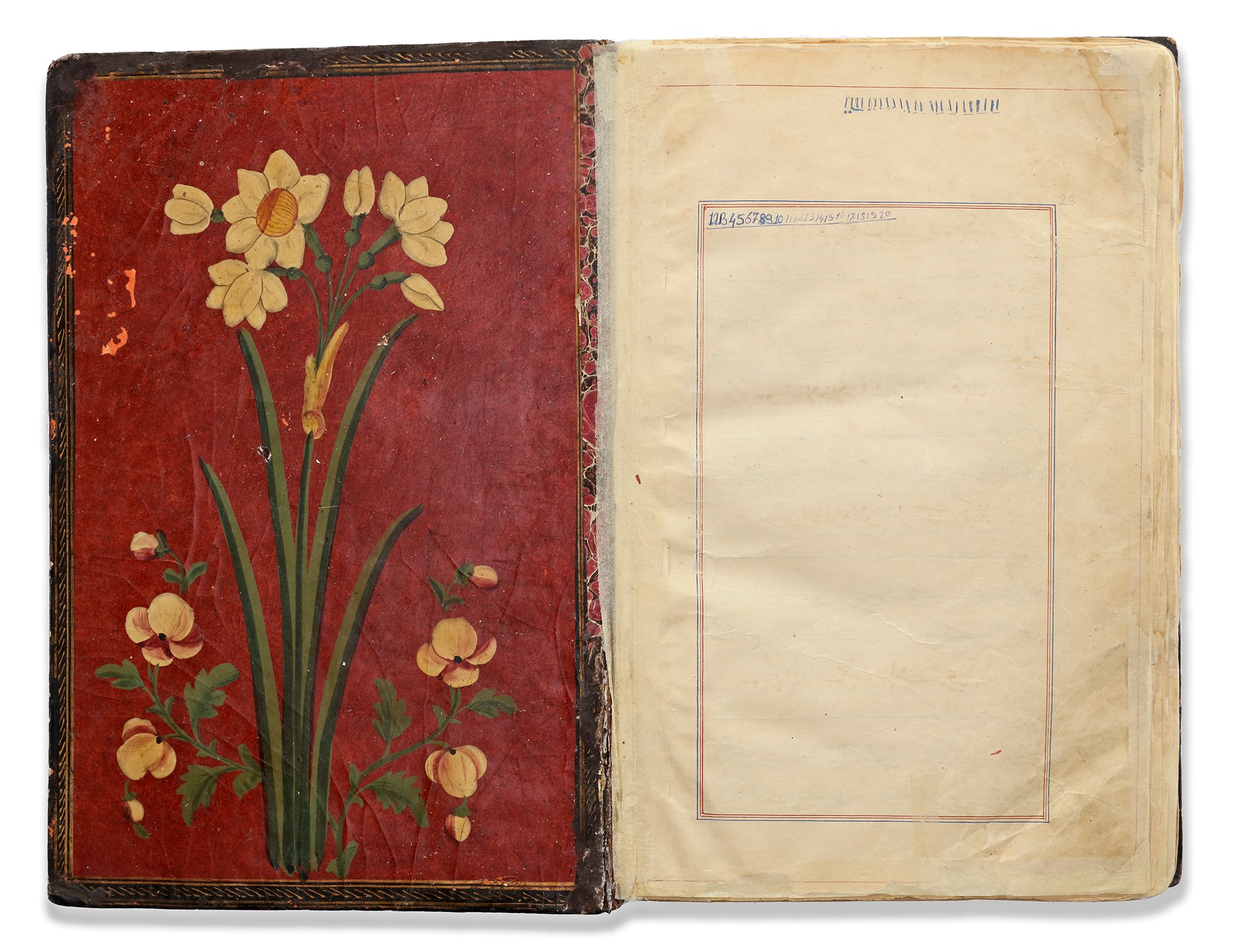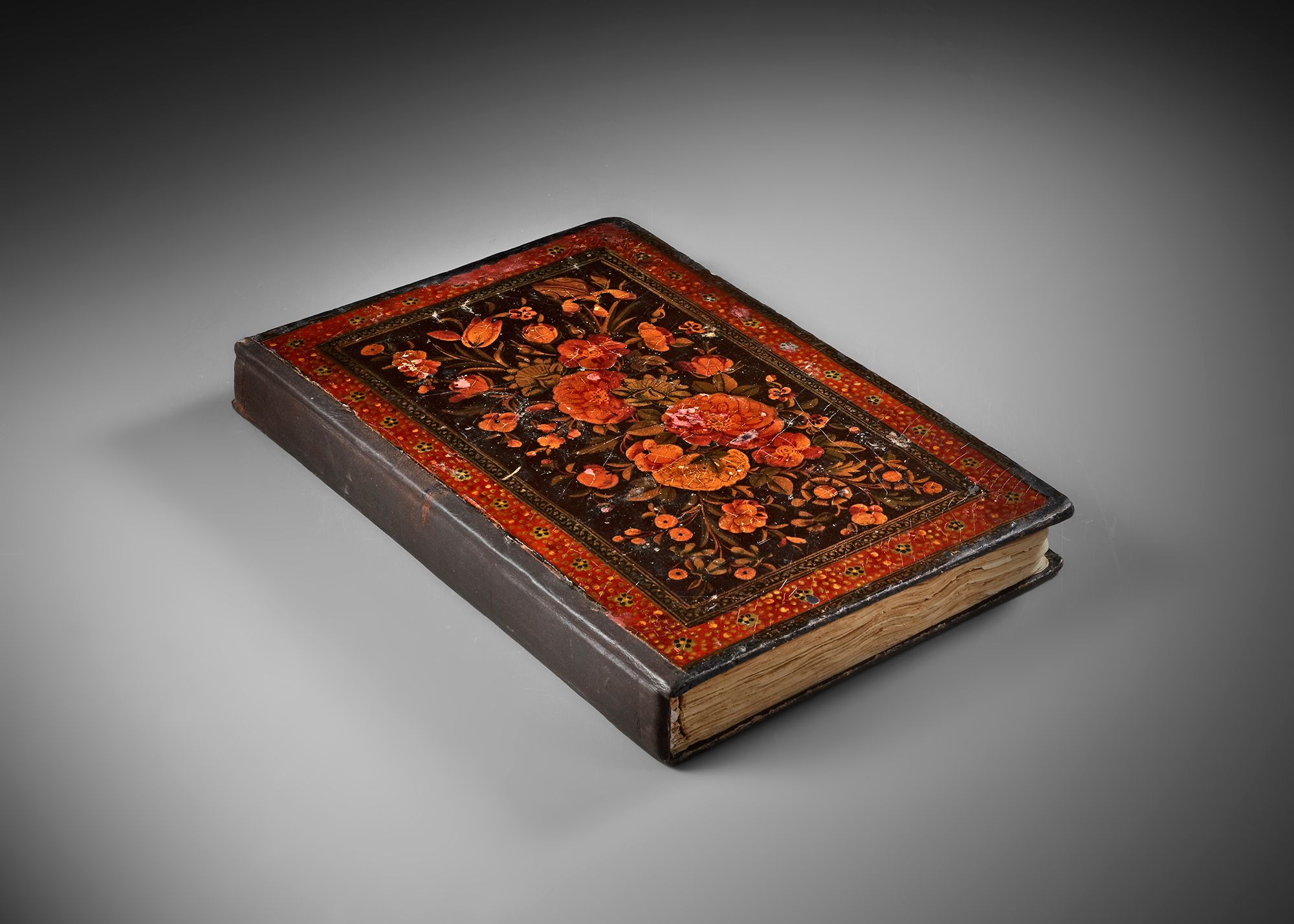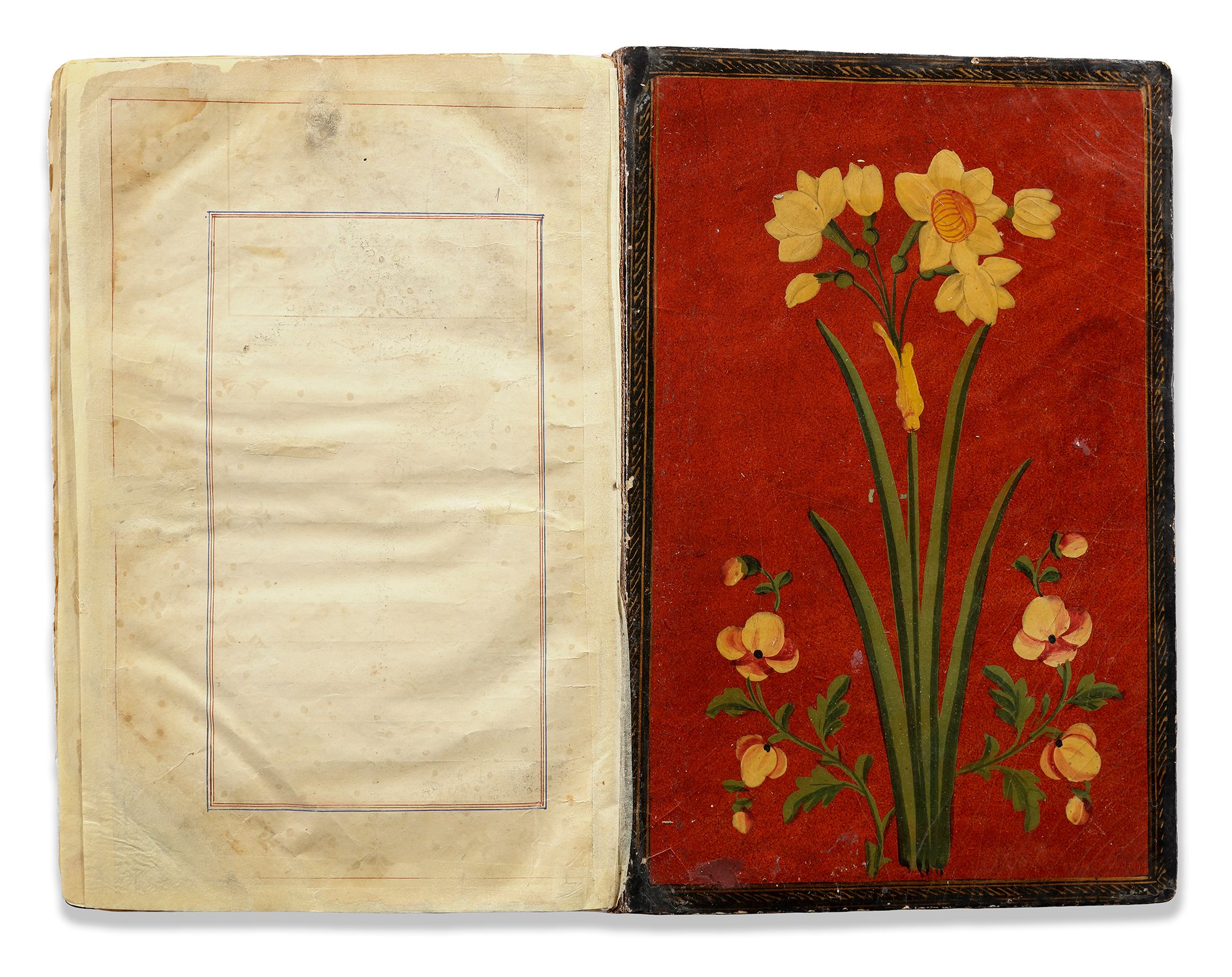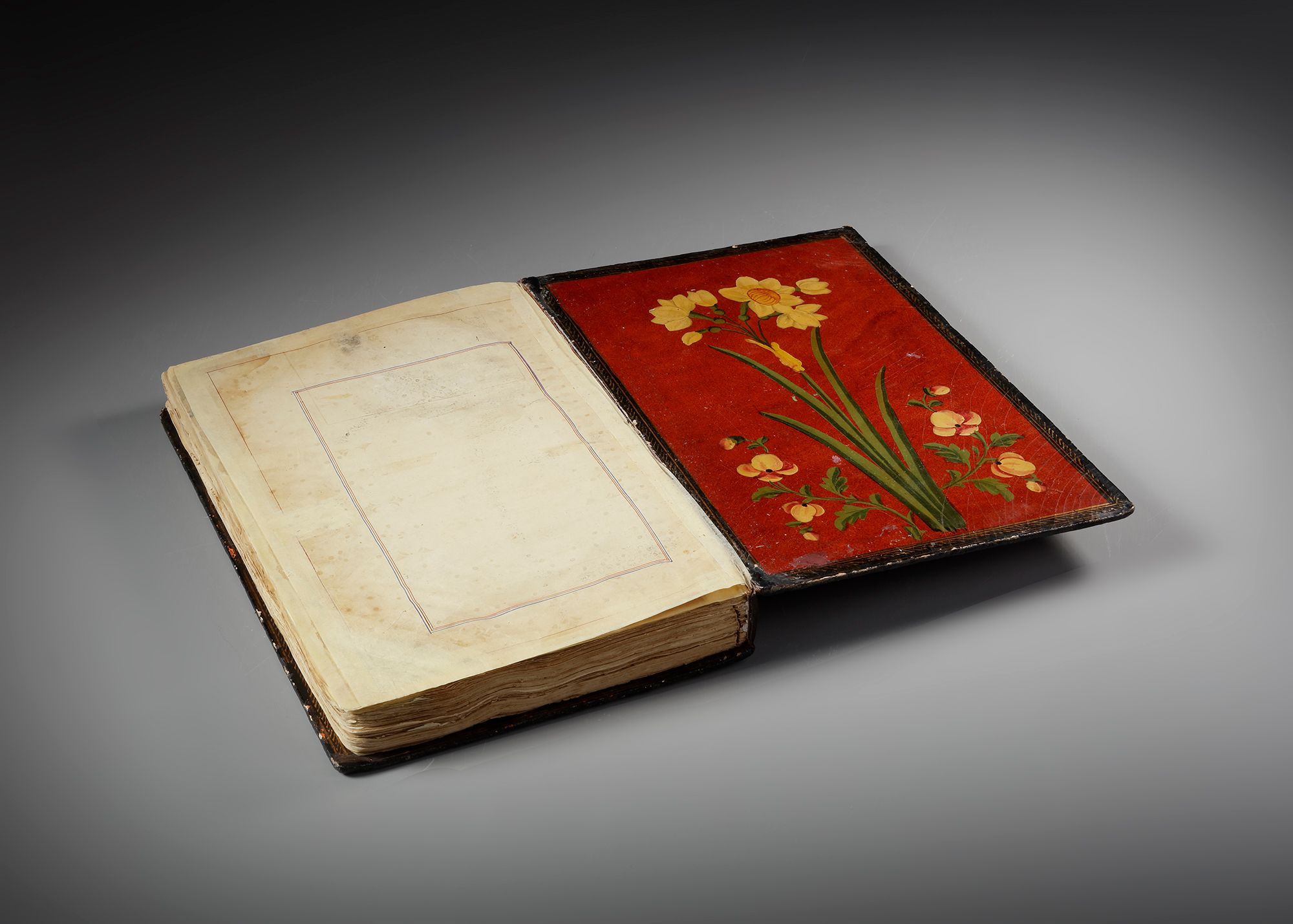 In gilt lacquer binding with central cartouche surrounded by spandrels containing scrolling floral vine.