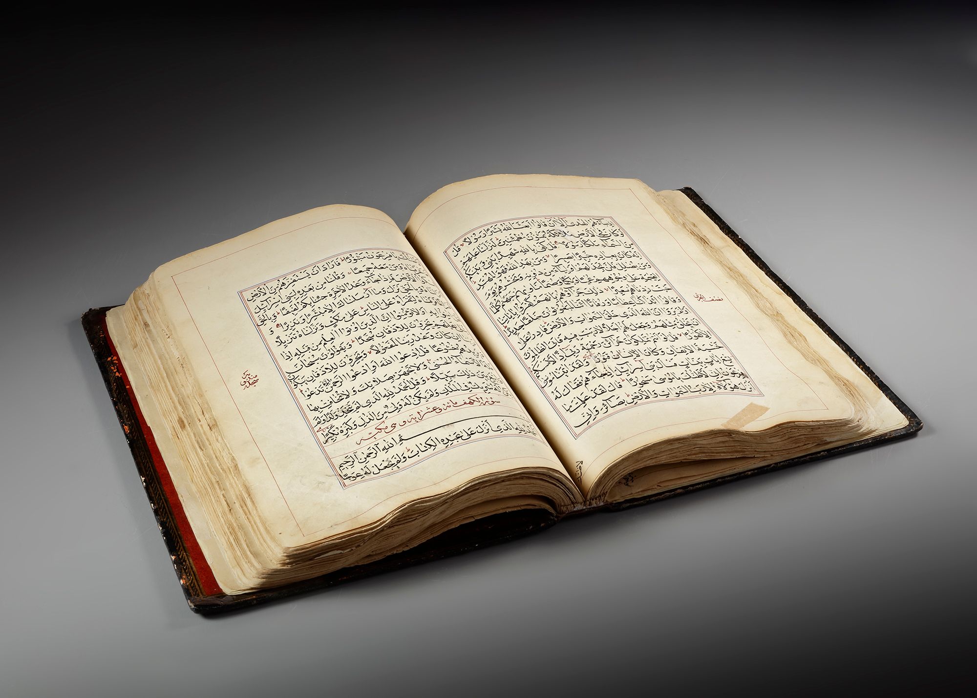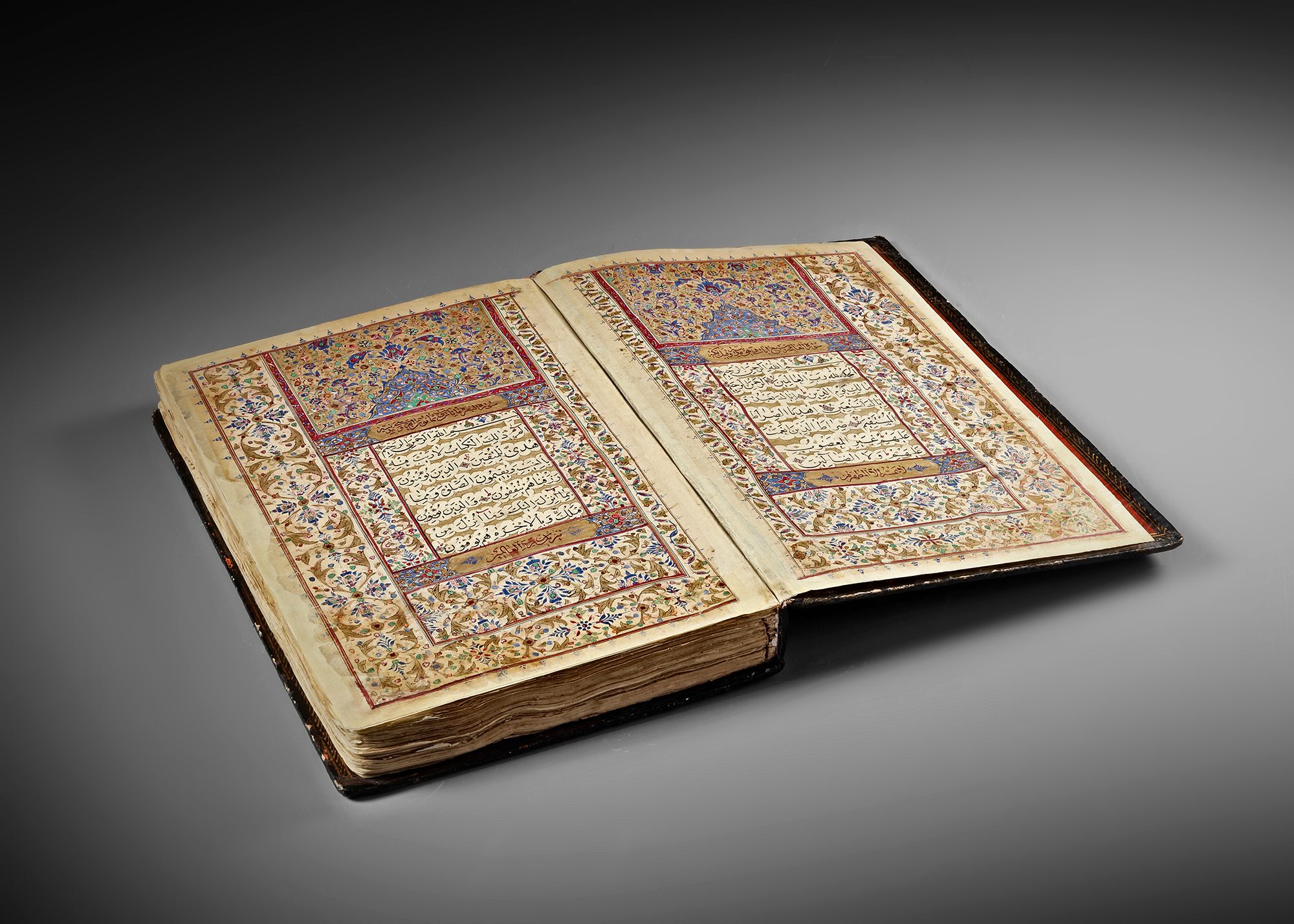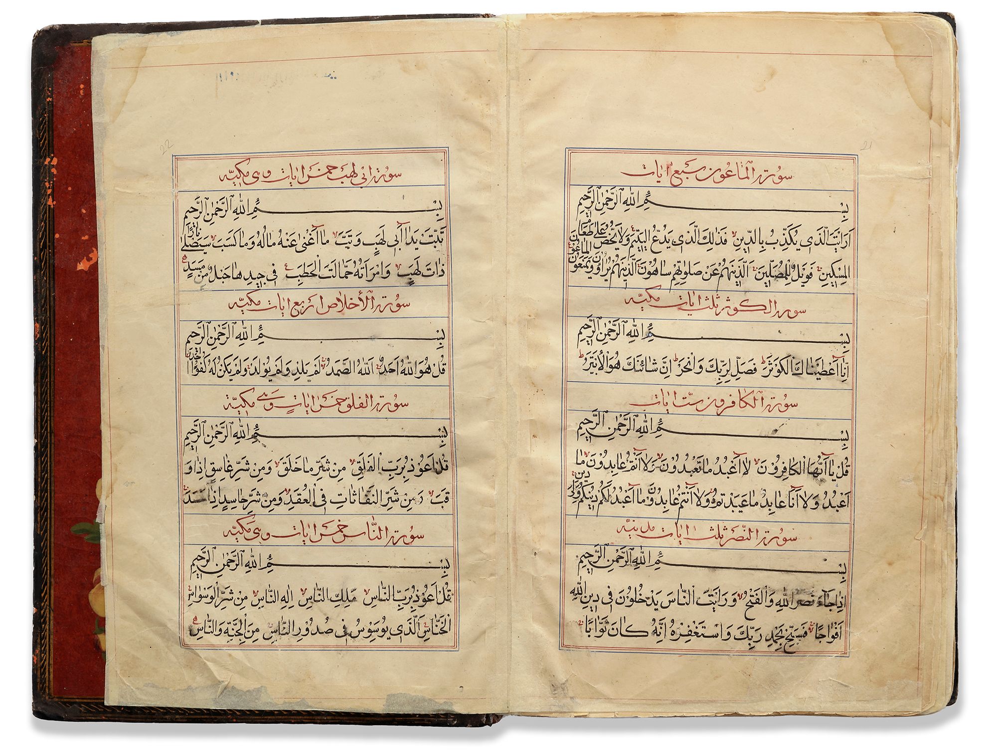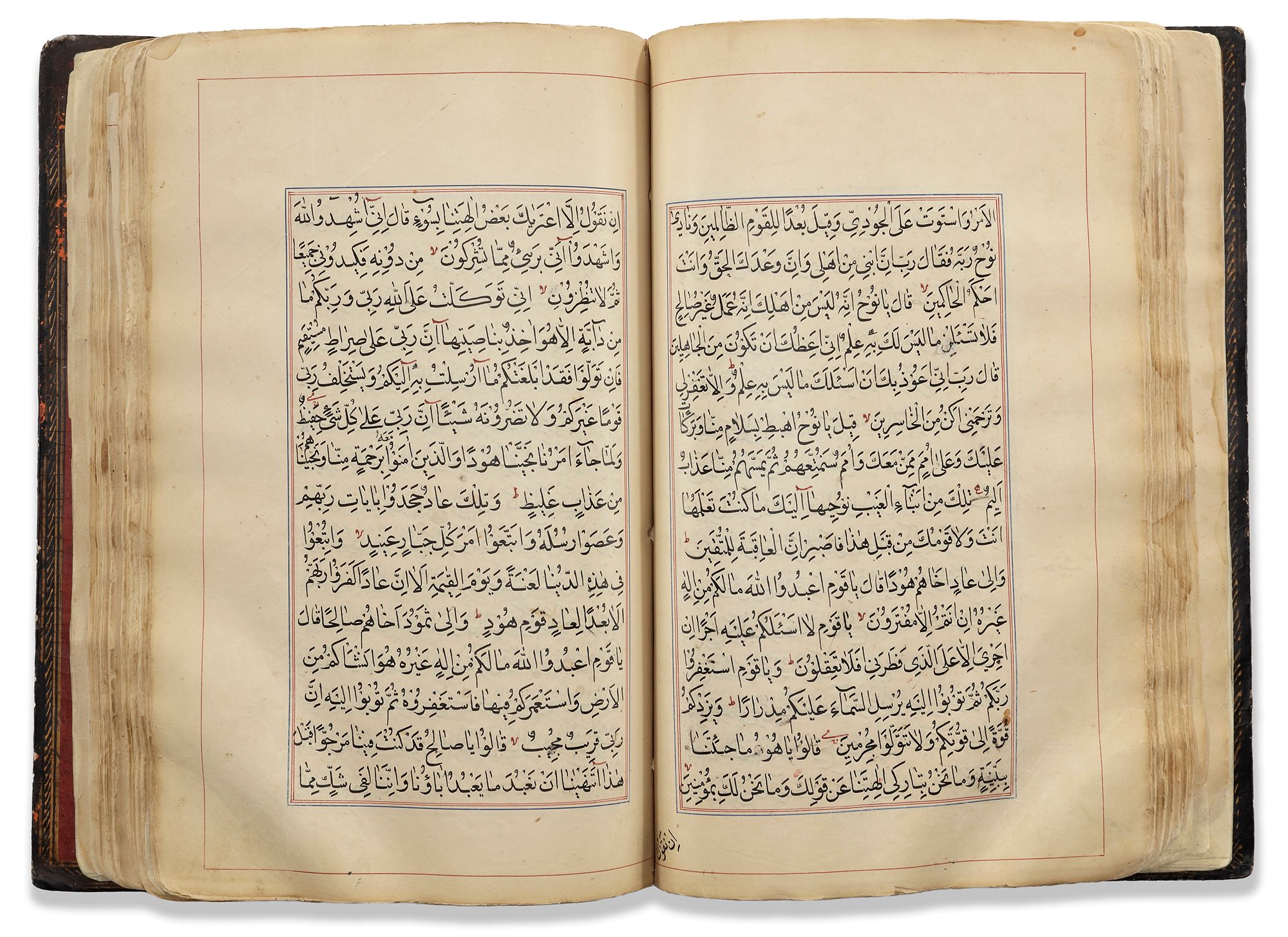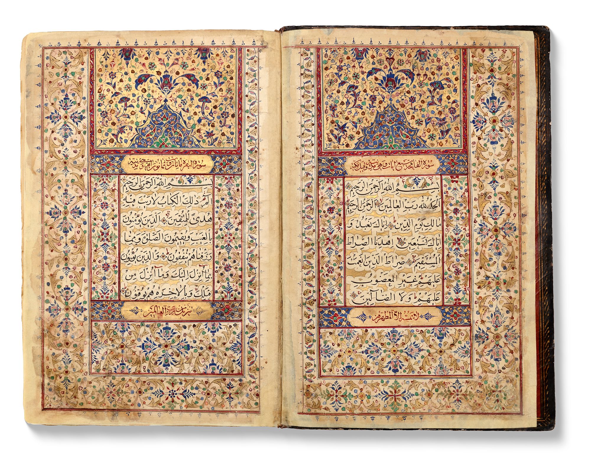 Arabic manuscript on paper, each folio with 15 lines of elegant black naskh script, diacritics and vowels in red, marginal occasional notes indicating 'Juz' and Hizb', text within red and blue rules, surah headings in thuluth red script, two opening bifolia fully illuminated in gold and polychrome decoration framing 7 lines of elegant naskh script in clouds reserved against a sprinkled ground.