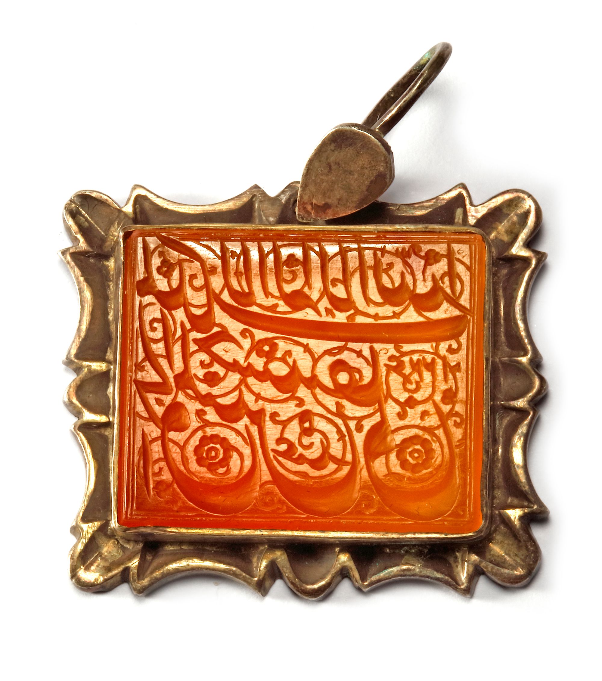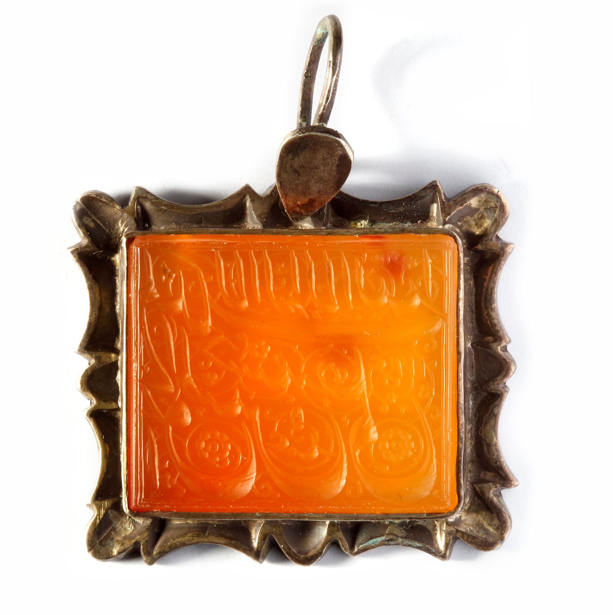 An agate pendant of square shape, set in silver mounting with a loop, engraved with the text " لا إله إلا الله الملك الحق المبين, There is no god but Allah, the King, the manifest truth" in nastali'q script .