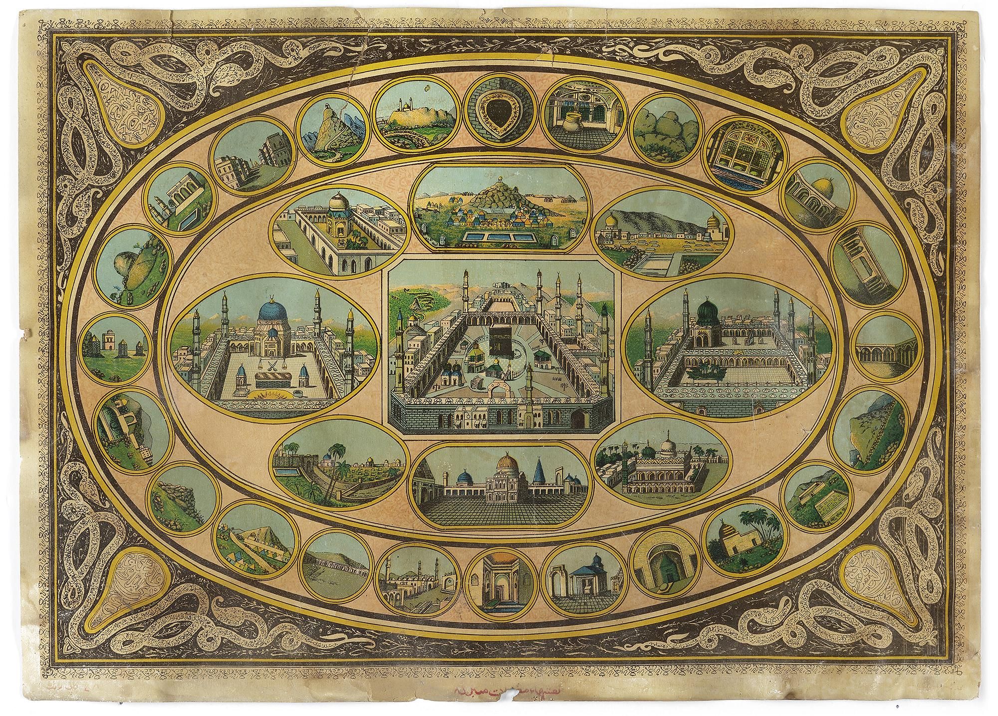 Ink and gouache on stout paper, the rectangular page, with main oval shape separated into various small oval panels depicting the sites of Mecca and Medina, the panels bordered with golden lines throughout. Background and inside the designs Ghubari scripts.