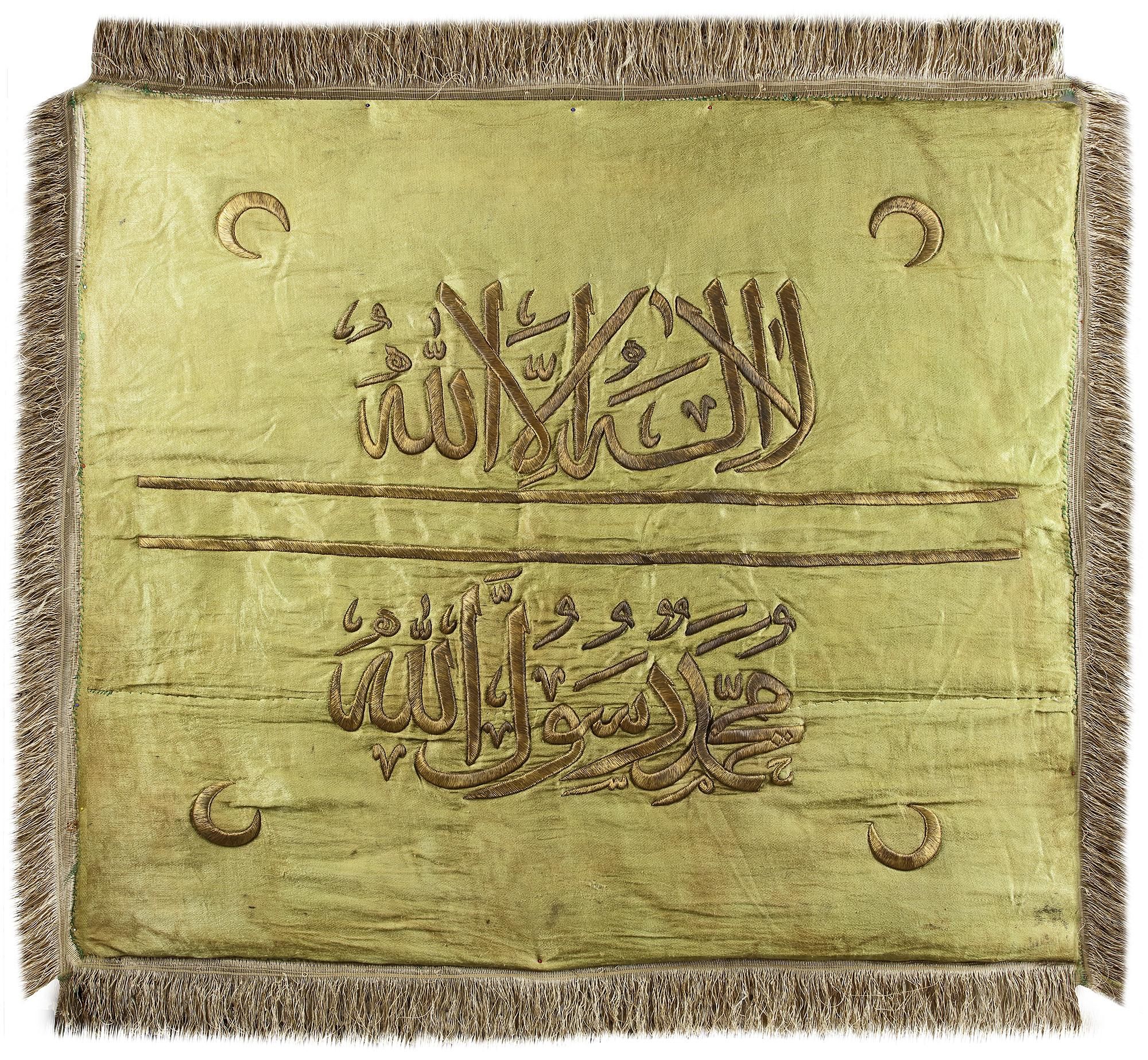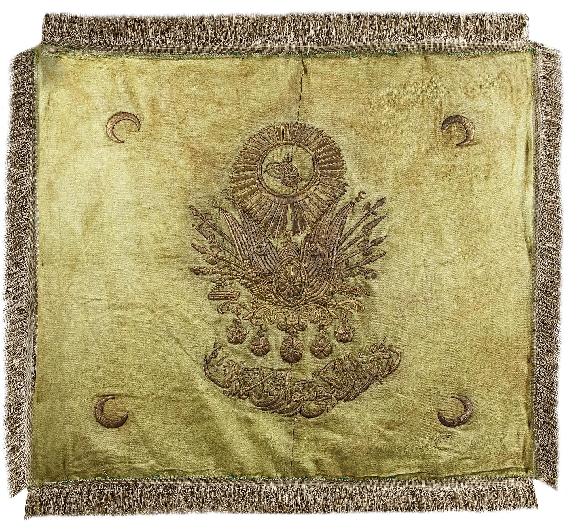 A Green velvet panel embroidered in gilt metal-threads with the coat of arms of the Ottoman Empire, the reverse side with Kalimaat Al-Tawhid in large thuluth script, both sides with four small crescents.