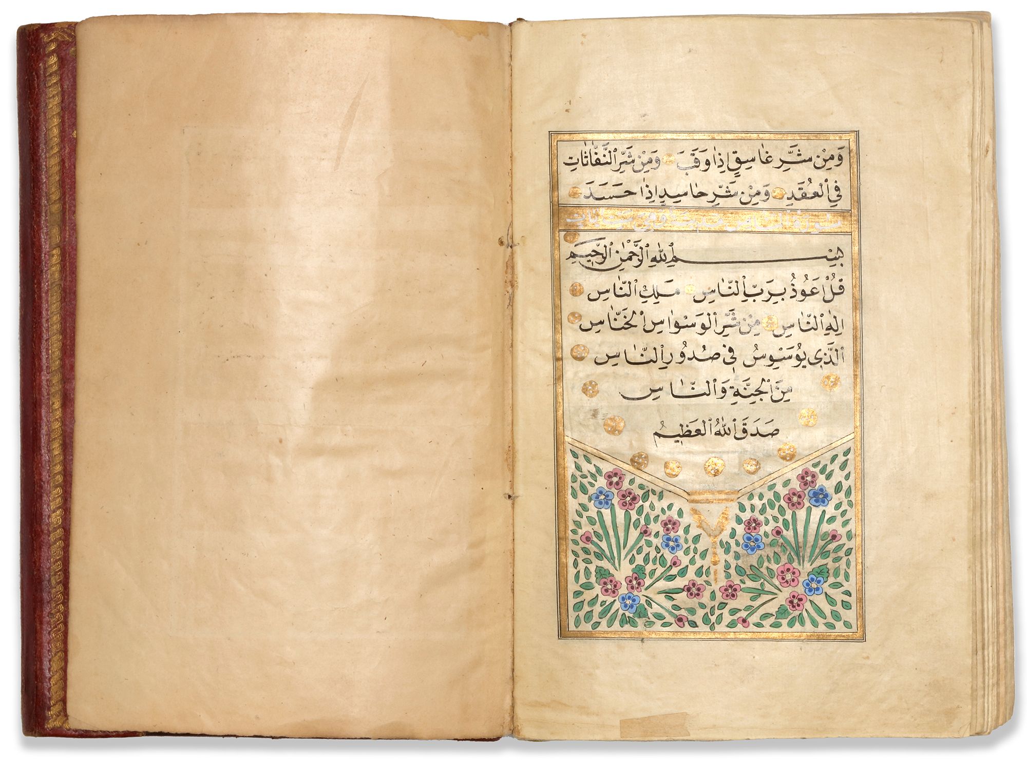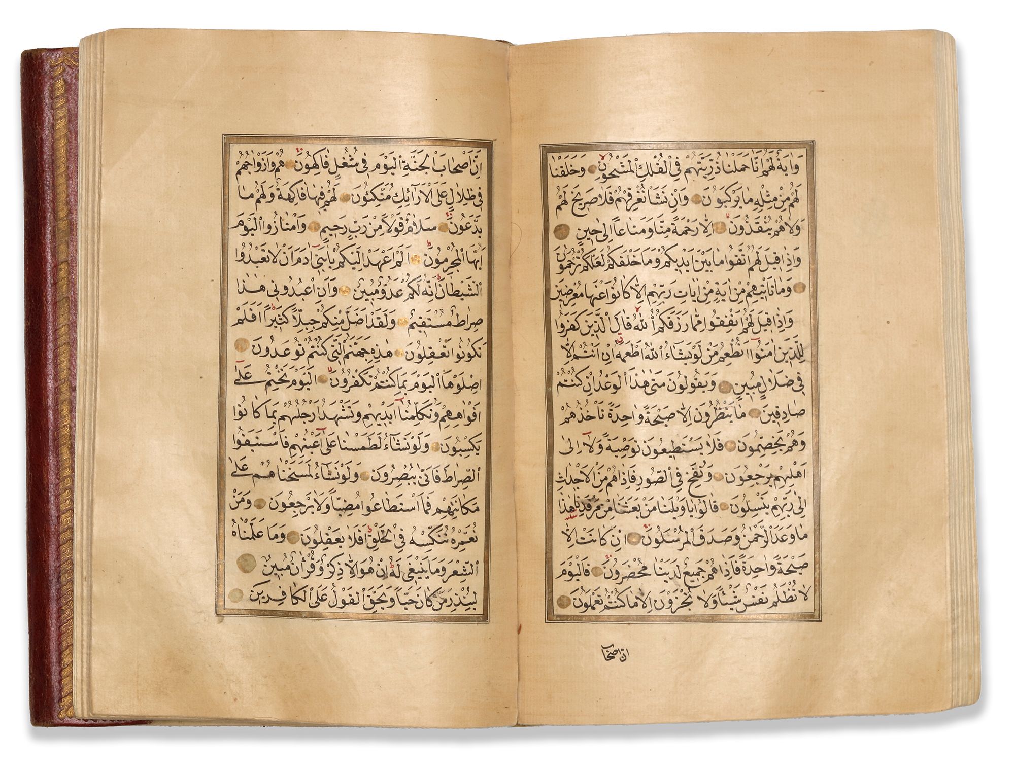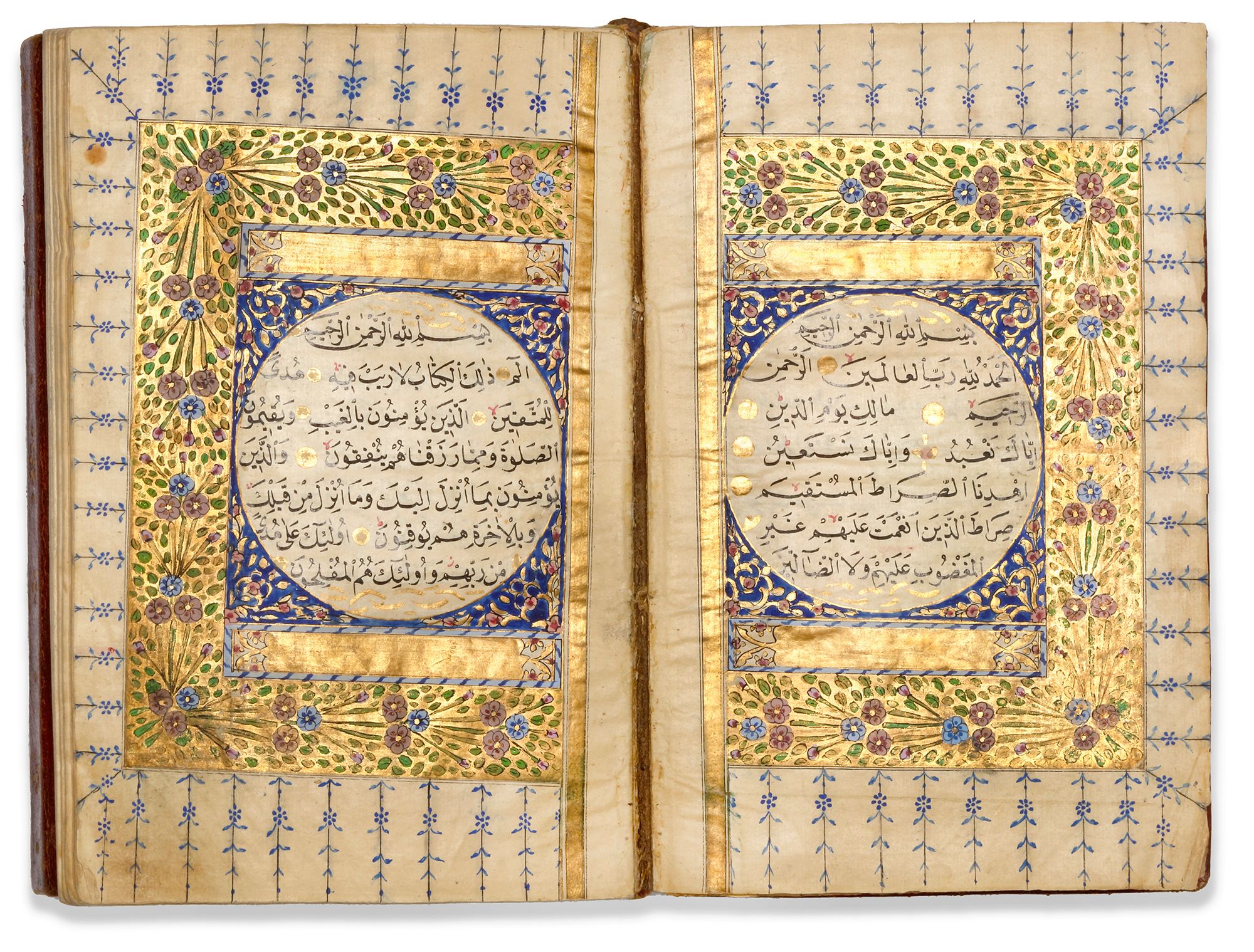 A complete Quran, Arabic manuscript on cream paper, each page with 15 lines written in black naskh script within gold and black rules, gold roundel verse markers. Surah headings in white thuluth script on a gilt ground, gold and polychrome marginal floral motifs. Two opening folio heavily with gilt and polychrome decoration framing 7ll. of black naskh script. Final folio with gilt and polychrome decoration.