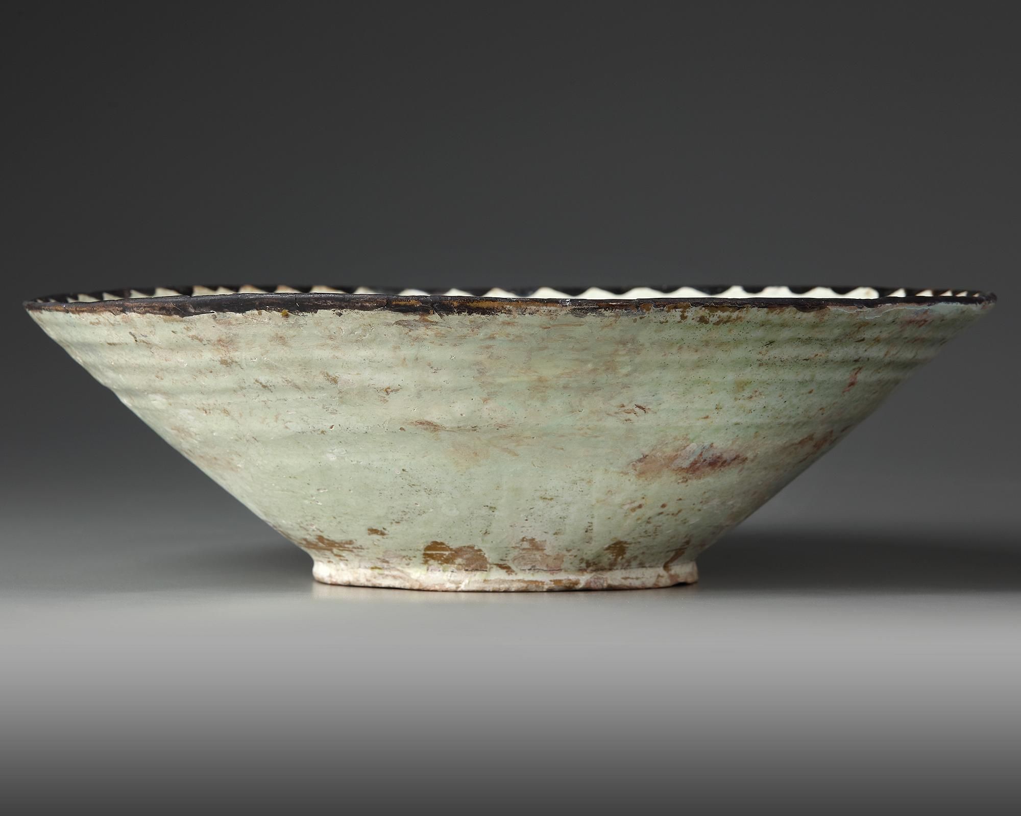 Standing on a flat foot with slightly slightly flaring sides, underglaze painted to interior in manganese on a cream ground with central rabbit, with scrolling band around interior rim.