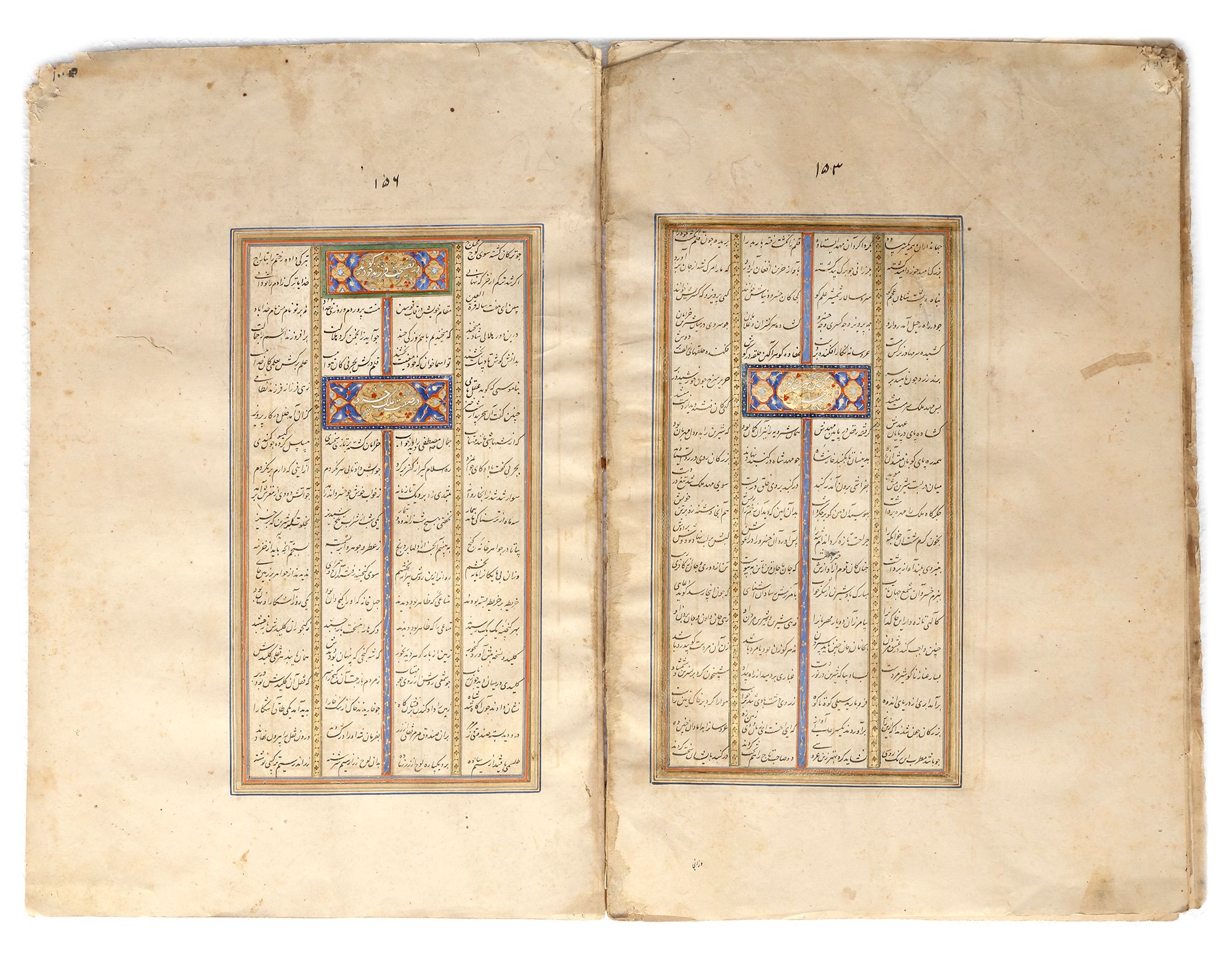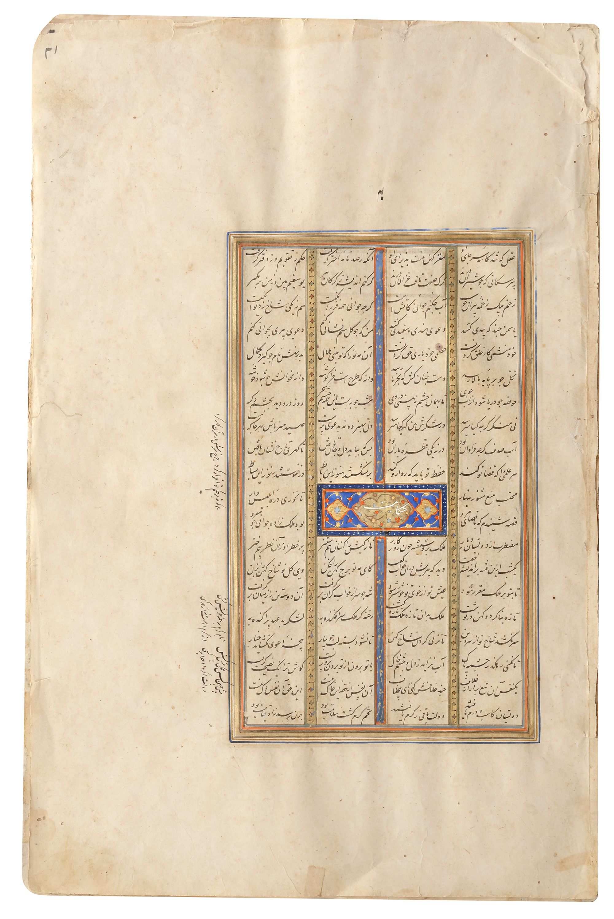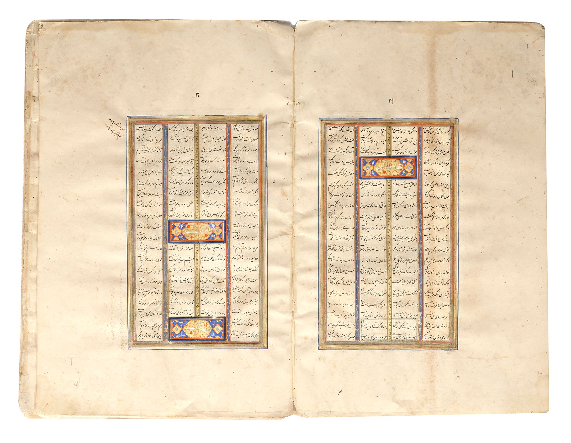 Persian manuscript on paper, 10 leaves with 20 lines to each page written horizontally in four columns of neat nastaliq script on paper, intercolumnar illumination throughout, chapter headings written in white nastaliq on illuminated panels, margins ruled in colors and gold several pages with small triangular panels of floral illumination amongst text. Text: 14 by 24 cm.