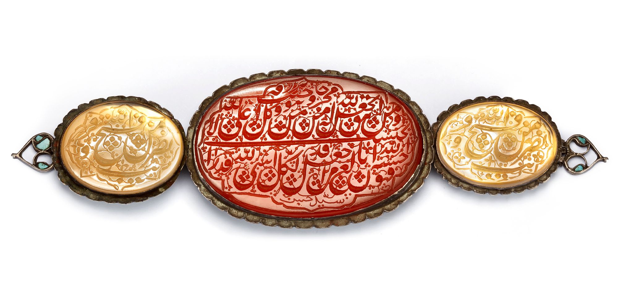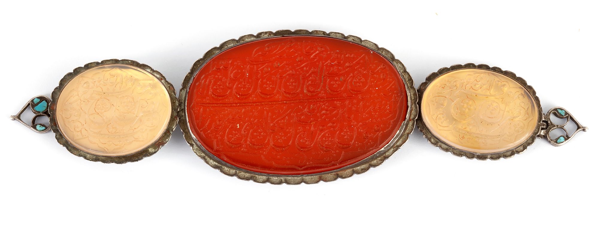 An agate seal of oval shape and engraved with the text" 3 سورة الطلاق الآية , v.3 from surah al-Tlaq" with two smaller oval agate stones engraved with the text " نصر من الله وفتح قريب, v.13 from surah al-Saff" alle set in a silver bazuband with small turquoise stones.
